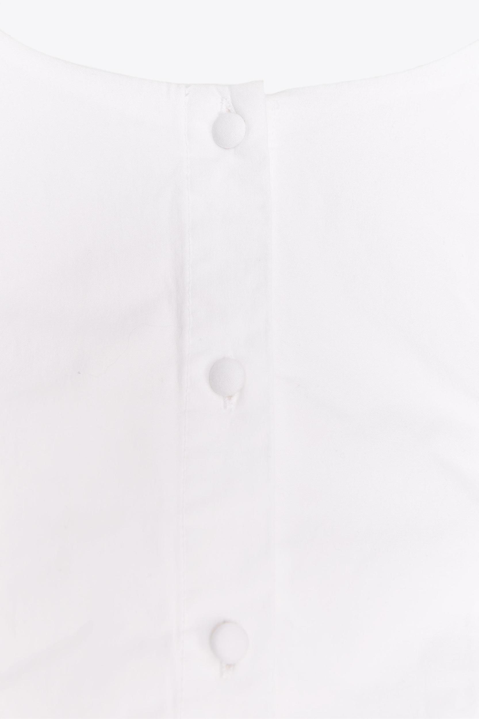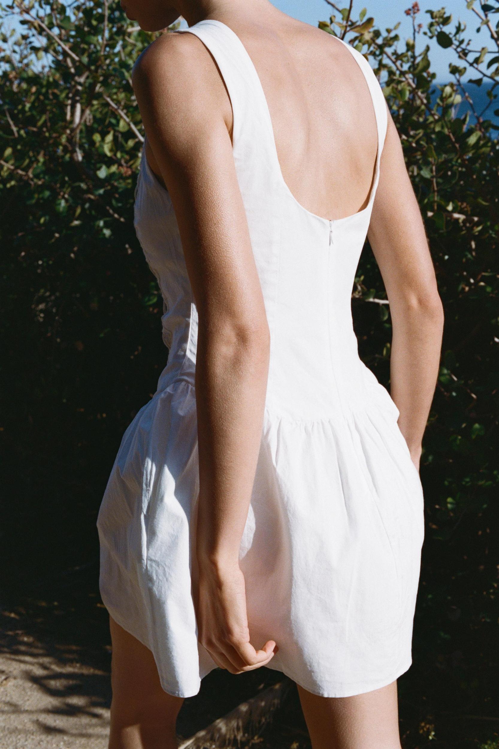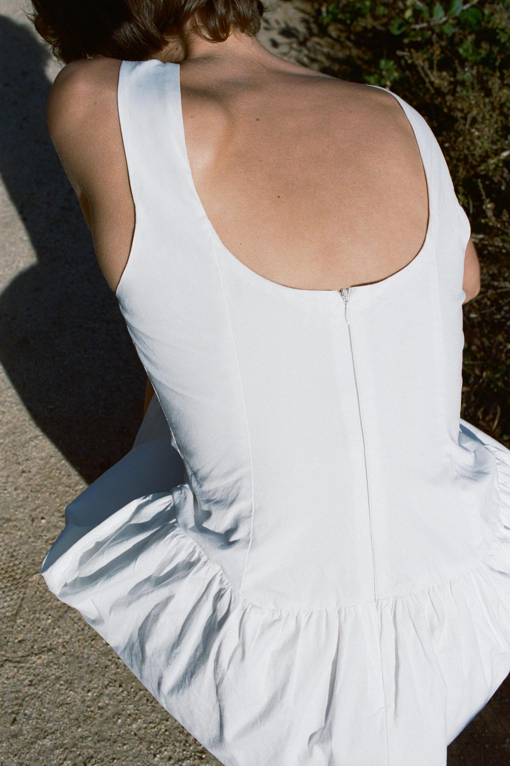 Short dress with round neck and sleeveless design. Hidden in-seam side pockets. Lace and ribbon detail at front and covered buttons. Lining. Back hidden in-seam zip closure.