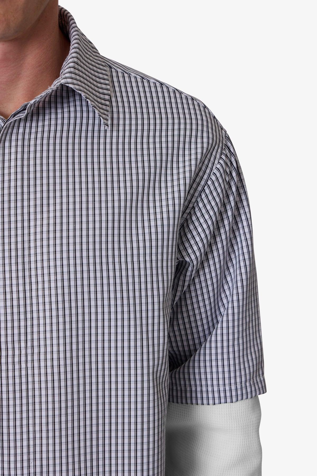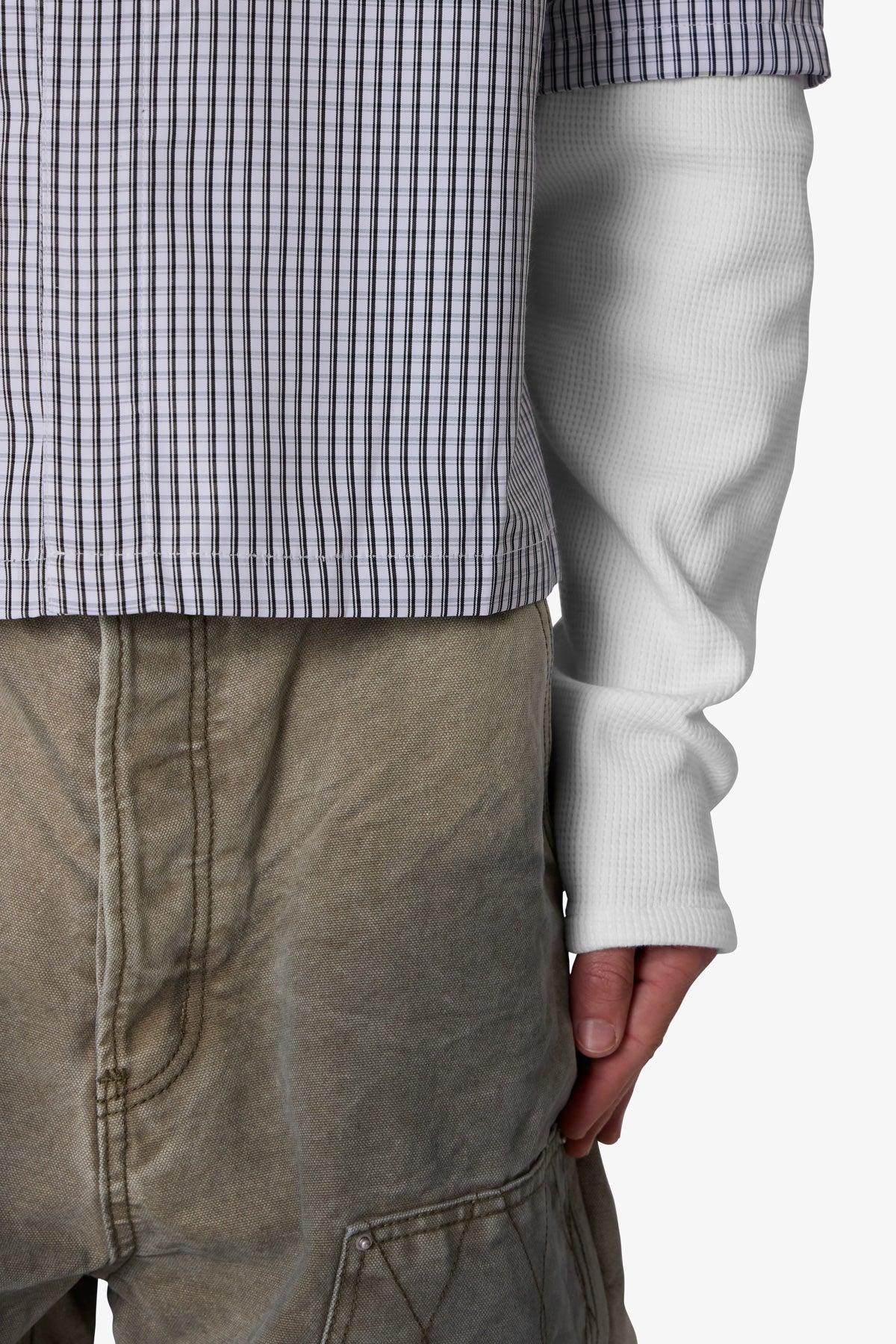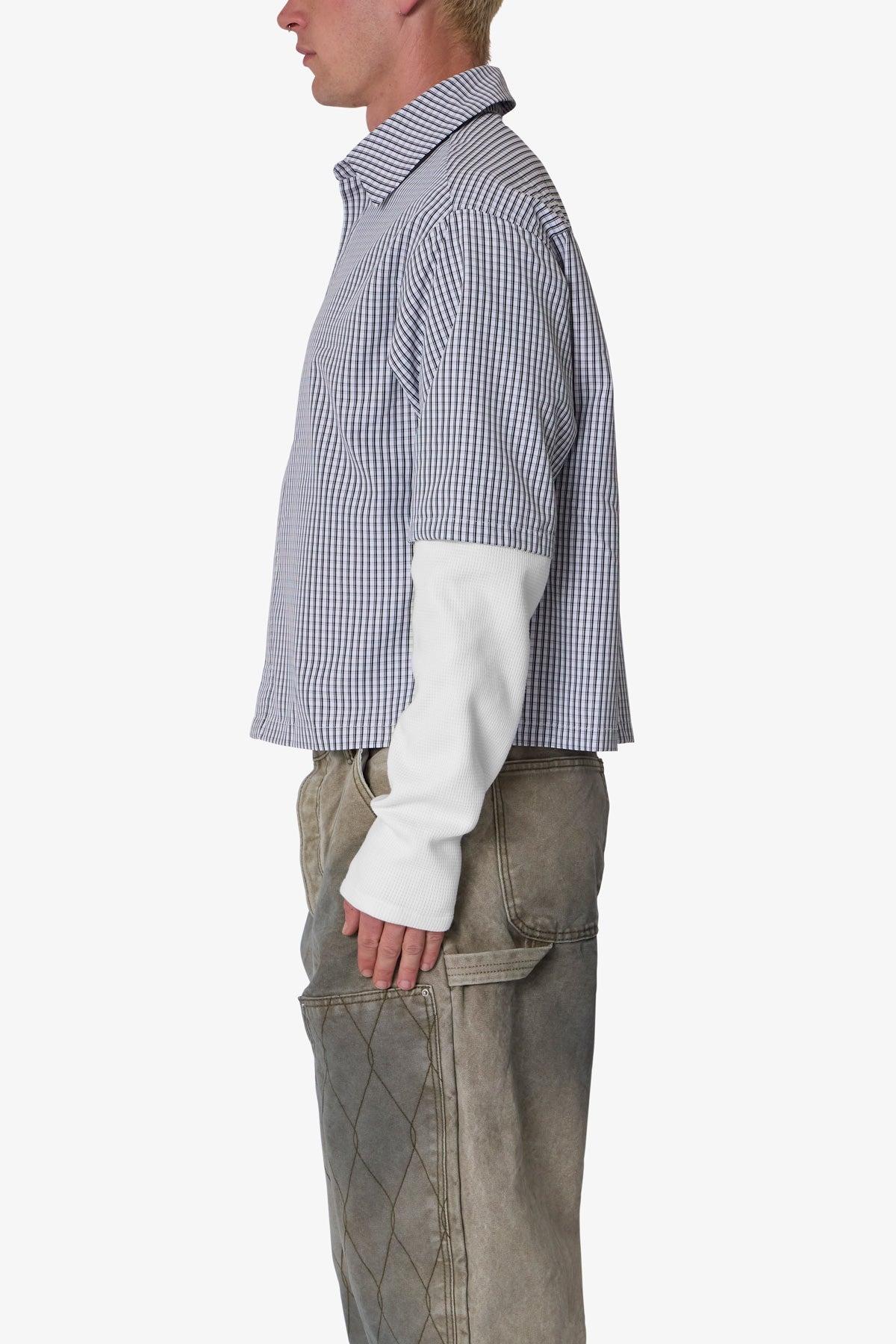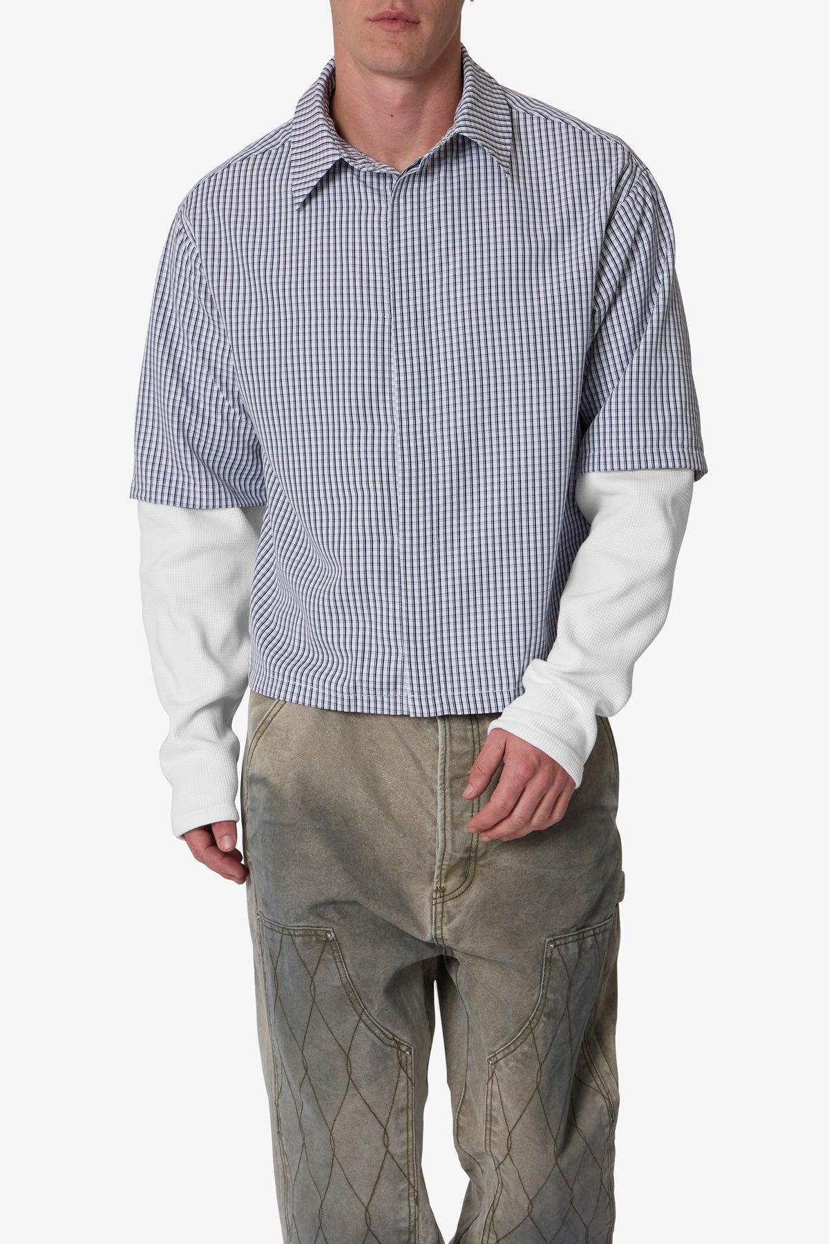 the Poplin Thermal Cropped Shirt is made from a synthetic fabric. The relaxed-fit shirt features a button placket, layered with both a short sleeve top layer and long sleeves from a thermal fabric with ribbing at the wrists, and is finished with a cropped fit. details relaxed fit 100% polyester model is 6’0, 140 lbs an