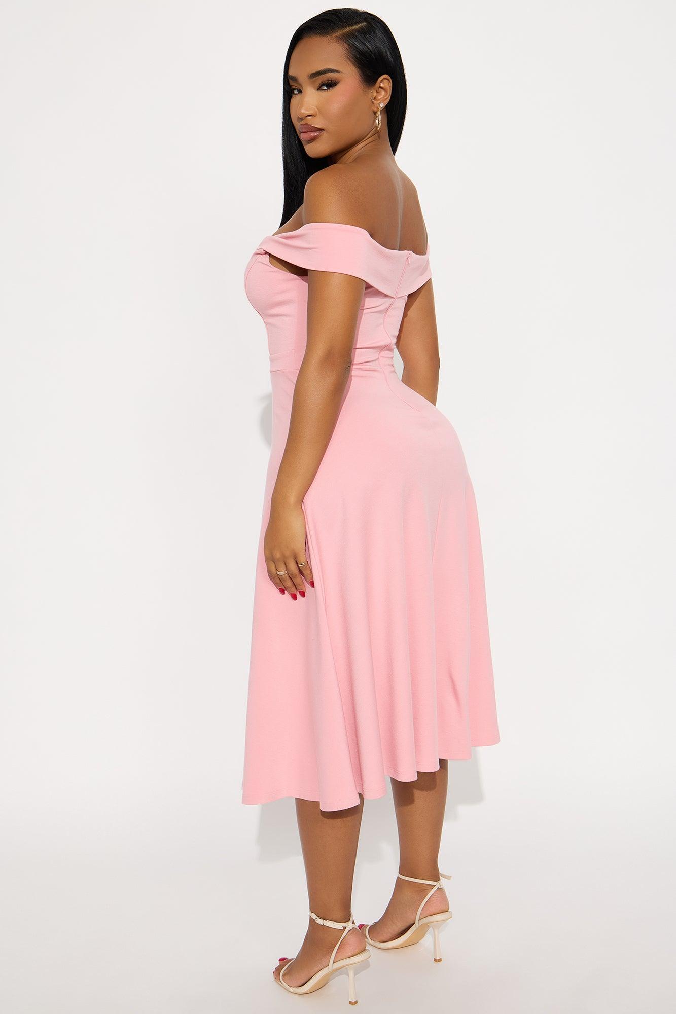 Available In Pink. Ponte Midi Dress Off Shoulder Short Sleeve Back Zipper Lined Length Measured Flat = 40" Self: 62% Viscose 33% Nylon 5% Spandex Lining: 100% Polyester Imported California Proposition 65WARNING: Cancer and Reproductive Harm - www.P65Warnings.ca.gov.