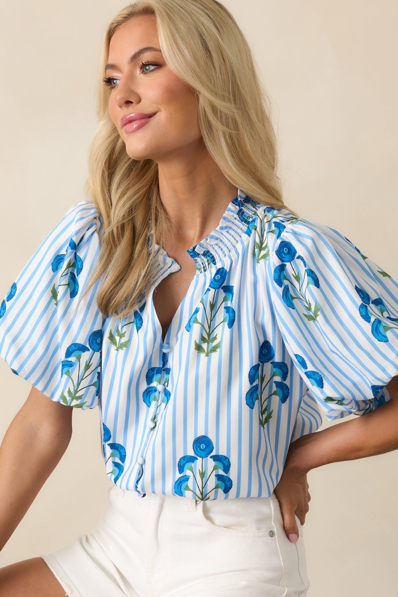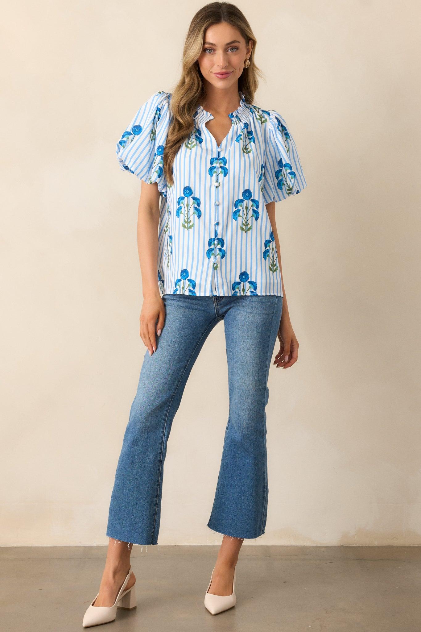 The Poppy Fields Blue Button Front Puff Sleeve Top is a charming choice for adding a touch of effortless style to your look. It's perfect for those moments when you want to feel relaxed yet stylish. This blue blouse features a notch ruffled v-neckline, functional button front design, poppy flower print, relaxed fit, short and puff sleeves. 100% Polyester Lining: 100% Rayon Hand Wash Cold Manufactured in China Designed in The USA Model is Wearing a Size Small