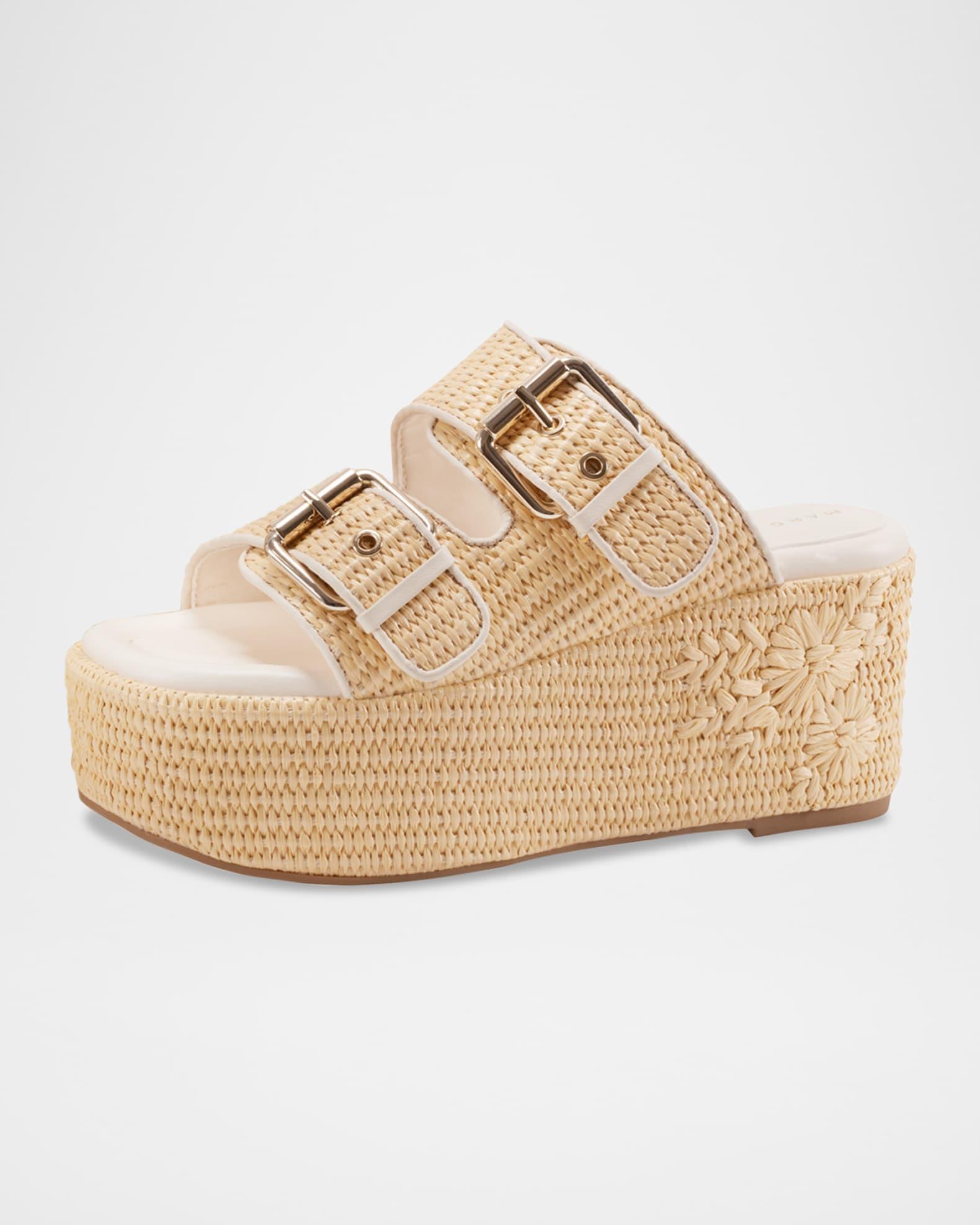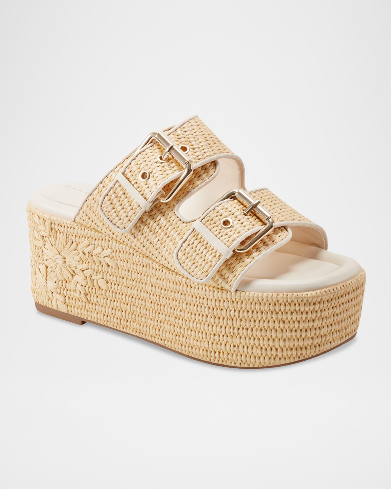 Marc Fisher LTD woven raffia and nylon platform sandals with leather piping and embroidered flower detailing 2.36 in / 60 mm wedge heel; 2.25 in / 55 mm platform Open toe Dual buckle strap upper Slide style Padded footbed Manmade outsole Lining: Synthetic Spot clean Imported Shipping Direct from Vendor, usually ships within 45 business days.