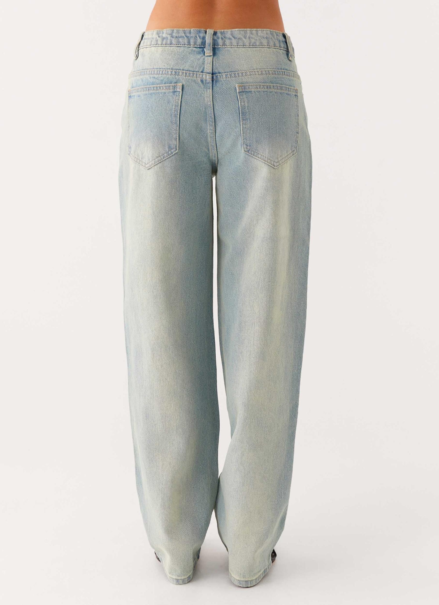 Peppermayo Exclusive The Poppy Low Rise Jeans are the perfect blend of comfort and cool. With a low-rise fit and a relaxed, baggy silhouette, they offer effortless style with a laid-back vibe. The front button zip adds a vintage touch, making these jeans a must-have for casual nights or daytime adventures. - Low rise- Front button and zipper- Baggy fit- Belt loops- Front twin slanted pockets- Back twin patch pockets- (100% Cotton) Size AU 8 / US 4 garment measurements: Waist: 76 cm / 29.9 in.Hip: 101 cm / 39.8 in.Leg opening: 21.5 cm / 8.5 in.Front rise: 24 cm / 9.4 in.Back rise: 34 cm / 13.4 in.Outer leg length: 107 cm / 42.1 in. Roberta is 177cm and wears size AU 6 / size US 2