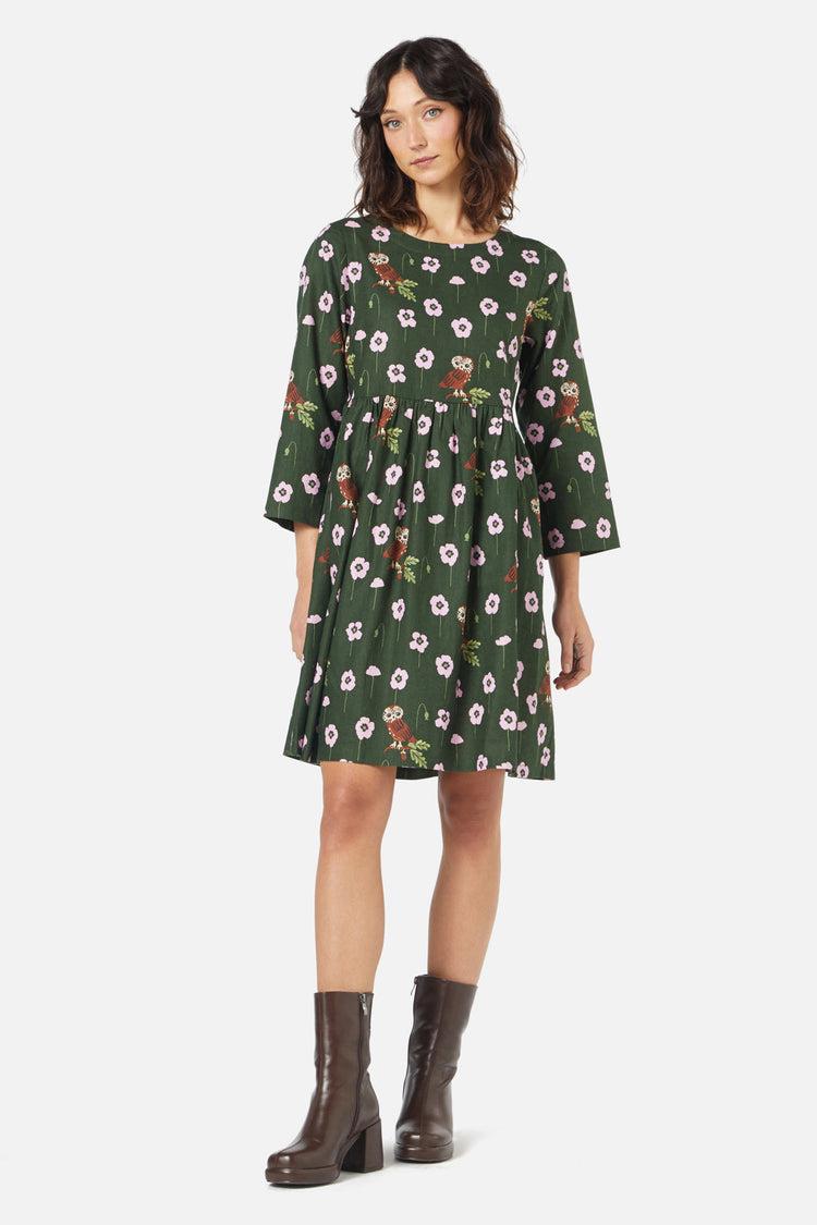 Unleash your inner night owl with the whimsically designed Poppy Owl Mini Dress, where sophistication meets playful charm. This owl-printed smock dress flies high with its easy-fit bodice and a neckline rounded just so, ensuring comfort without sacrificing an ounce of style. The 3/4 length sleeves whisper elegance, while the gathered full skirt—complete with pockets—is a nod to functionality dressed in finesse. With side ties that cinch at the waist, create a silhouette that's as unique as your own spirit. Falling gracefully to the knee, this piece is the epitome of effortless chic. Crafted from a blissful blend of linen and cotton, it promises to keep you cool as you dance under the moon or bask under the sun. Step into the Poppy Owl Mini Dress and let every day feel like a whimsical adventure.55% LINEN 45% COTTONCold delicate machine washWash garment inside outWash with like colorsDo not wring or spinDo not bleach or soakDo not tumble dryLine dry in shadeWarm iron on reverse if requiredDo not dry clean