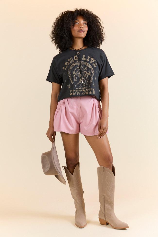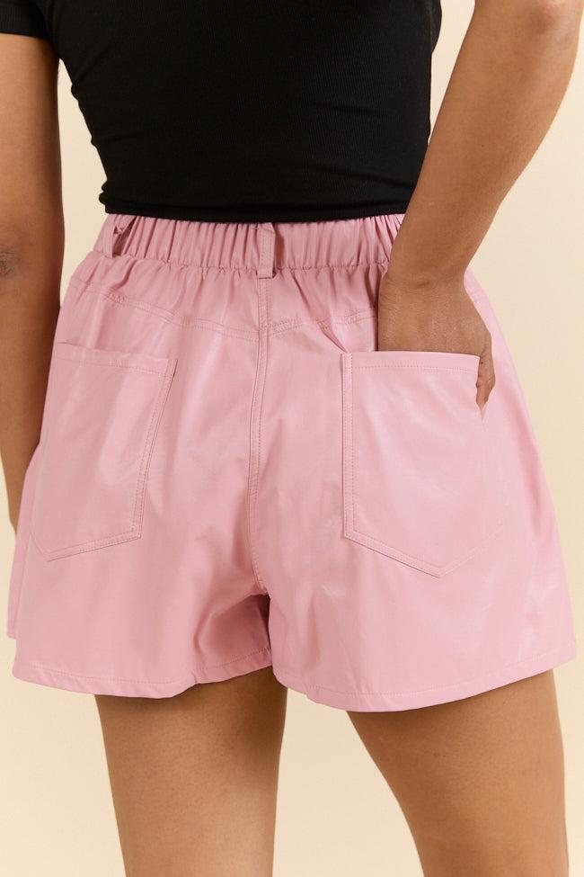 Details Dusty Pink Faux Leather Short Fabric has no stretch Zipper/ clasp closure, functional pockets, elastic back waistband Unlined Size small inseam: 2.5" Material and Care Shell: 50% polyester 50% polyurethane lining: 100% rayon Hand wash cold, dry flat Patterns may vary Materials may have natural variations Colors may vary from different viewing devices.