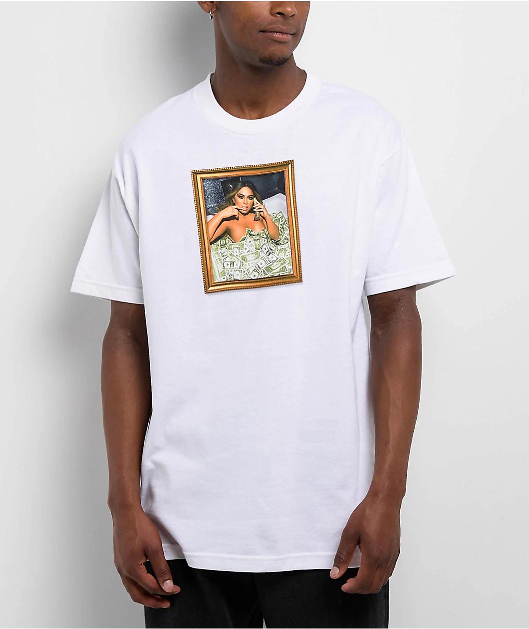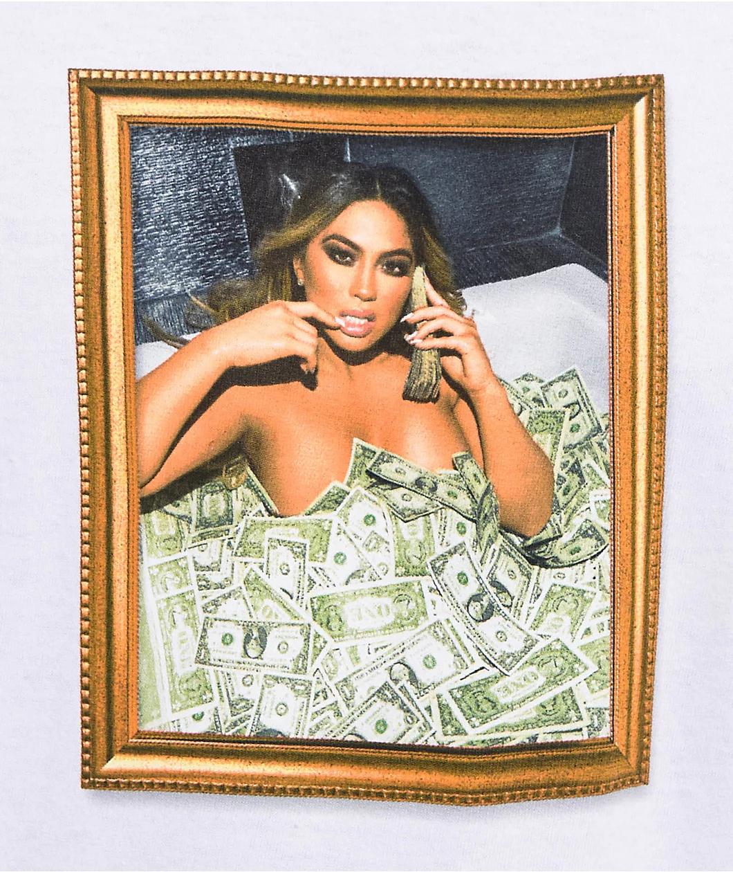 The minds at Popular Demand welcome the Cash Frame t-shirt in a sleek white colorway. Printed on the front of the tee is a gold Framed picture of a woman lying in a tub filled with Cash while holding a stack up to her ear for a lavish vibe. Made with