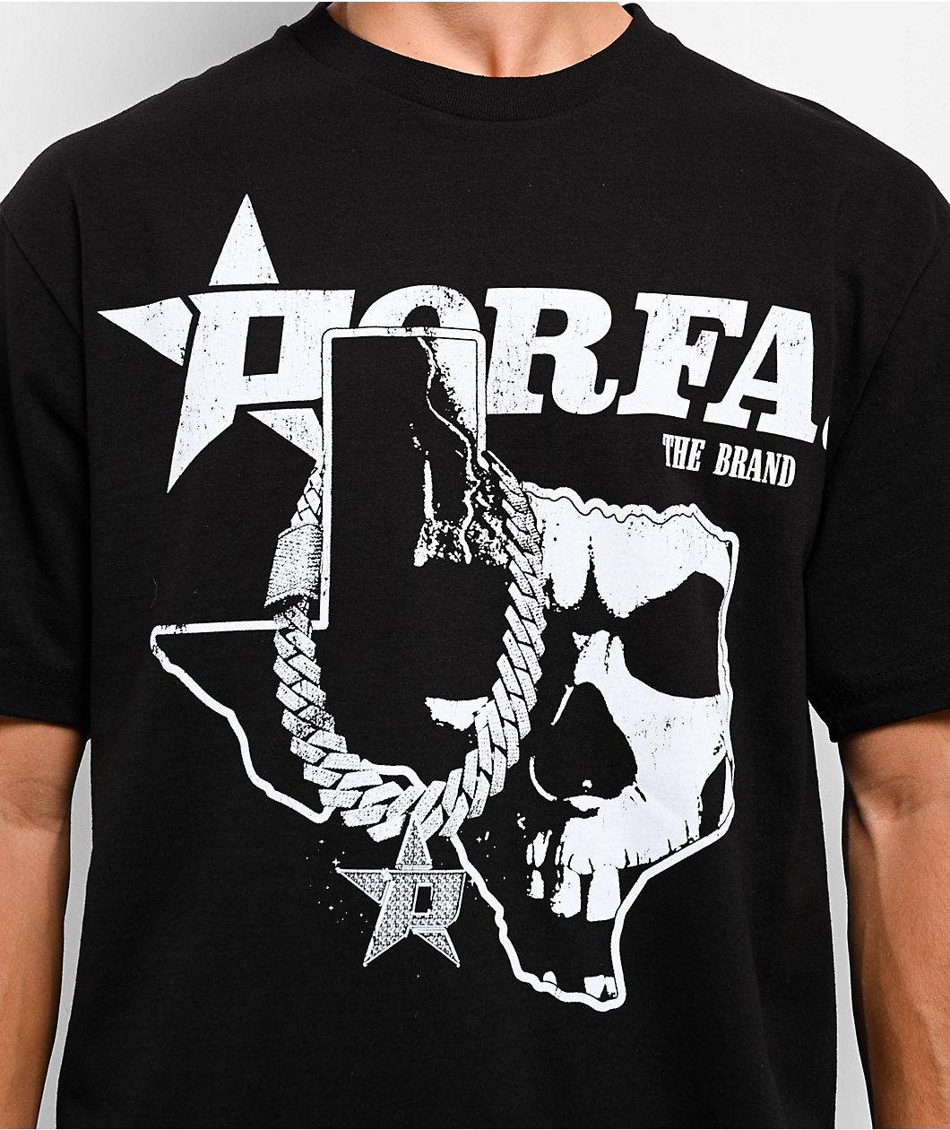 Latinx streetwear label Porfa presents the Texas Chain t-shirt in a sleek black colorway. Delivering an edgy vibe, the graphic tee showcases a silhouette of the state of Texas filled in with a skull and a shiny chain placed on the top for a luxe look