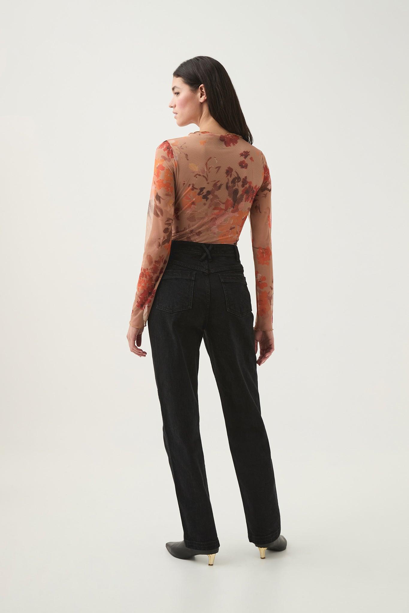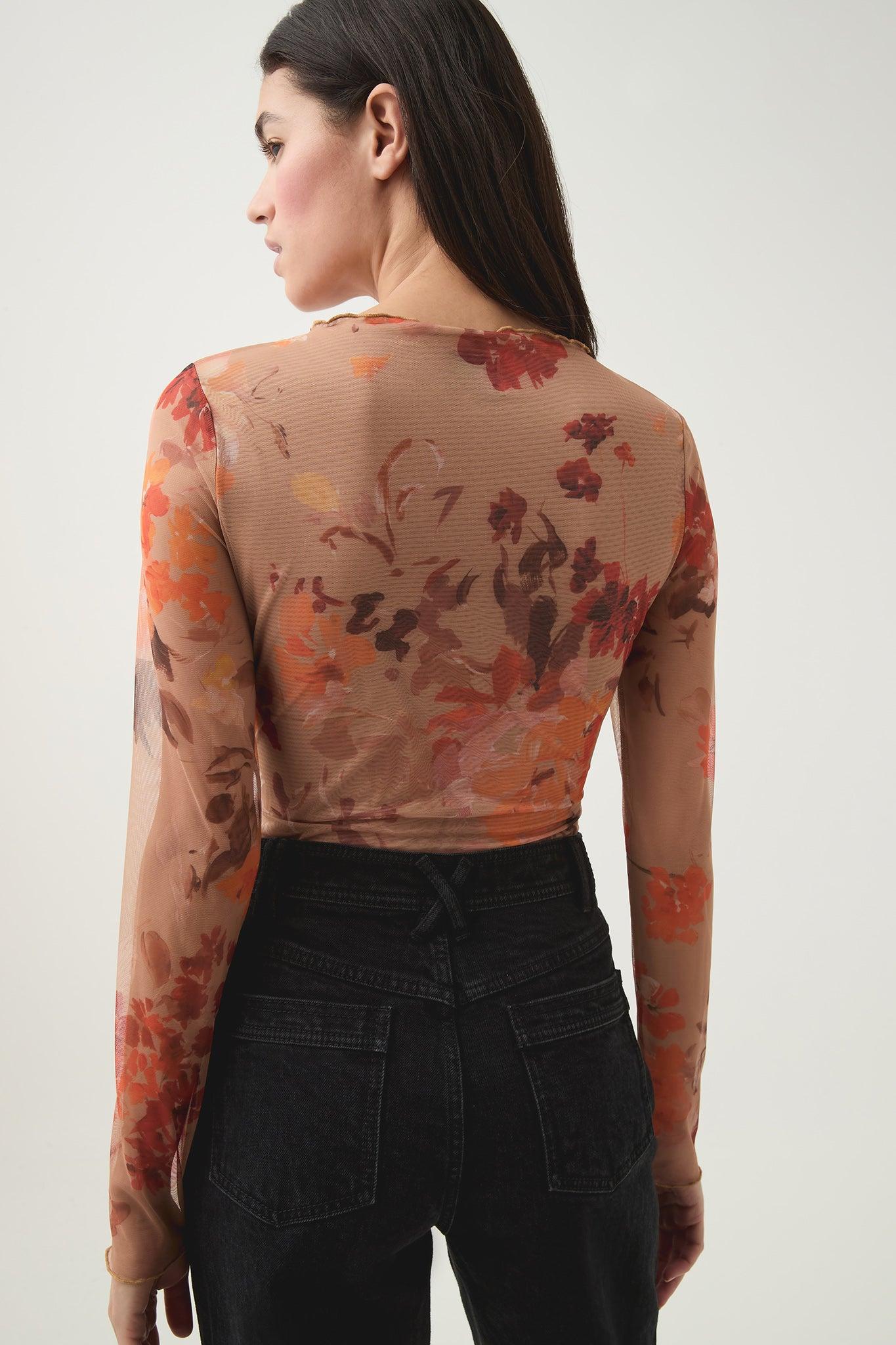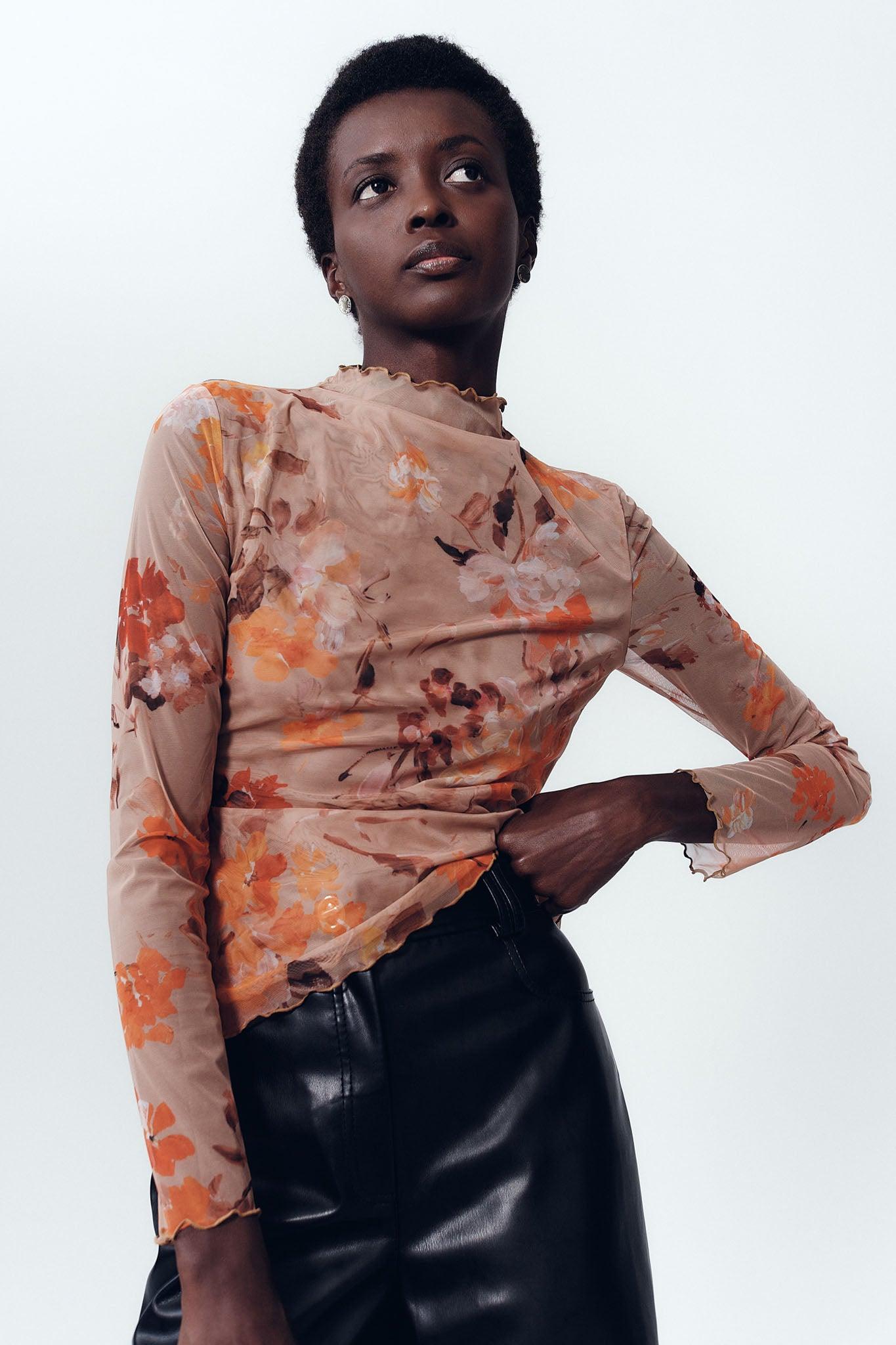 PRODUCT DETAILS Women’s top Semi-sheer Mock neckline Full-length sleeves Shop All Tops SIZE AND FIT We recommend sizing down for a fitted finish Model wears a size 8/S Model: 177cm/ 5'10 Bust: 80cm Waist: 58cm Hips: 88cm FABRICATION 95% Polyester 5% Spandex