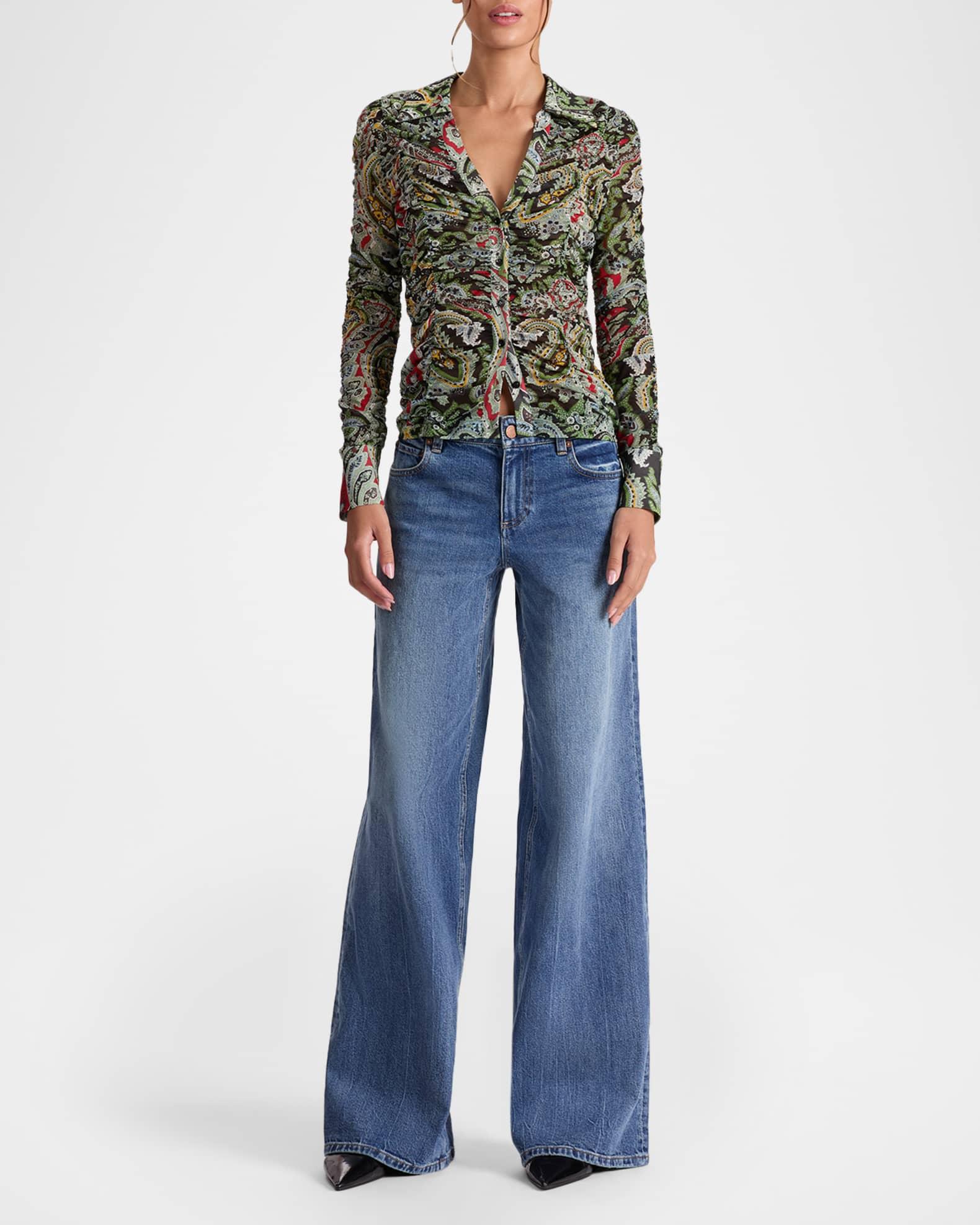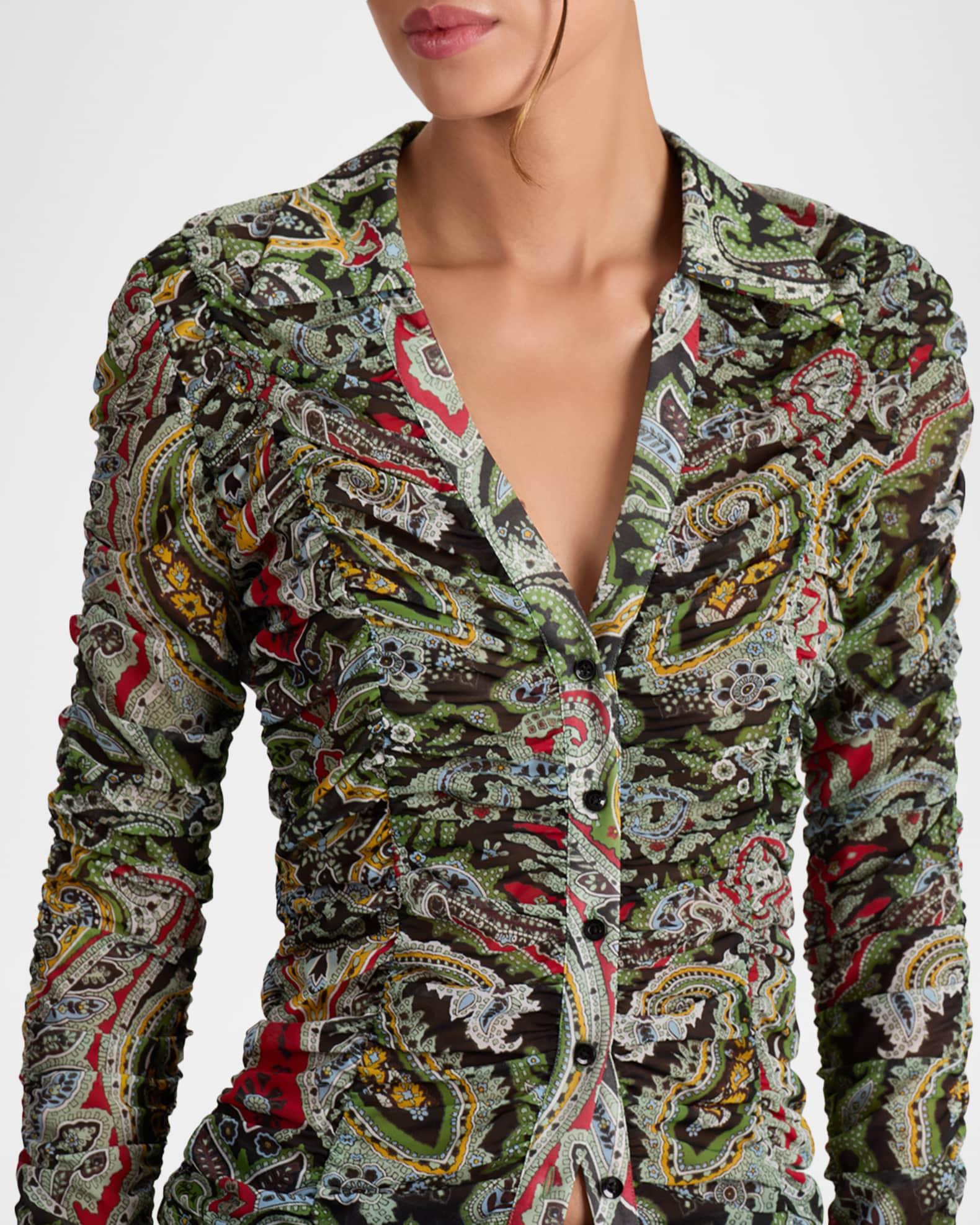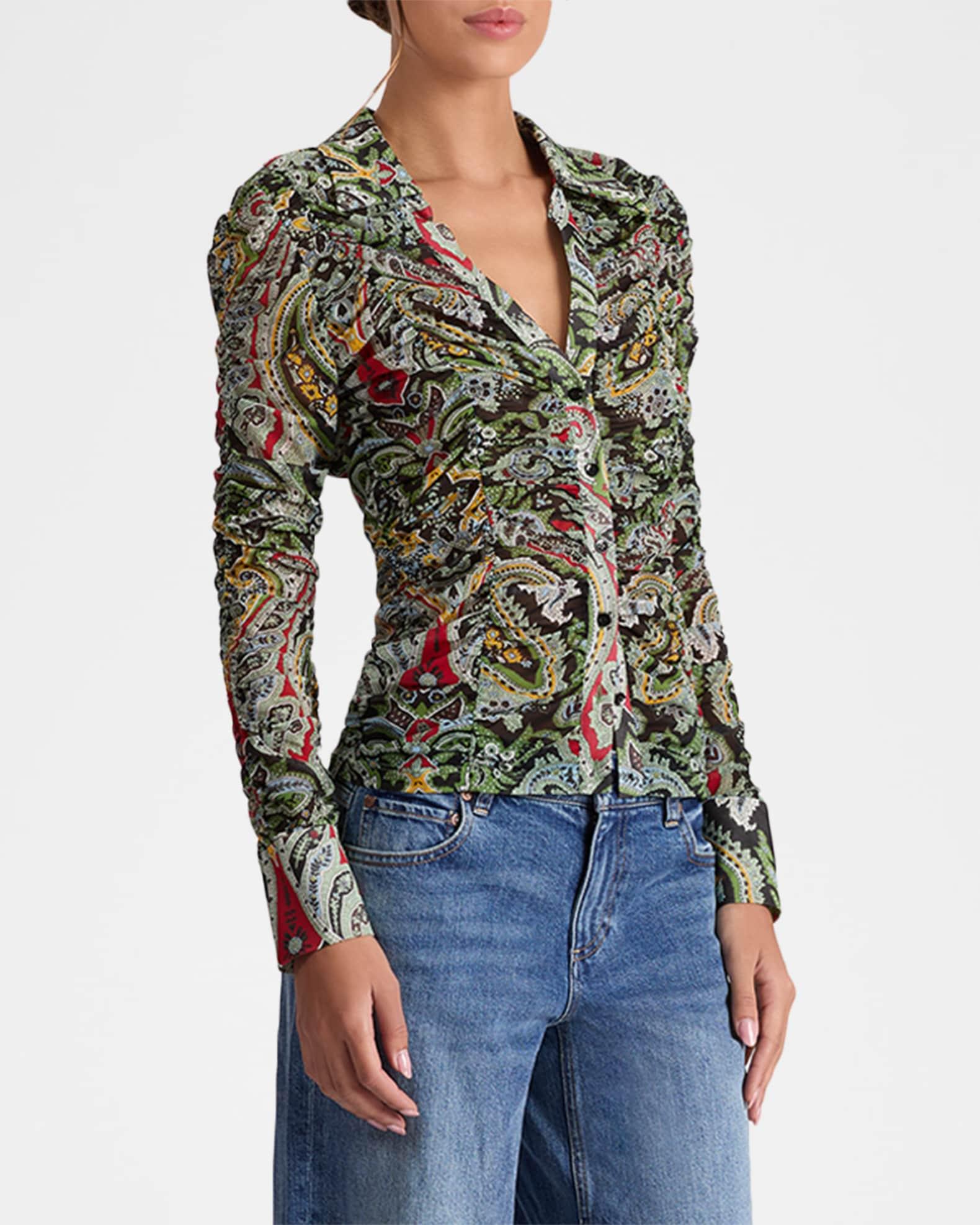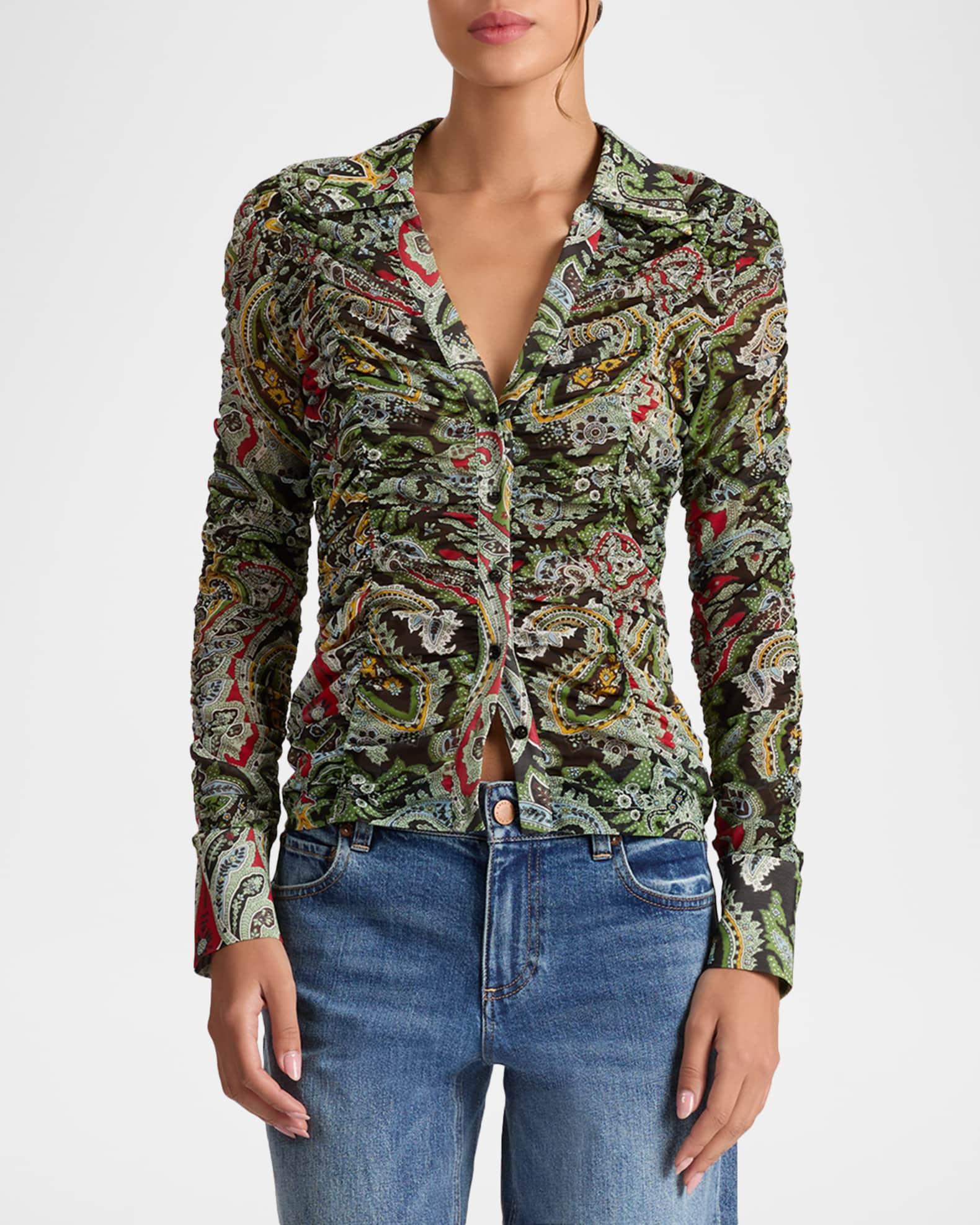 Constructed of flattering ruched mesh, the Portia blouse by Alice + Olivia is illustrated with a bold paisley print Approx. 23"L from shoulder to hem Collared V neckline; button front Long sleeves; button cuffs Slim fit Hip length Polyester/elastane Dry clean Imported