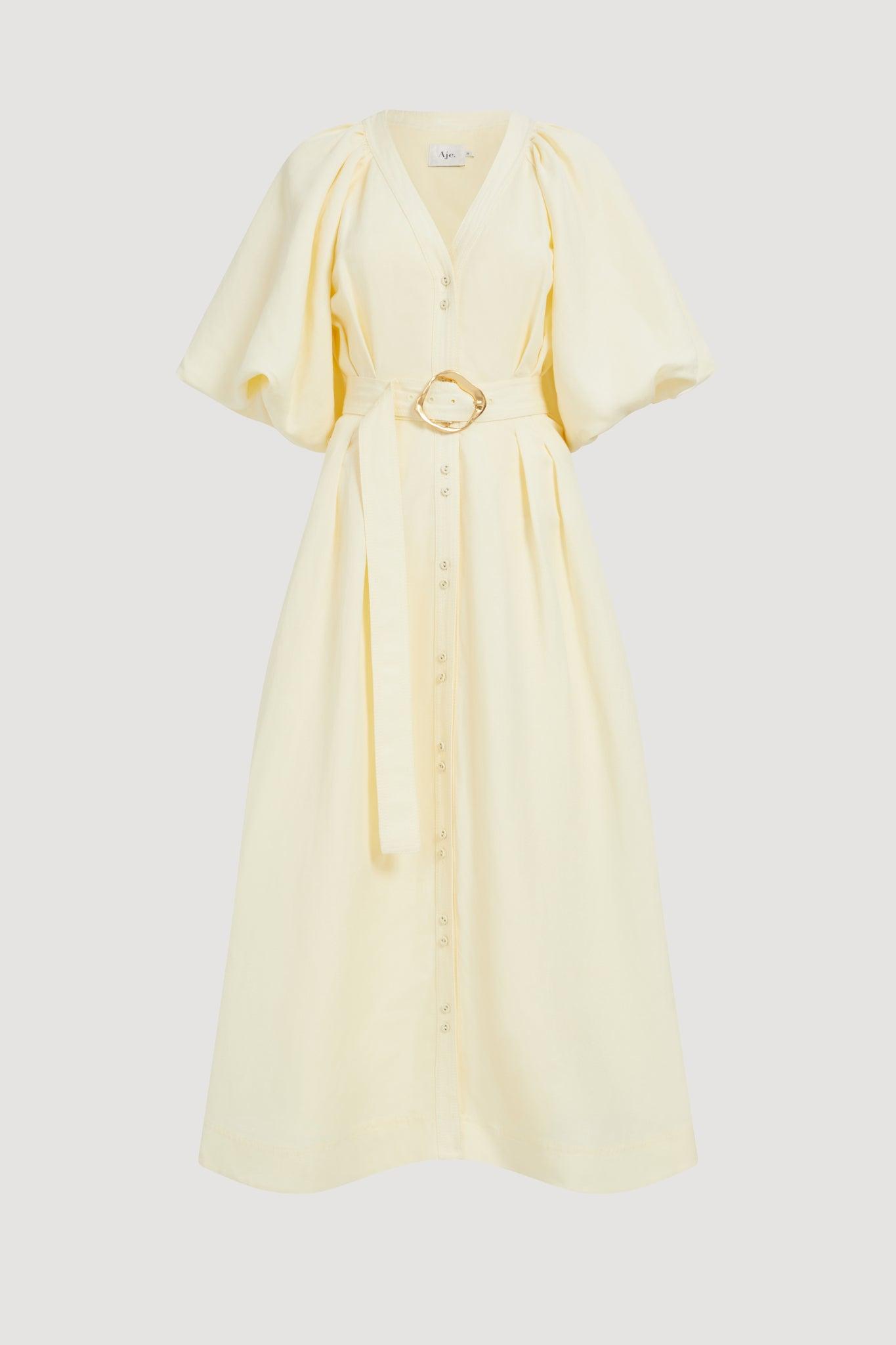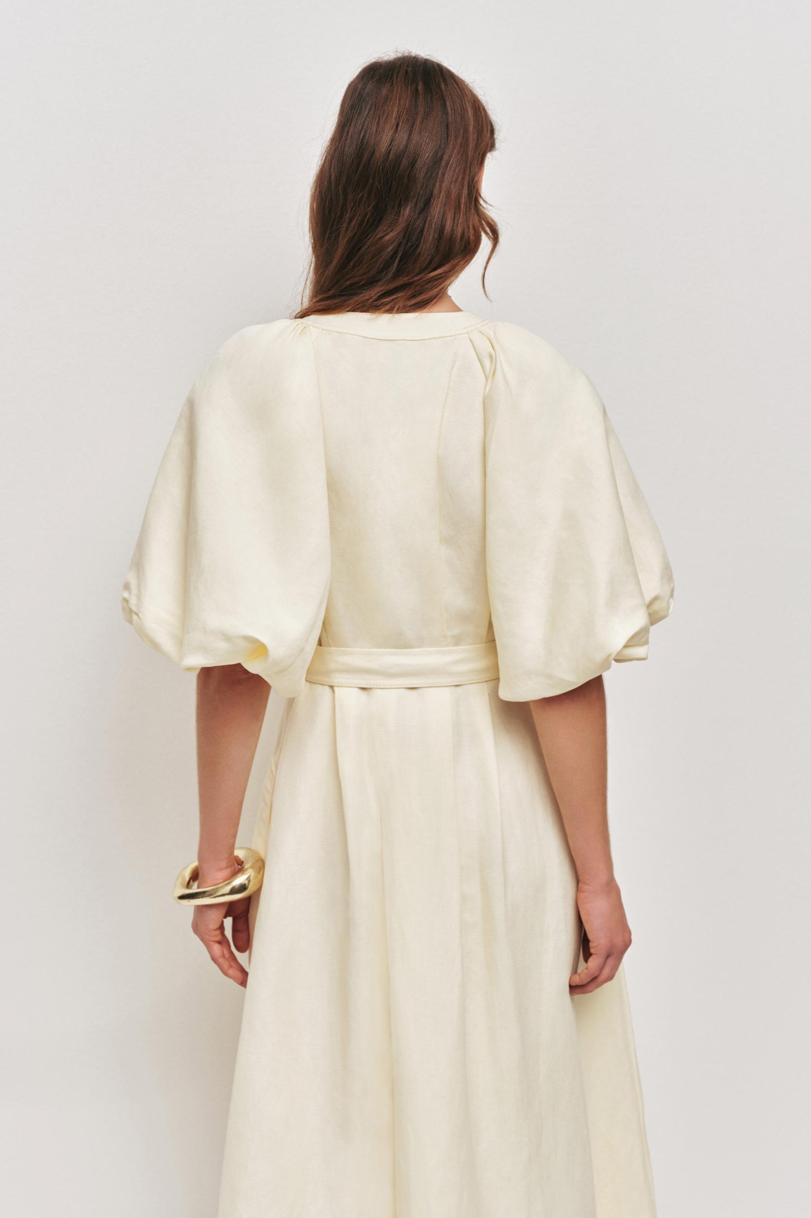 PRODUCT DETAILS Women's midi dress V-neckline Centre front placket with twin button detail Puff sleeves Side seam pockets Detachable belt with organic ring buckle Lined style 55% Linen, 45% Rayon Shop All Dresses SIZE AND FIT Model wears a size AU 8/S