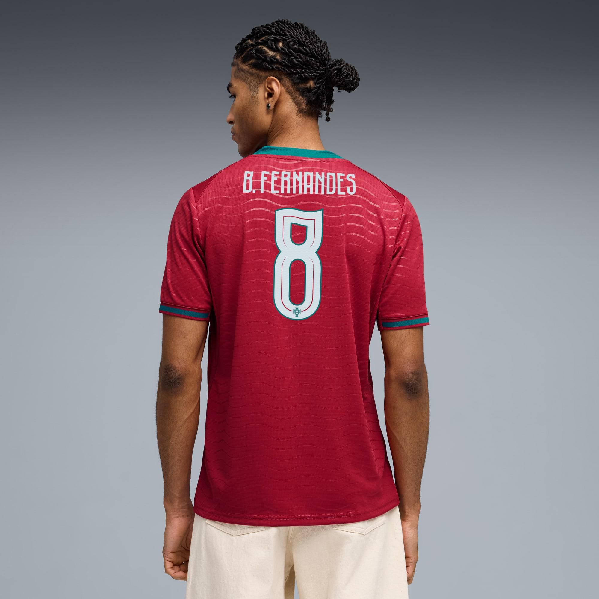 descriptionEach Portugal Home Player Jersey is embellished with a player's name and number: RONALDO 7 VITINHA 23 N. MENDES 25 B. FERNANDES 8 RAFA LEÃO 17 The iconic red base is layered with a wavy pattern and green accents, a nod to the country’s maritime roots and fearless spirit. It’s a design that speaks to those who were born to explore and live to play por amor à camisola. Designed for the fans, the Replica jersey pairs the same match-worn look with a casual silhouette, details, and materials, ideal for both game day and everyday wear.Style: 788141_78Color: Club Red-Green Lagoon-BFmeasure & sizeModel informationModel is 6' 0" tall and is wearing size M.features & benefitsMOISTURE MANAGEMENT: Technical dryCELL fabrics wick moisture away from the skin to help keep you dry and comfortableMade with at least 90% recycled materials.detailsFit: RegularMain material type: Double-face jacquardNeck: V-neckShort sleevesMesh panels for ventilationTeam and PUMA branding detailsEmbellished with the player name and numbermaterials & careMaterial informationInserts: 100% polyesterShell: 100% polyesterRib: 97% polyester, 3% elastaneCare instructionsWash with similar coloursUse only mild detergentDo not iron printWash and iron inside outExclusive of Decoration