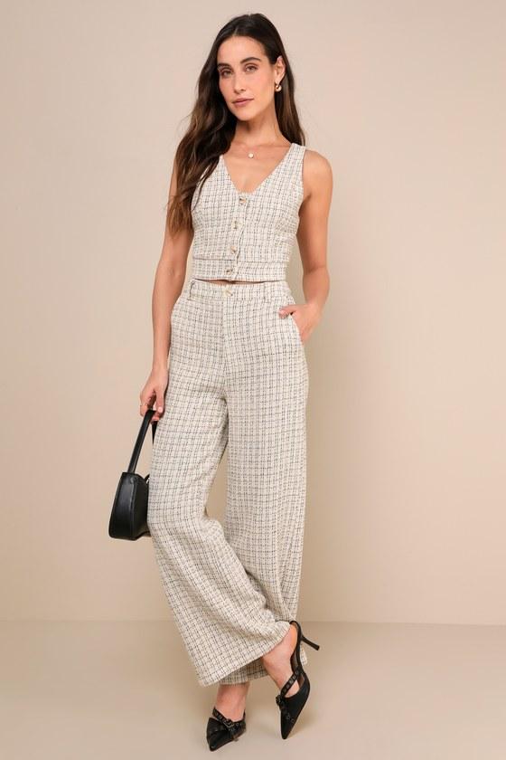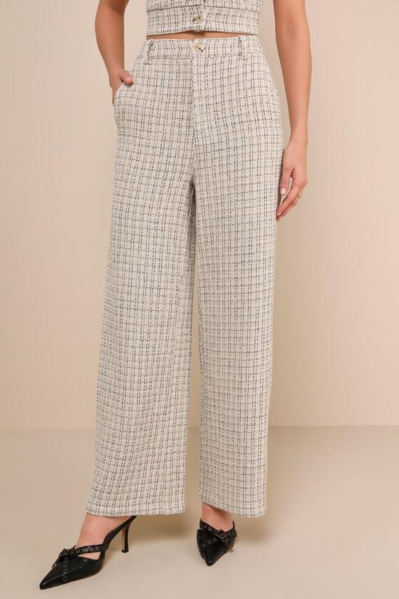 Make an exceptional impression in these textured tweed pants that feature a high-rise fit, complete with belt loops and a hidden zip fly with a top button closure. The full-length, wide-leg silhouette keeps things cute and casual with diagonal front pockets.