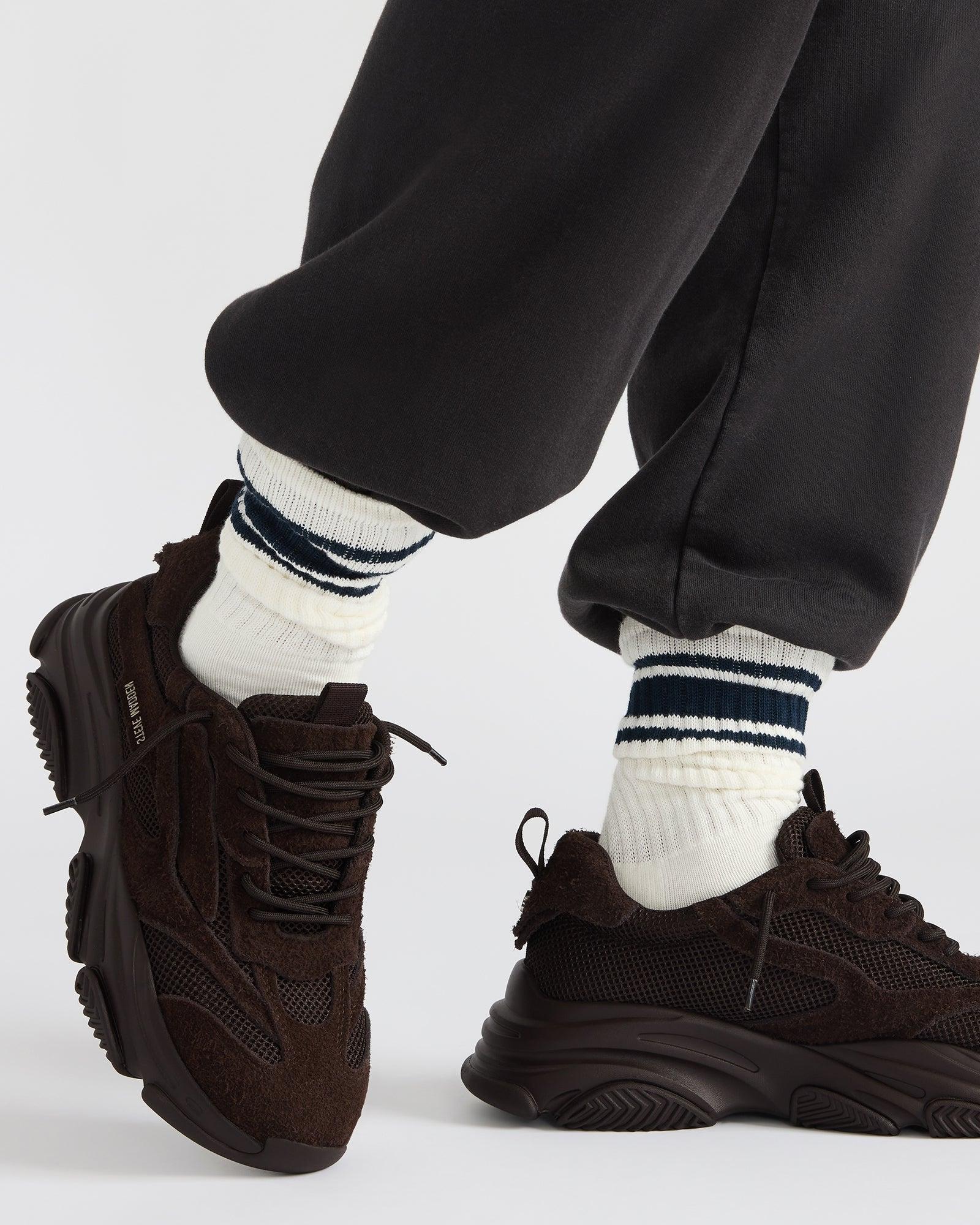 SUBSTANTIAL + DYNAMIC + MODERN The sweeping lines of the chunky molded sole on the POSSESS sneaker are matched by the curved panels that reinforce the mesh upper. Chunky platform fashion sneaker Laced closure Wide molded platform sole 2 inch heel height Suede and mesh textile upper material Textile and synthetic lining Synthetic sock Rubber sole Fit tip: if you are in between sizes, size up a half-size Imported