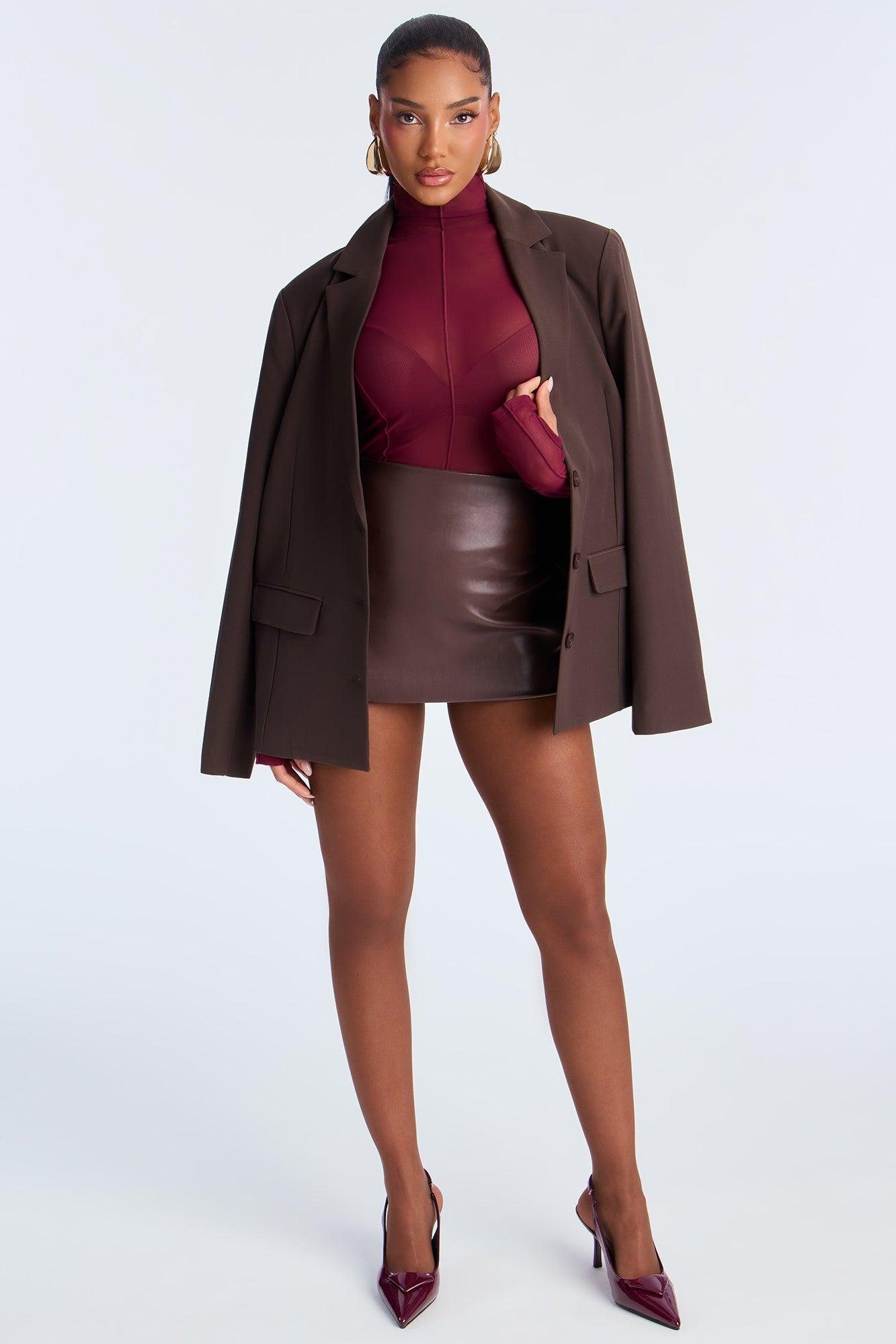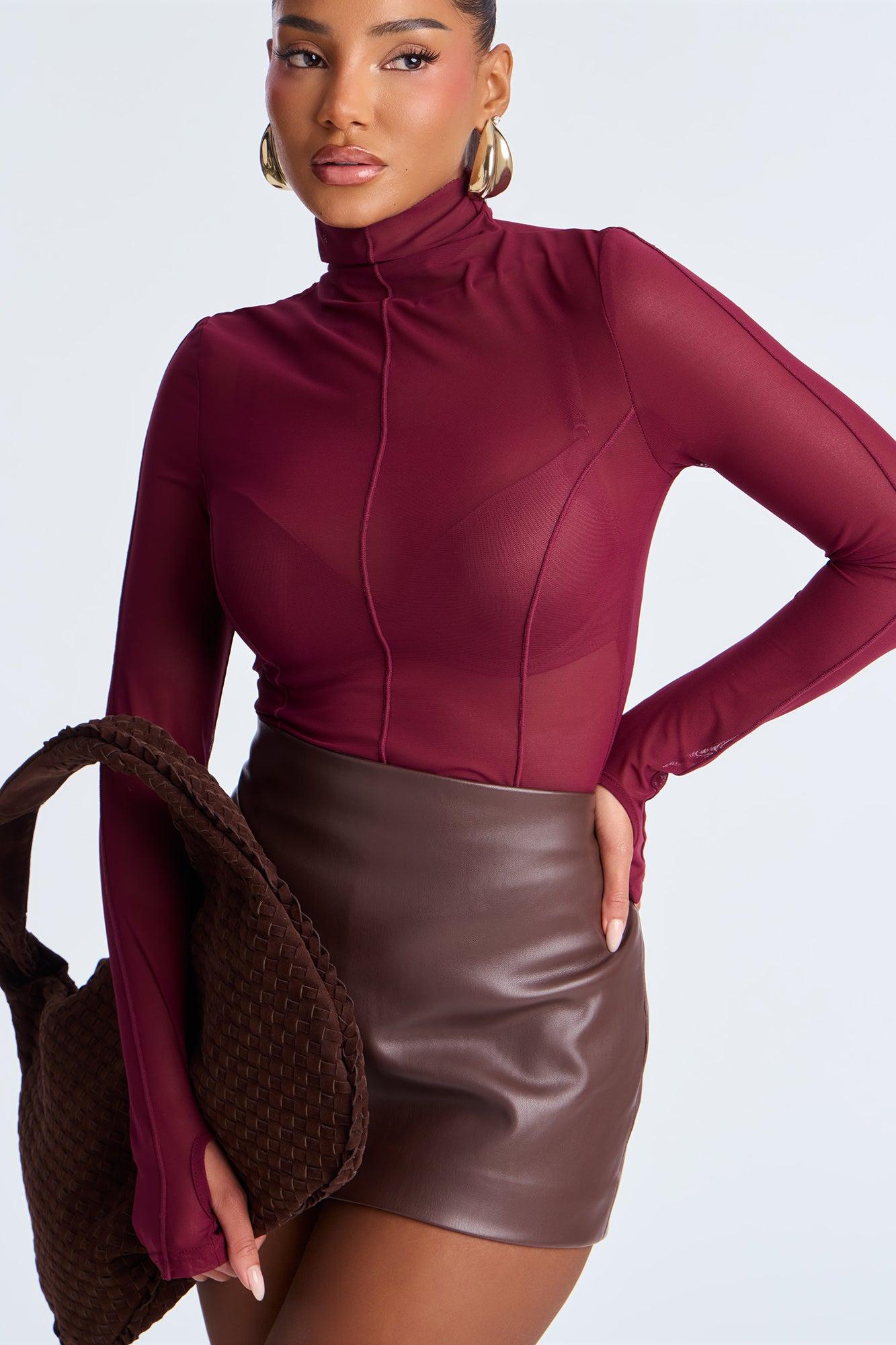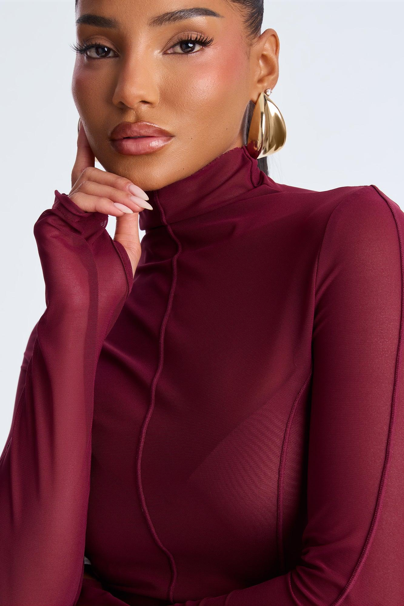 Power Mesh Mock Neck Long Sleeve Top - Wine