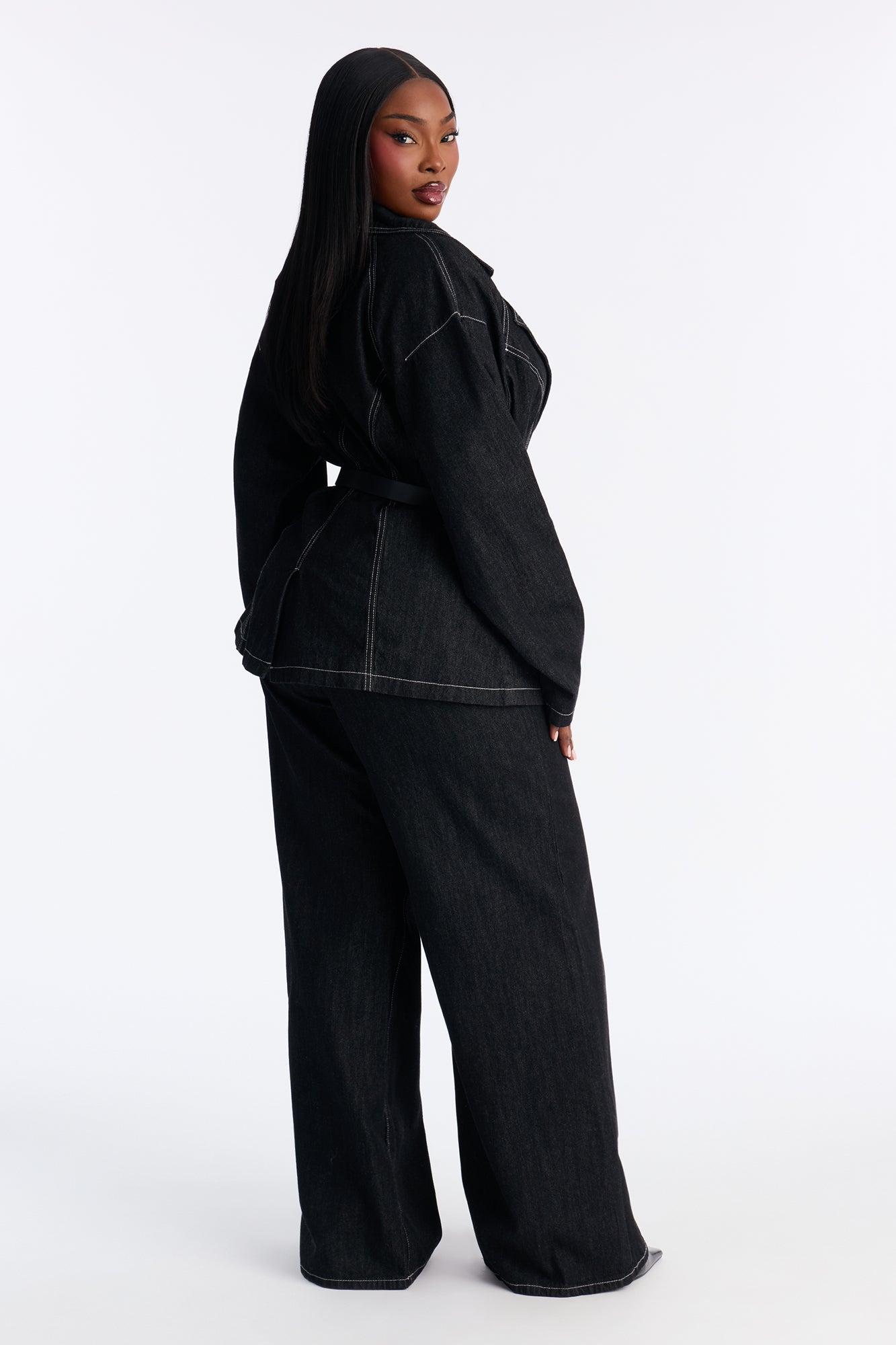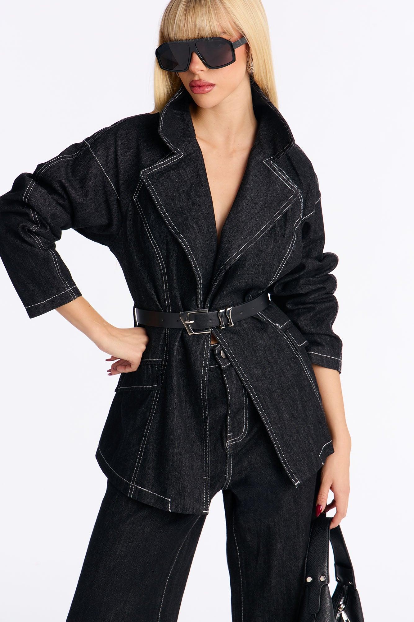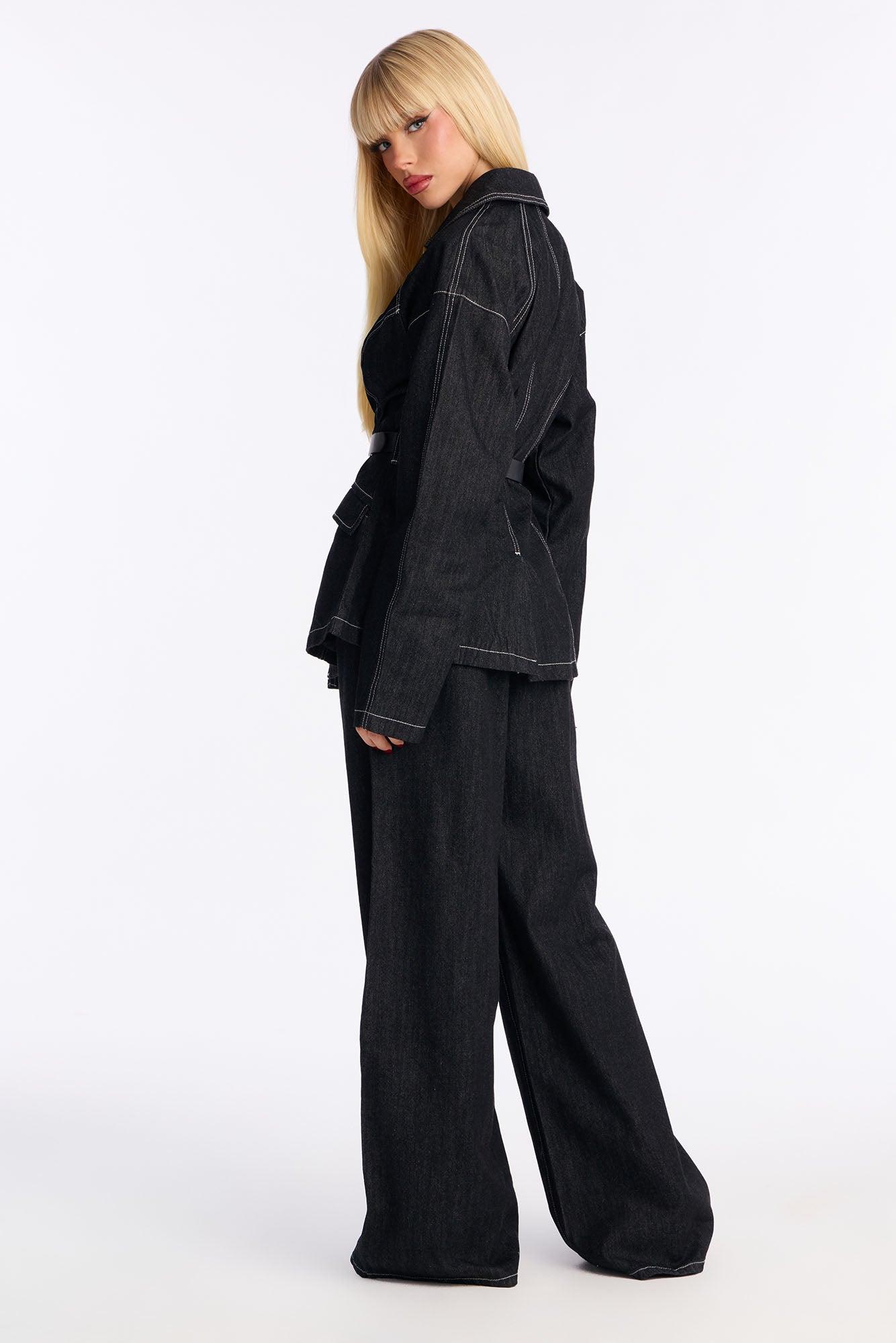 Power Stitched Belted Denim Pant Set - Dark Denim Female