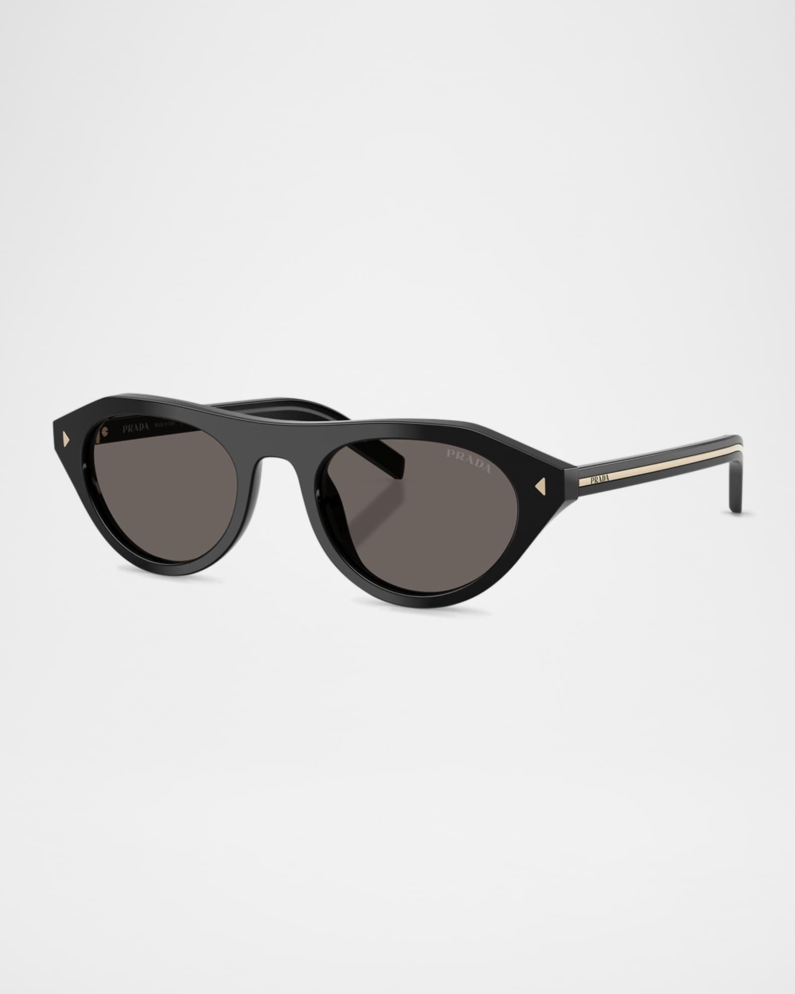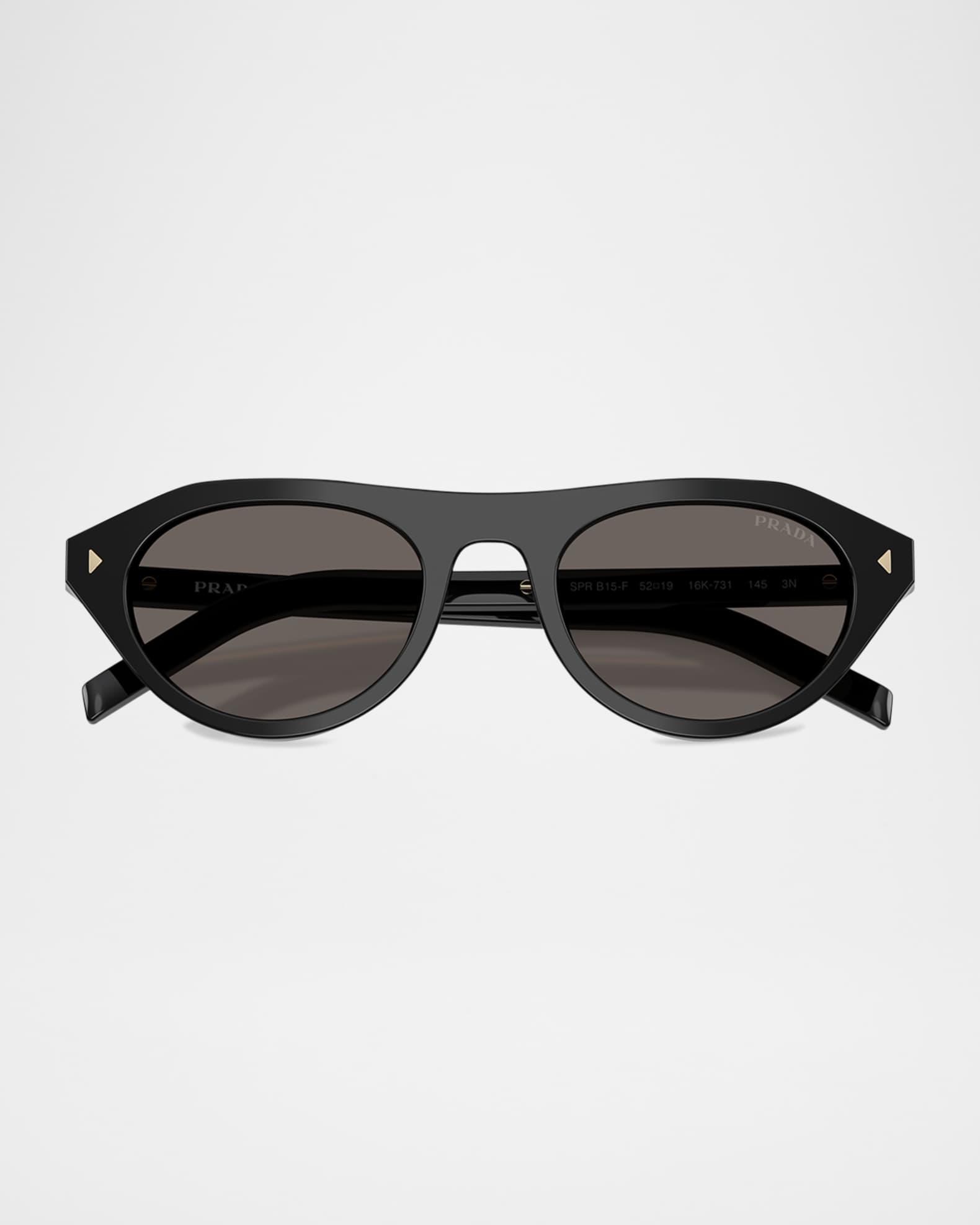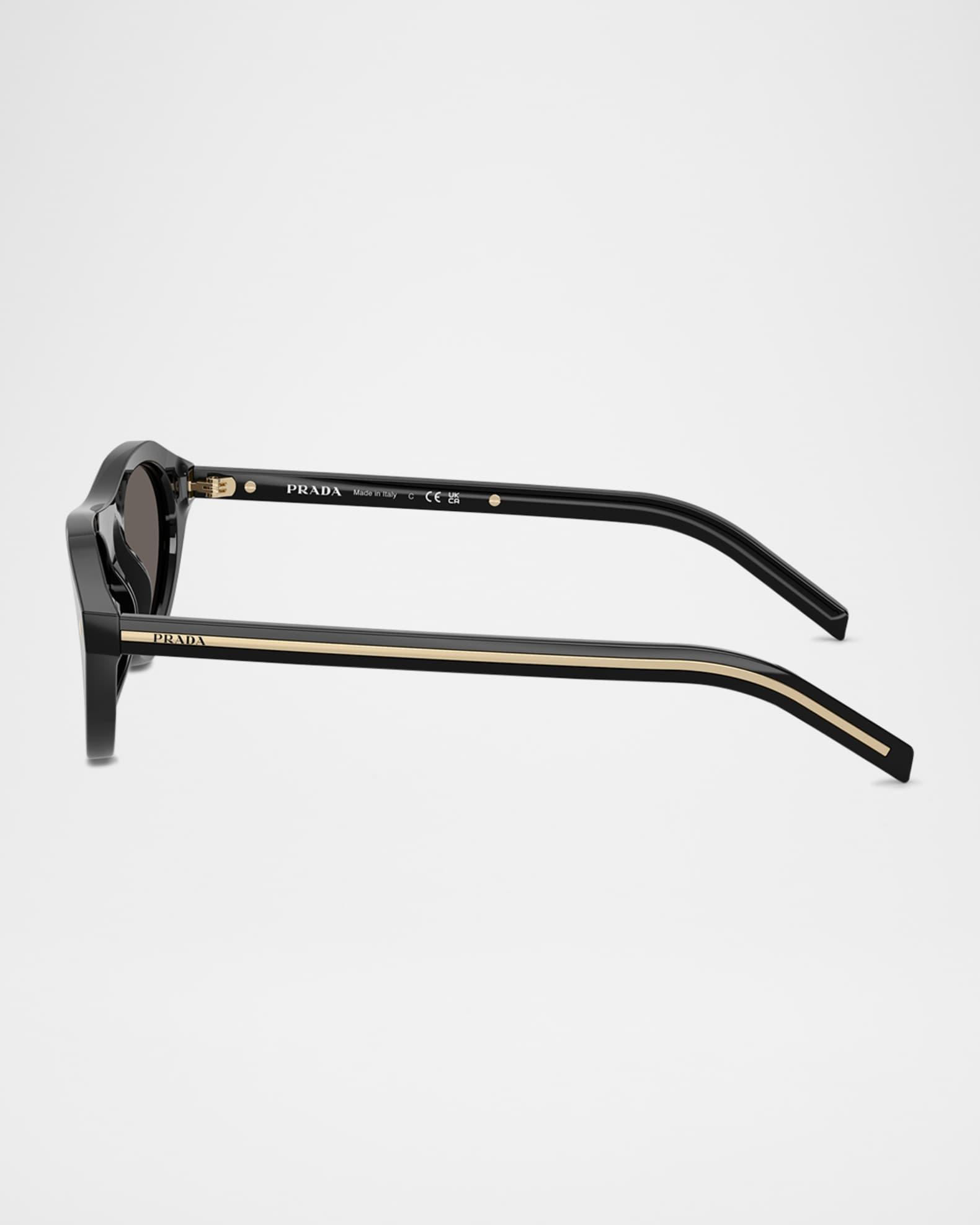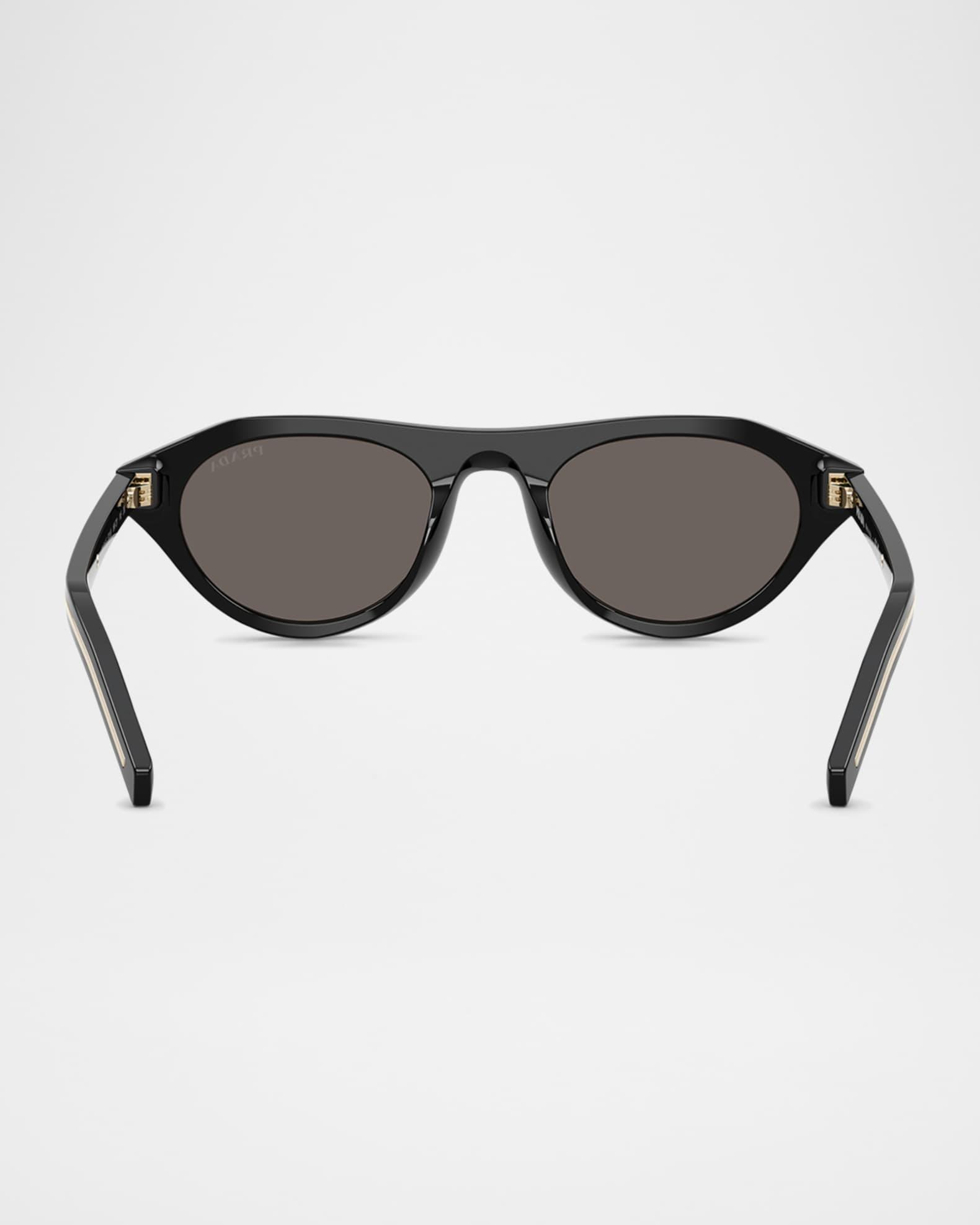 Prada PR B15SF sunglasses feature an irregular shape. The design is versatile and can be worn with any outfit. These sunglasses are a must-have for anyone looking to add a touch of style to their wardrobe. PR B15SF features a black color on a round frame with dark grey lenses. Each pair of sunglasses comes with a cleaning cloth and case to clean and protect your sunglasses from scratches and damage. To protect your eyes from harmful UV rays, these sunglasses include lenses that are coated with 100% UV protection. Prada "PR B15SF" round sunglasses in acetate Lens/bridge/temple (in mm): 52-19-145 Solid-color lenses Thin, tapered arms Spot clean 100% UVA/UVB protection Made in Italy Proposition 65 warning for California residents