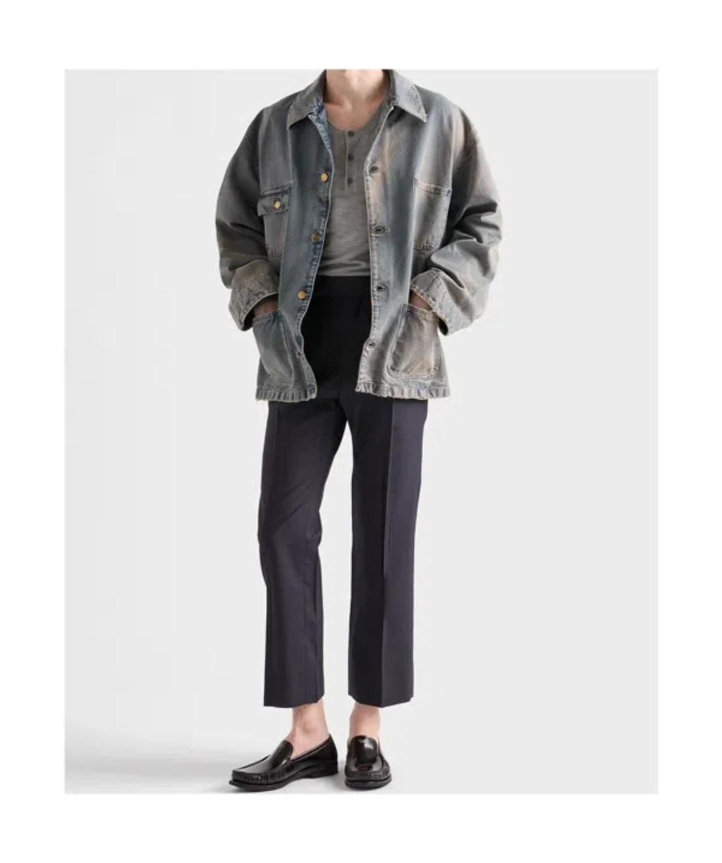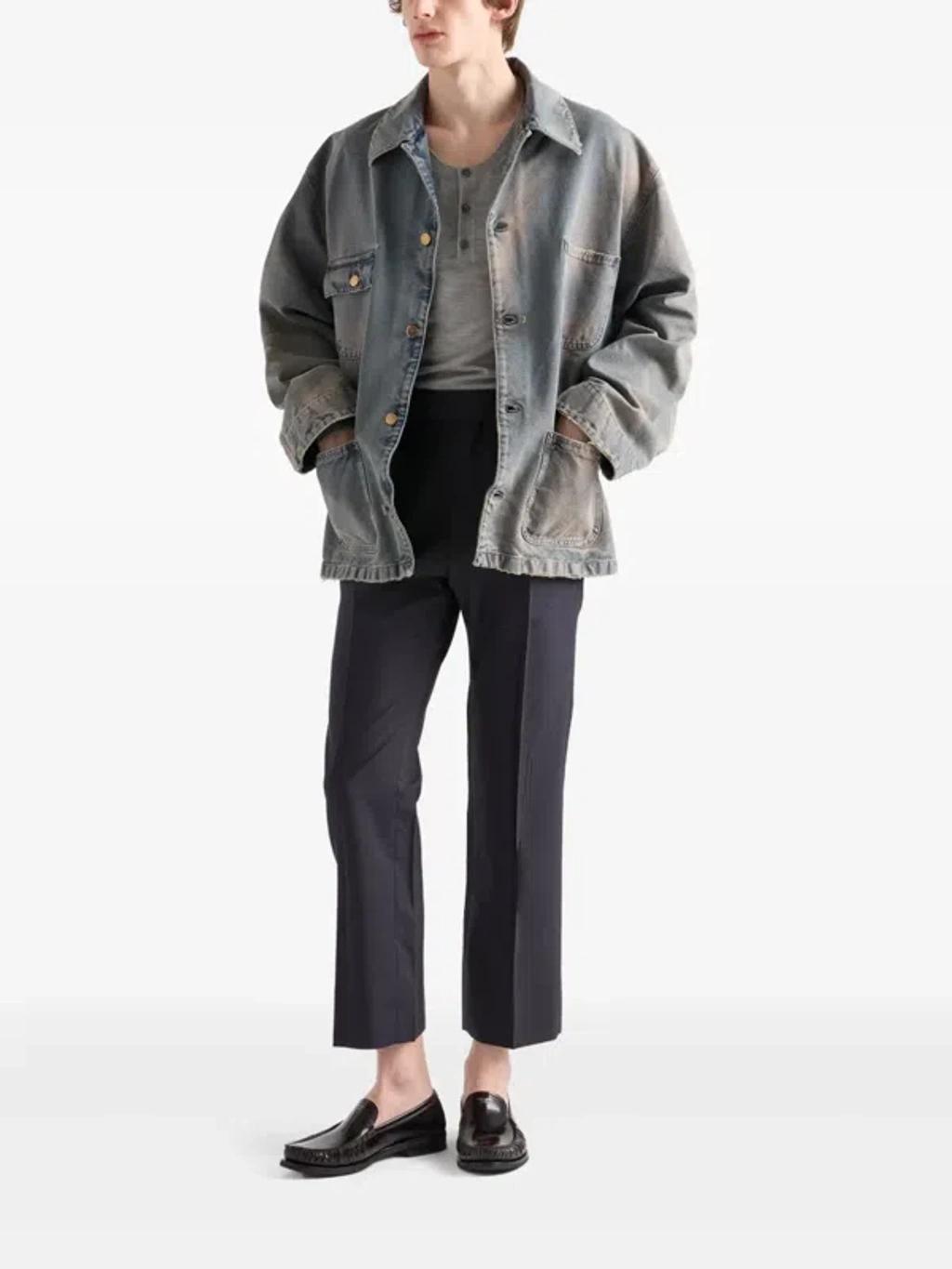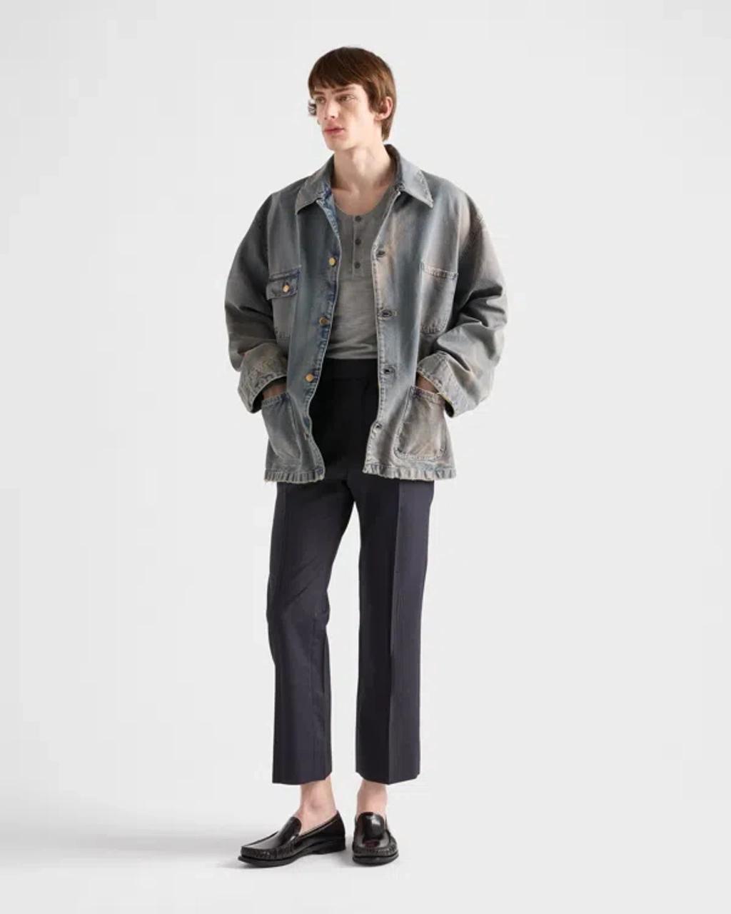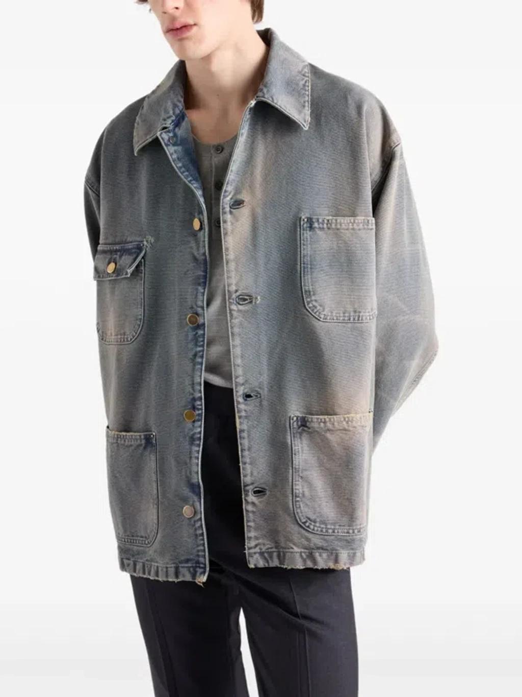 Shop Prada Distressed Denim Blouson Jacket In Gray from 800+ stores, starting at $2345. Product details This workwear-style blouson jacket is reinterpreted with artisanal workmanship that gives the cotton canvas a vintage effect Distressed details transform the functional style into a garment with a bold distinctive character Product code GEB289_14W7_F0008_S_OOO Garment-dyed and airbrushed treatment Unlined garment Classic fit Shirt-style collar Long sleeves Front button closure Matching stitching Flap pocket on the chest Flap pockets Center-back length 78 cm Size L Straight hem Triangle logo Imported The model is 187 cm tall and wears a size 48 Height 78cm Main material 100 cotton