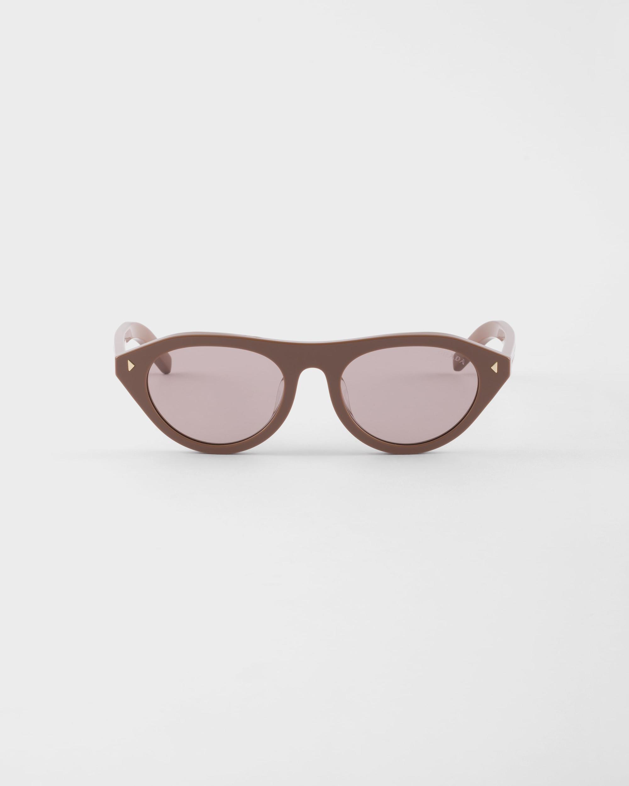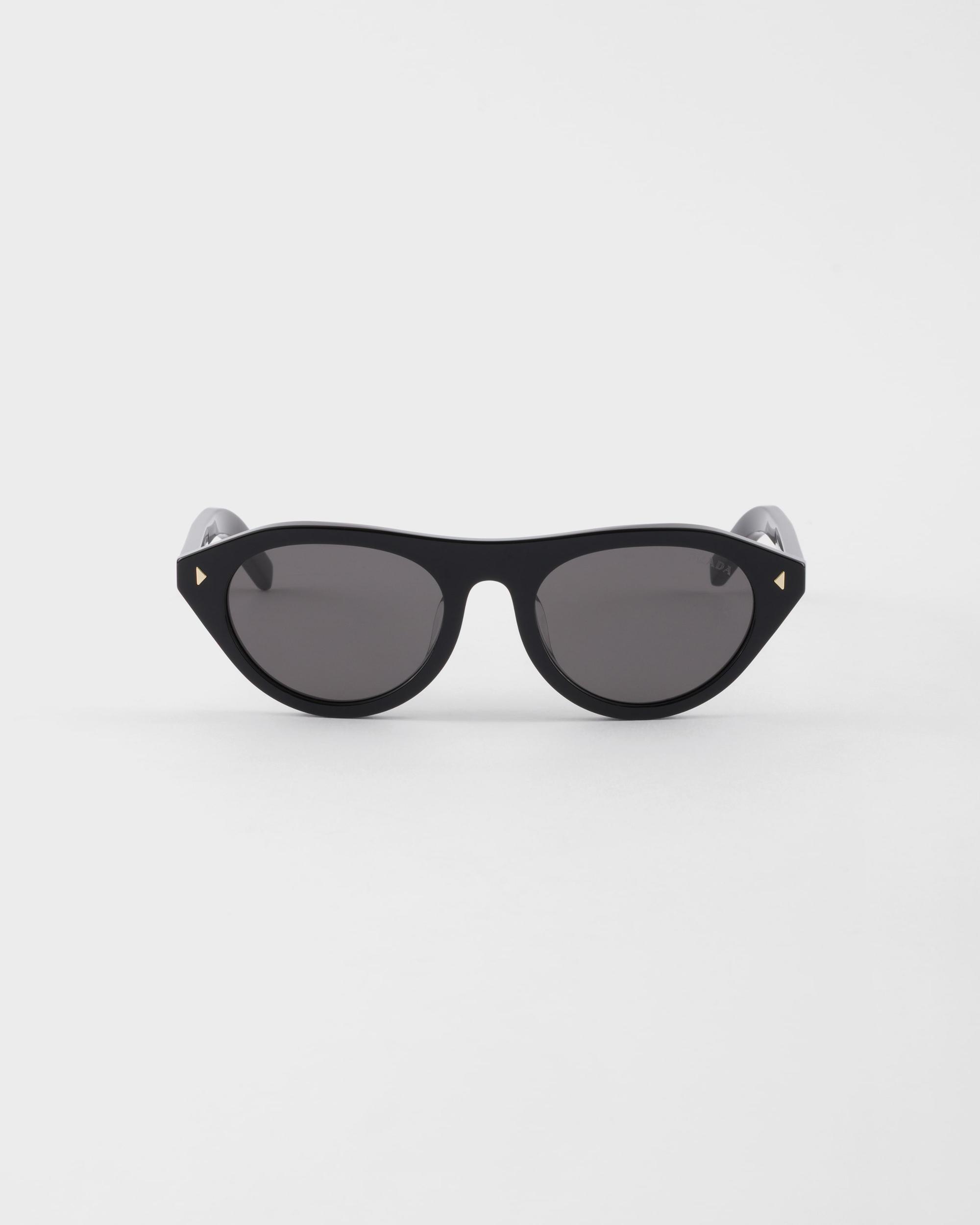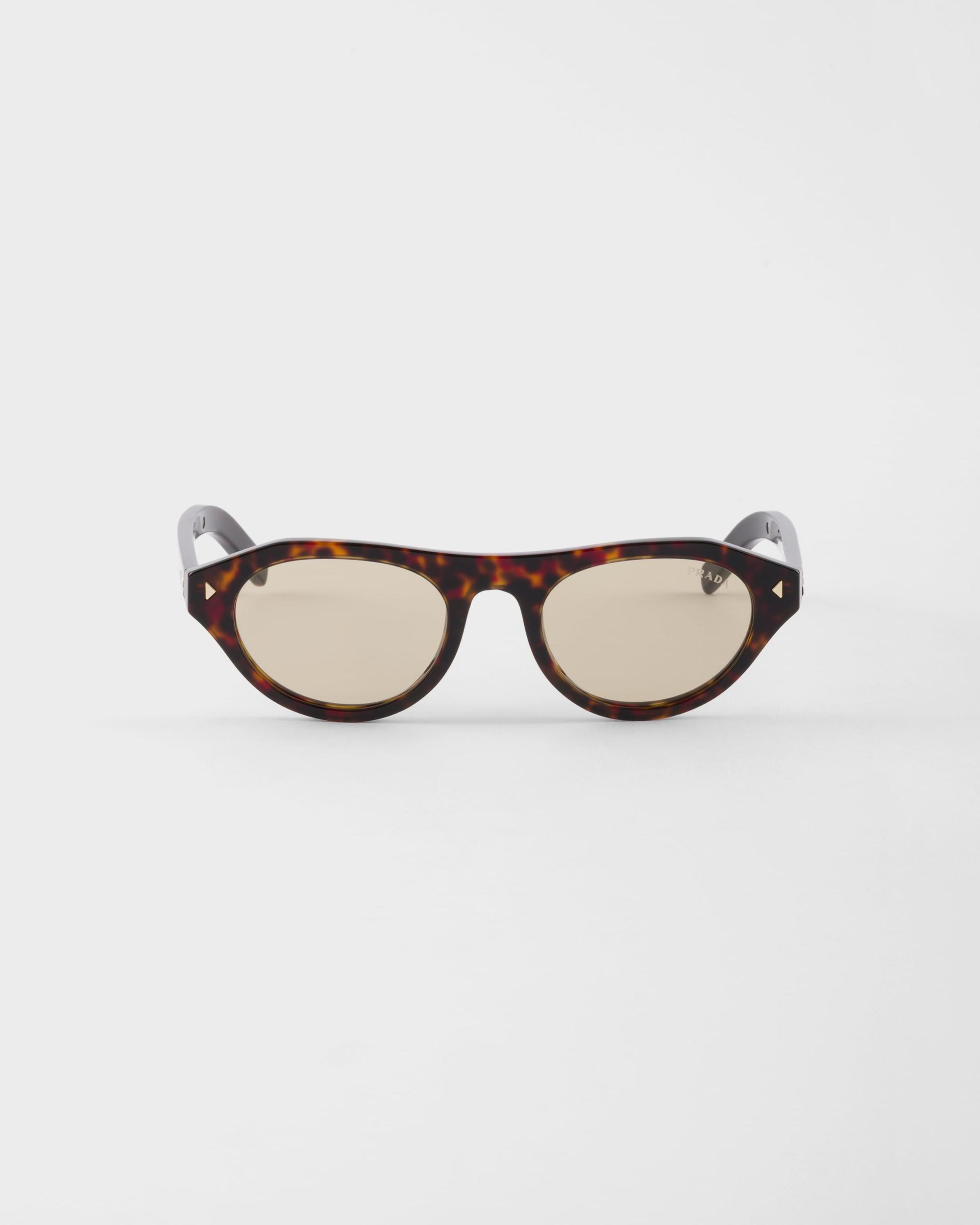 A sleek aesthetic meets the refined touch of details in these new Prada sunglasses. The acetate frame front features sophisticated triangular rivets while the temples highlight the iconic metal element enriched with the Prada lettering logo.