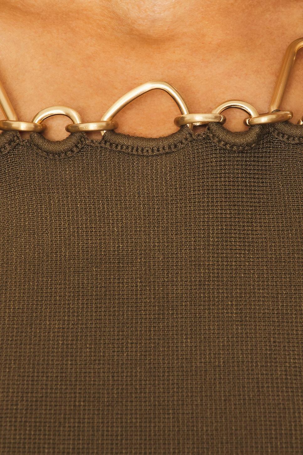 79% viscose, 21% nylon. Dry clean only. Unlined. Lobster clasp closures. Gold-tone chain neckline trim. Heavyweight jersey fabric. Made in China. Revolve Style No. CULG-WD429. Manufacturer Style No. KD3847YN2611.