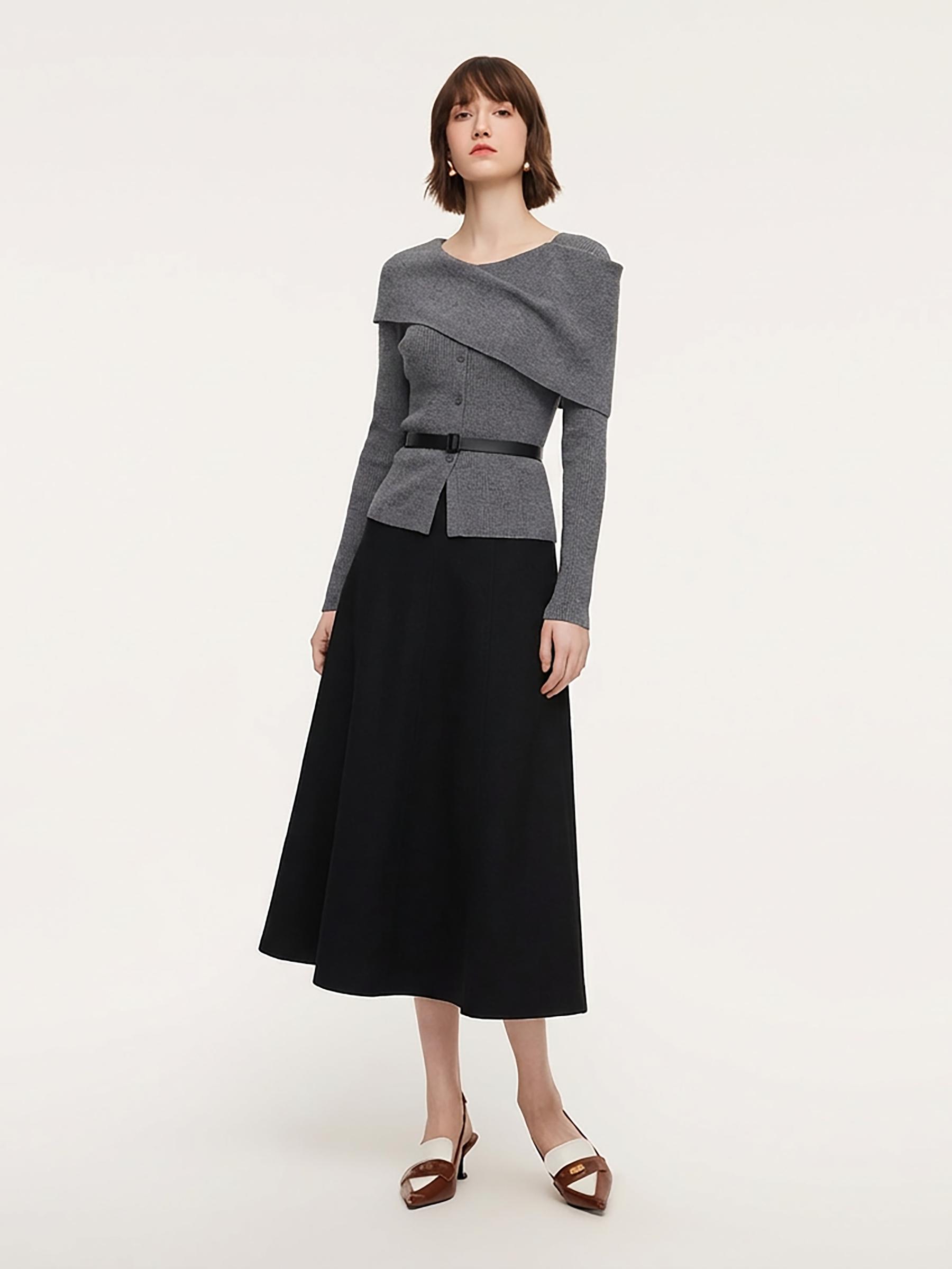 -Two-piece set -With belt -A-line skirt Indulge in cozy sophistication with this versatile two-piece set, featuring a multi-way cape style knit top and an eight-panel knit skirt. The innovative cape secures with nut buttons, transforming from a cascading wave to a sleek shoulder-wrap for polished office wear. Paired wi