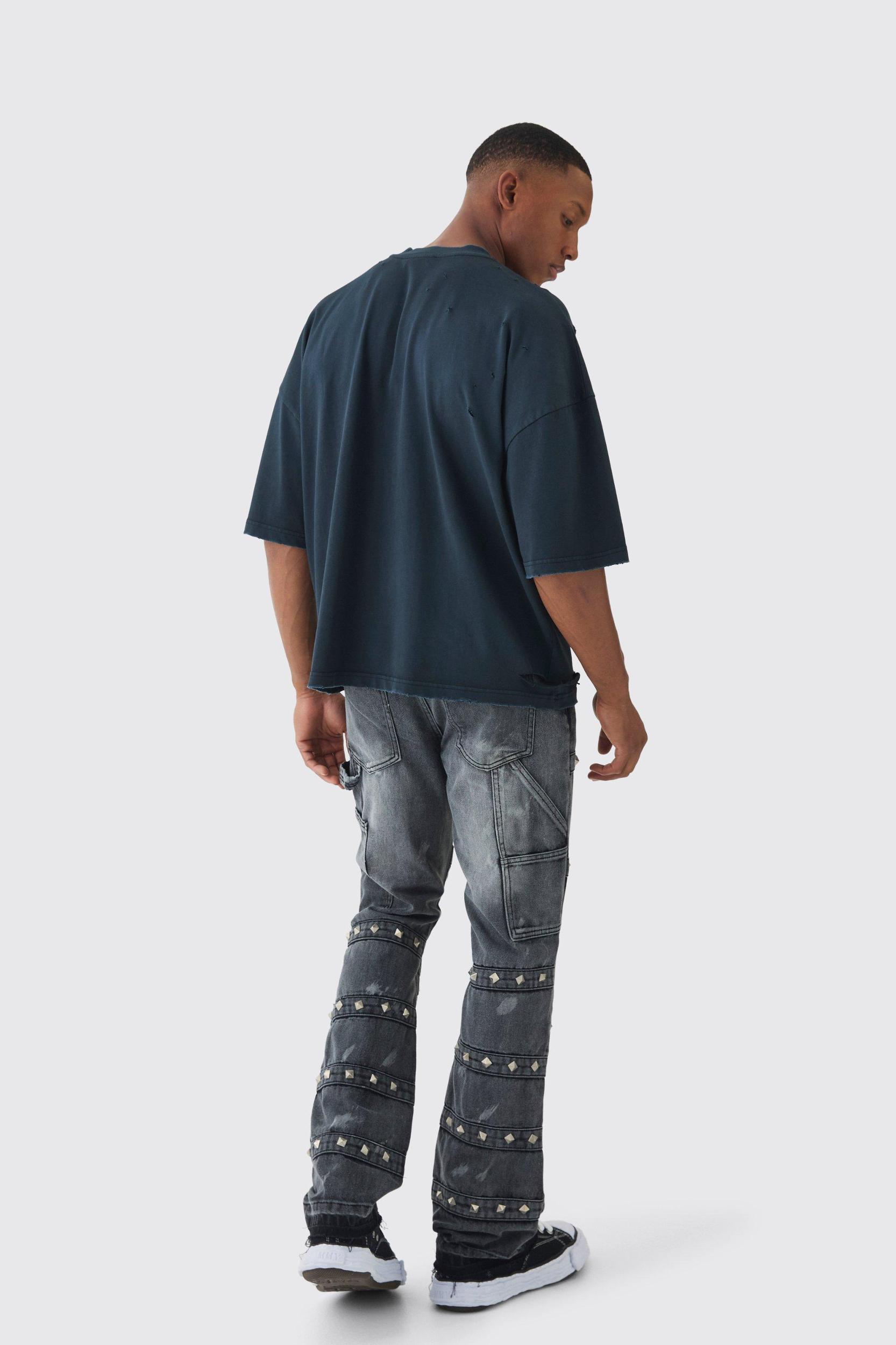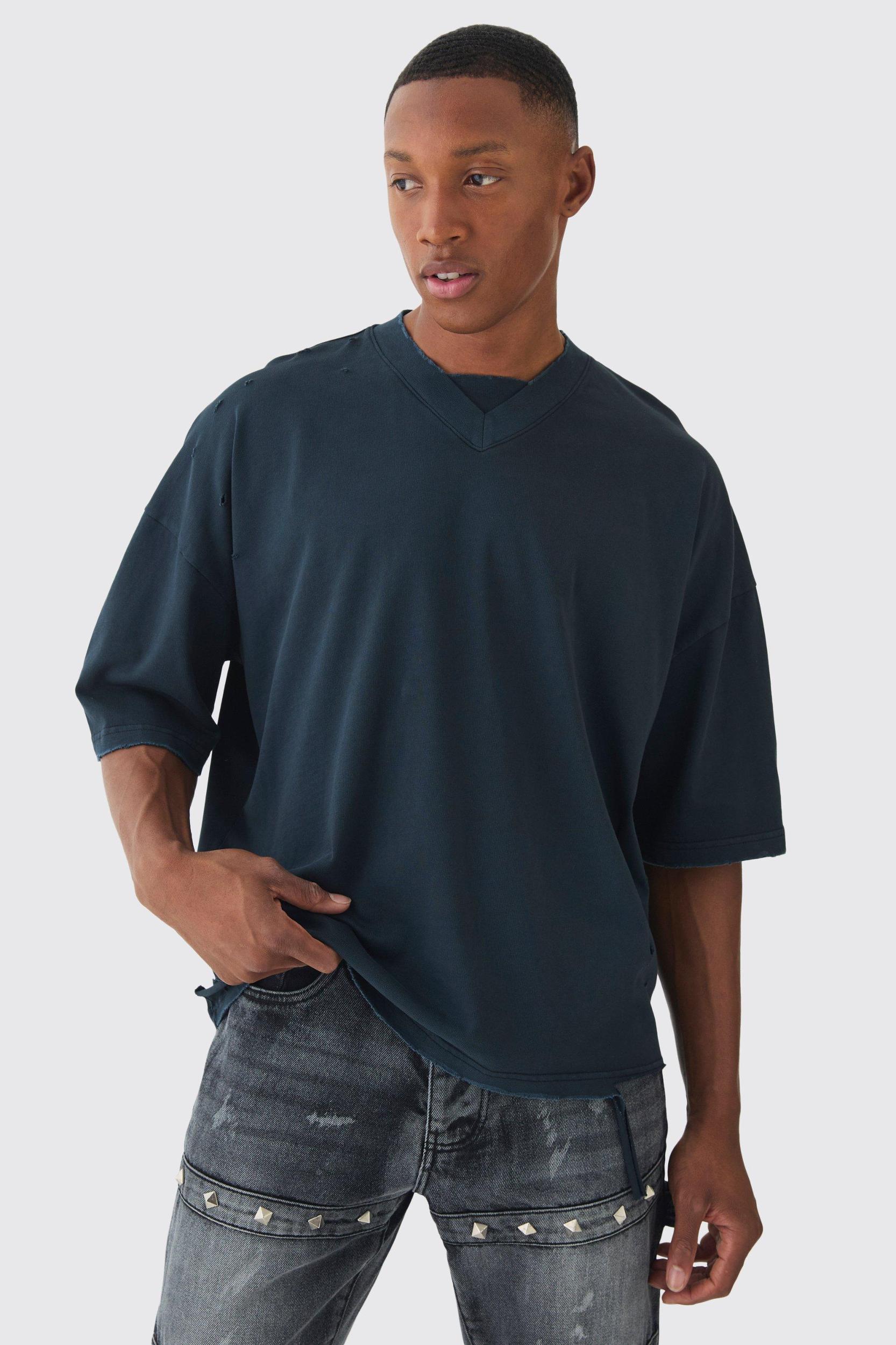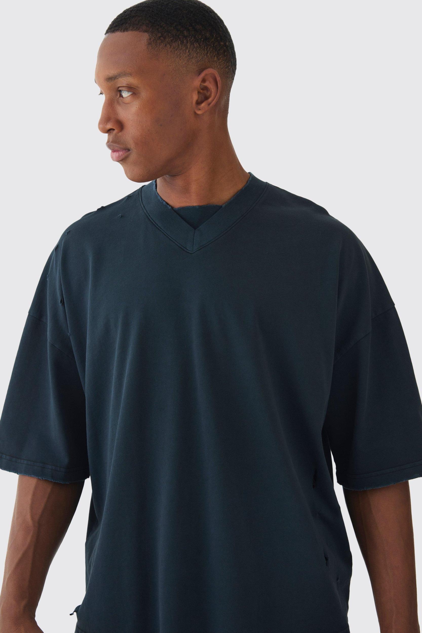 Premium Oversized V Neck Dropped Shoulder Top Stitched Washed T-shirt | boohooMAN USA