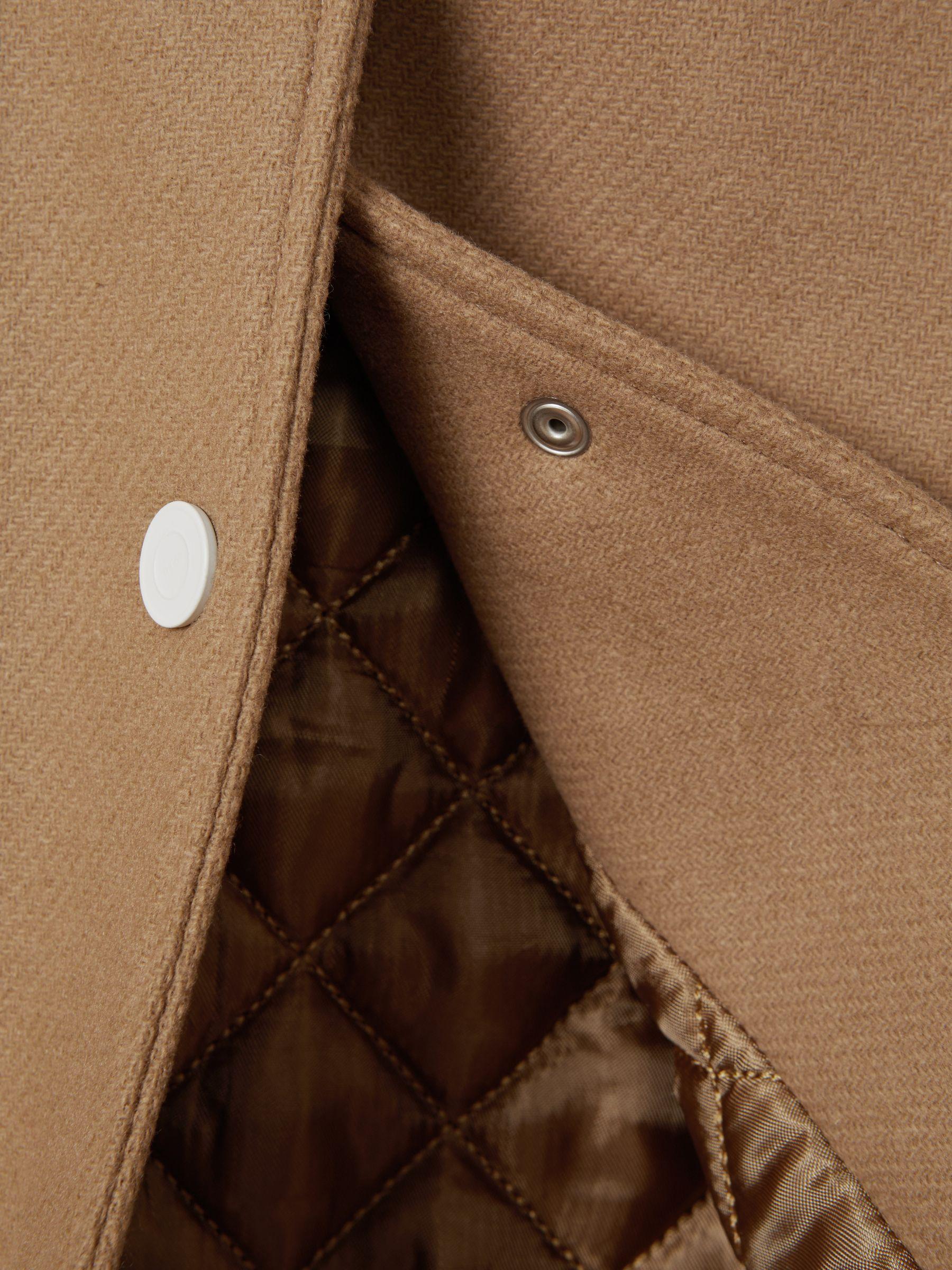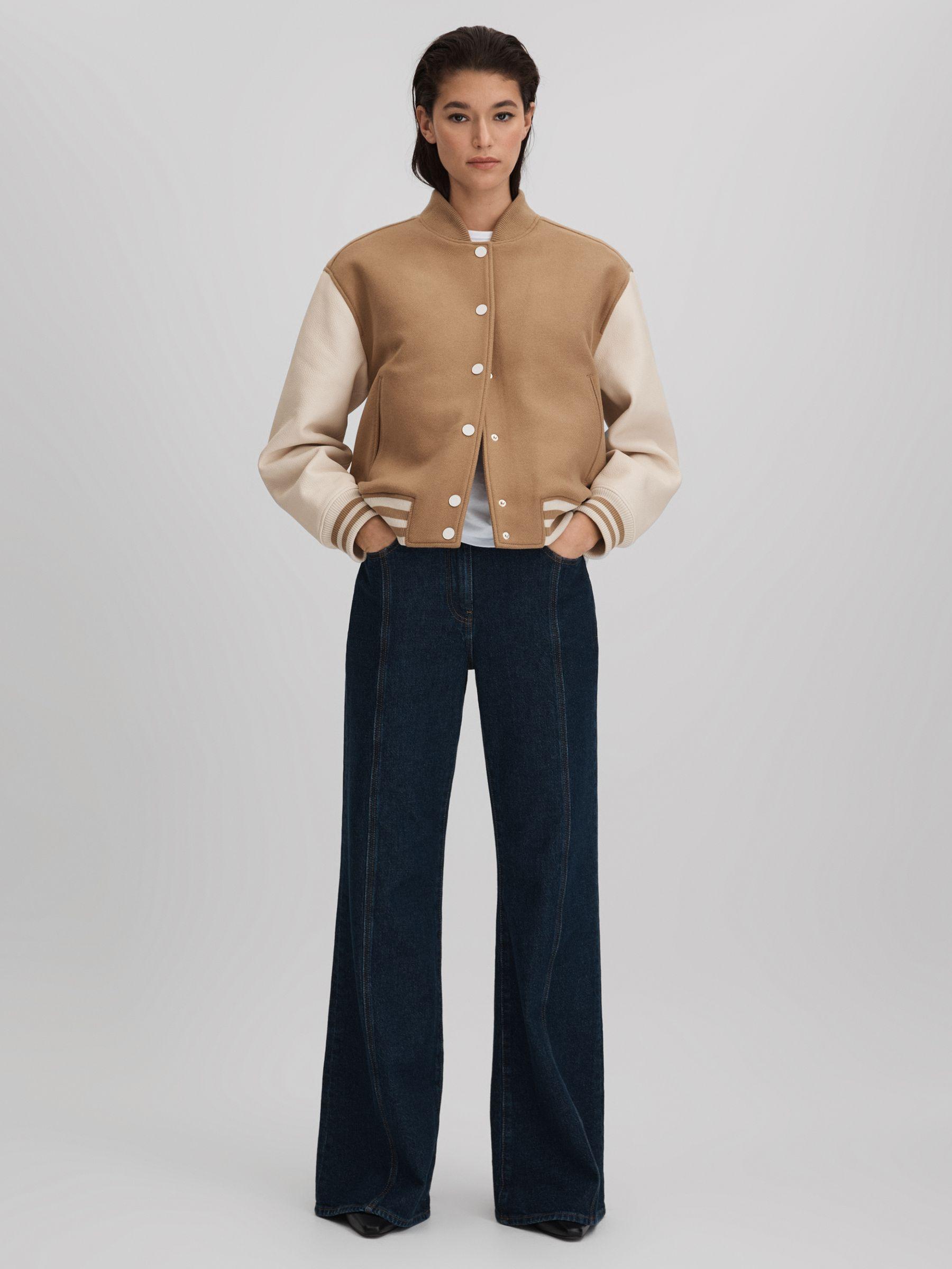 A soft wool-blend body is fitted with grained leather sleeves and ribbed cuffs. A padded, quilted lining offers extra warmth to this premium varsity-inspired bomber jacket. Wool blend Grained leather sleeves Colourblock design Press-stud front closure Side-slip pockets Ribbed trims Padded, quilted lining Oversized fit