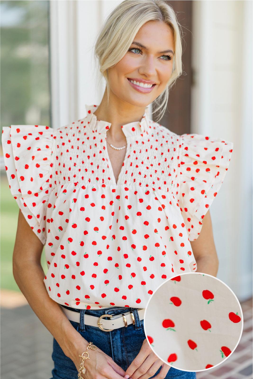 This apple print blouse is sure to make you stand out from the crowd! With its adorable print and smocked detailing, this blouse is the perfect way to express your unique style and let your personality shine. V-Neckline Ruffled Sleeves Apple Prints Smocked Detailing Material has no amount of stretch Baileigh is wearing the small.
