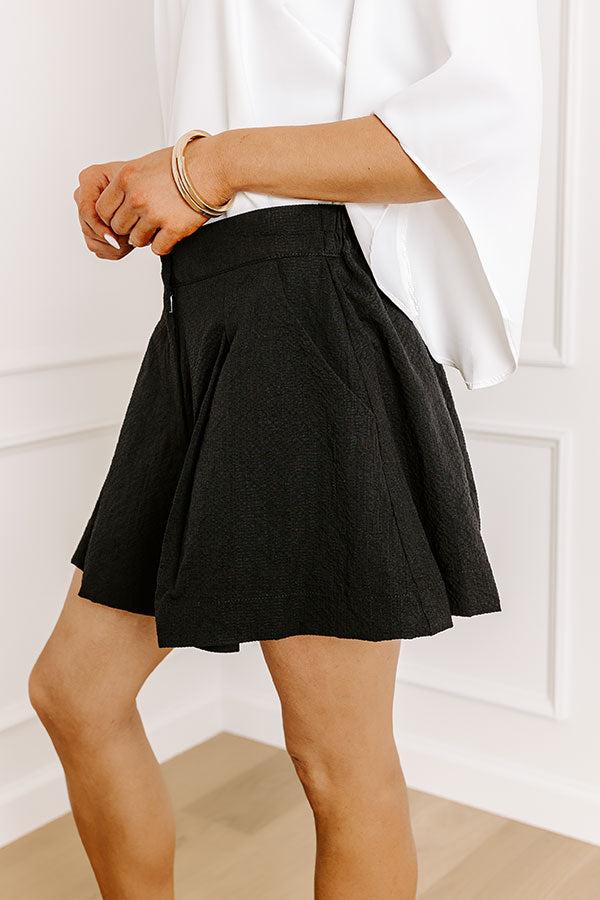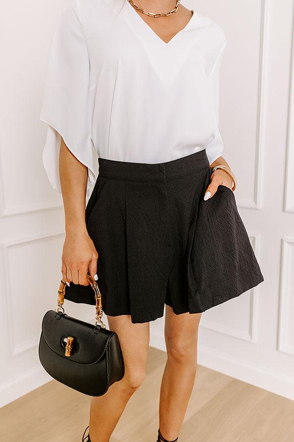 - Put a little prep in your step with these versatile shorts! With a trendy texture and a relaxed fit, these shorts can be dressed down for everyday casual style or dressed up for a chic look. Build your look around these luxe shorts. - Fully lined textured material - Accent pleats on the front - A high waistline with an elastic banded back - A hidden zip fly, interior button closure, and hook and eye closure - Functional side pockets - A relaxed silhouette that ends in upper-thigh length hemlines
