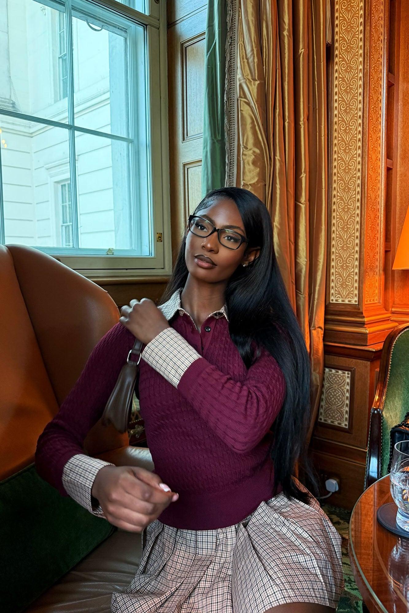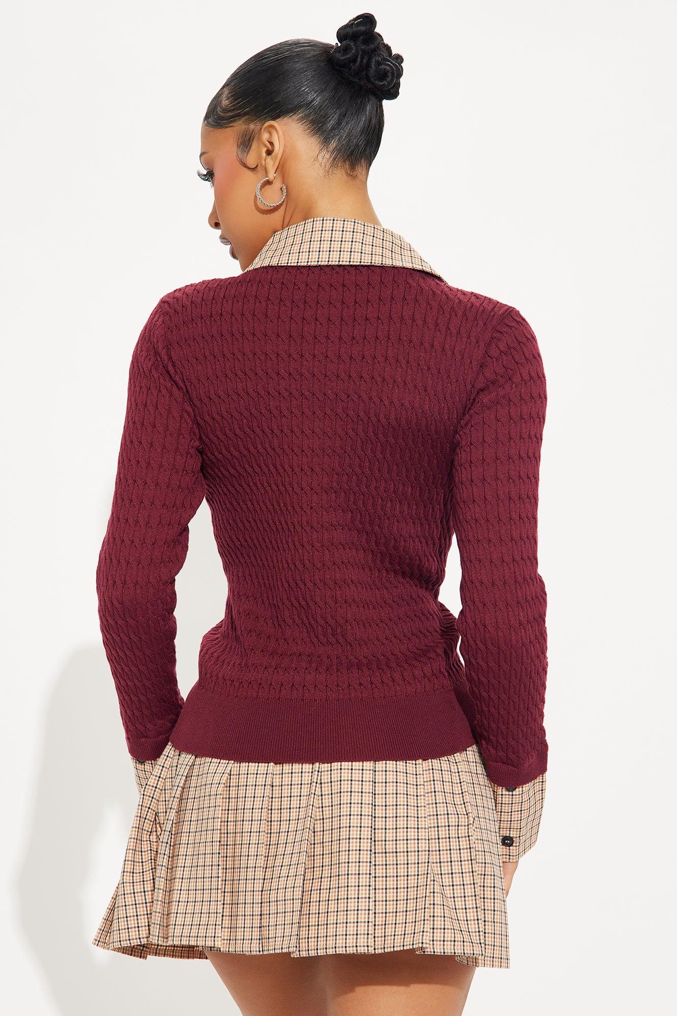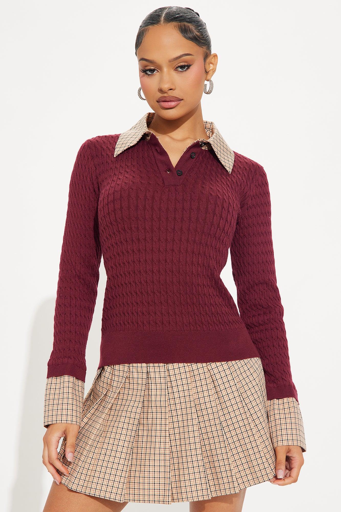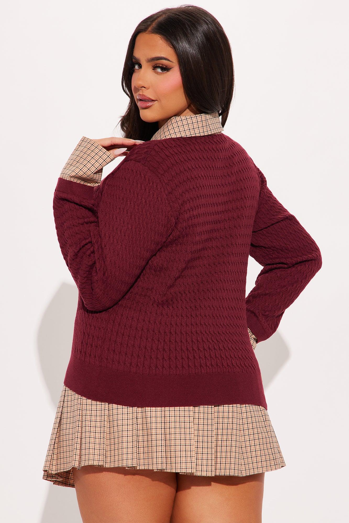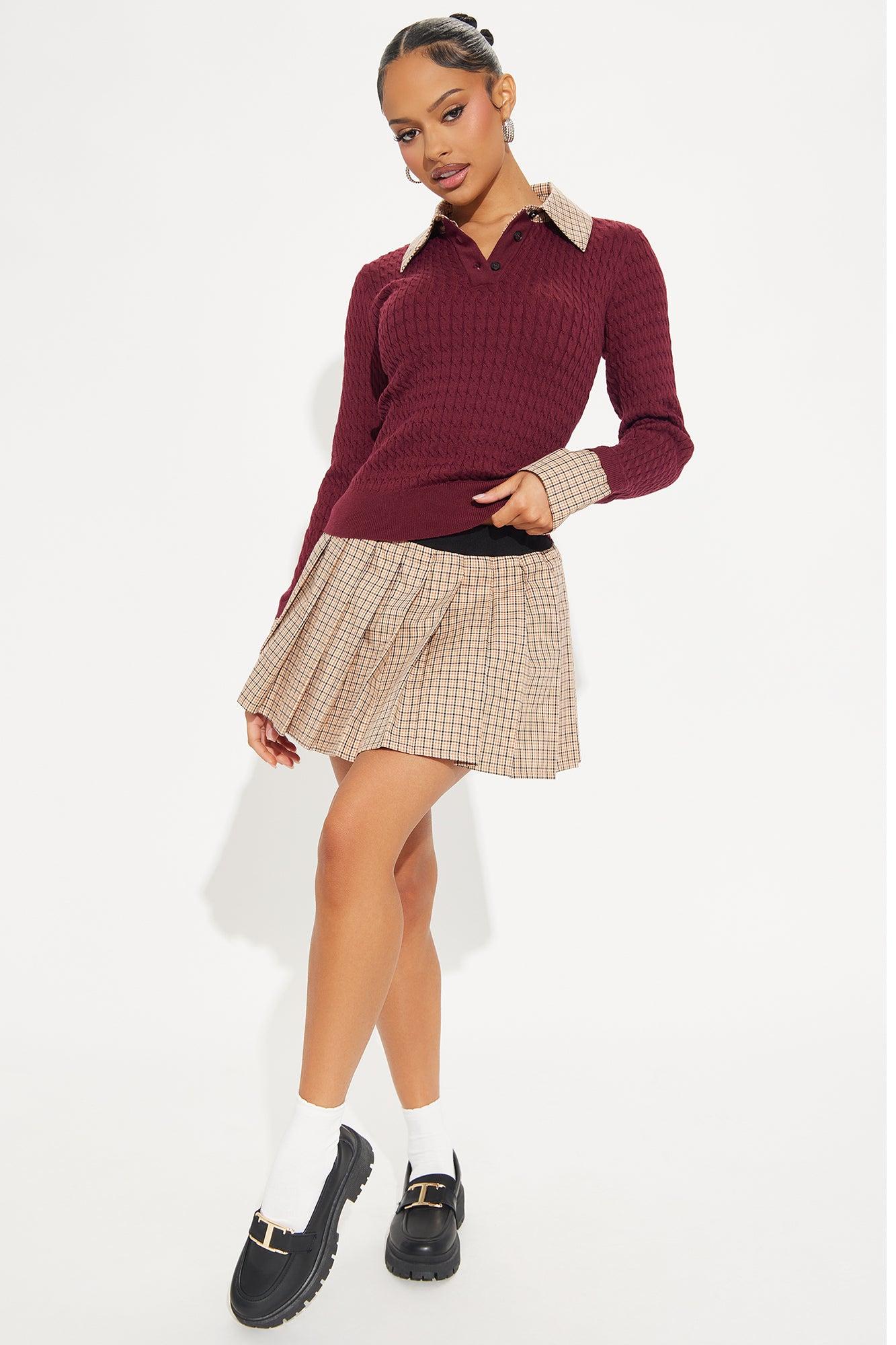 Available In Burgundy/combo. Mixed Media Sweater and Skirt Set Stretch Top and Non Stretch Skirt Attached Shirt Detail Elastic Waistband Short Lining Self/Lining: 100% Polyester Contrast 1: 100% Cotton Contrast 2: 75% Rayon 20% Polyester 5% Spandex Imported