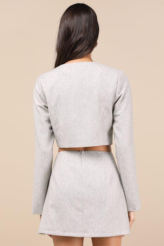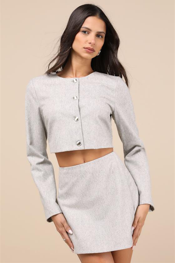 There's no look as chic as the one-and-done design of the Lulus Preppy Pursuit Heather Grey Two-Piece Long Sleeve Mini Dress! This posh two-piece dress has a wool-blend fabrication (with a heathered effect) that shapes a crop top with a crew neckline, long sleeves, and a functional button placket with textured silver buttons. Matching mini skirt has a high-rise fit and a figure-skimming A-line silhouette with an overlapping, faux-wrap panel. Hidden zipper/clasp at back of skirt.