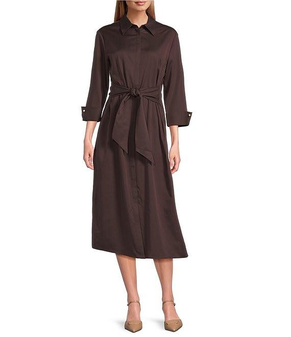 From Preston & York, this dress features: Sheath silhouette Belt included Point collar 3/4 sleeves Straight hemline Button front closure Approx. 47.5" length Lyocell/ polyester/ elastane Dry clean Imported