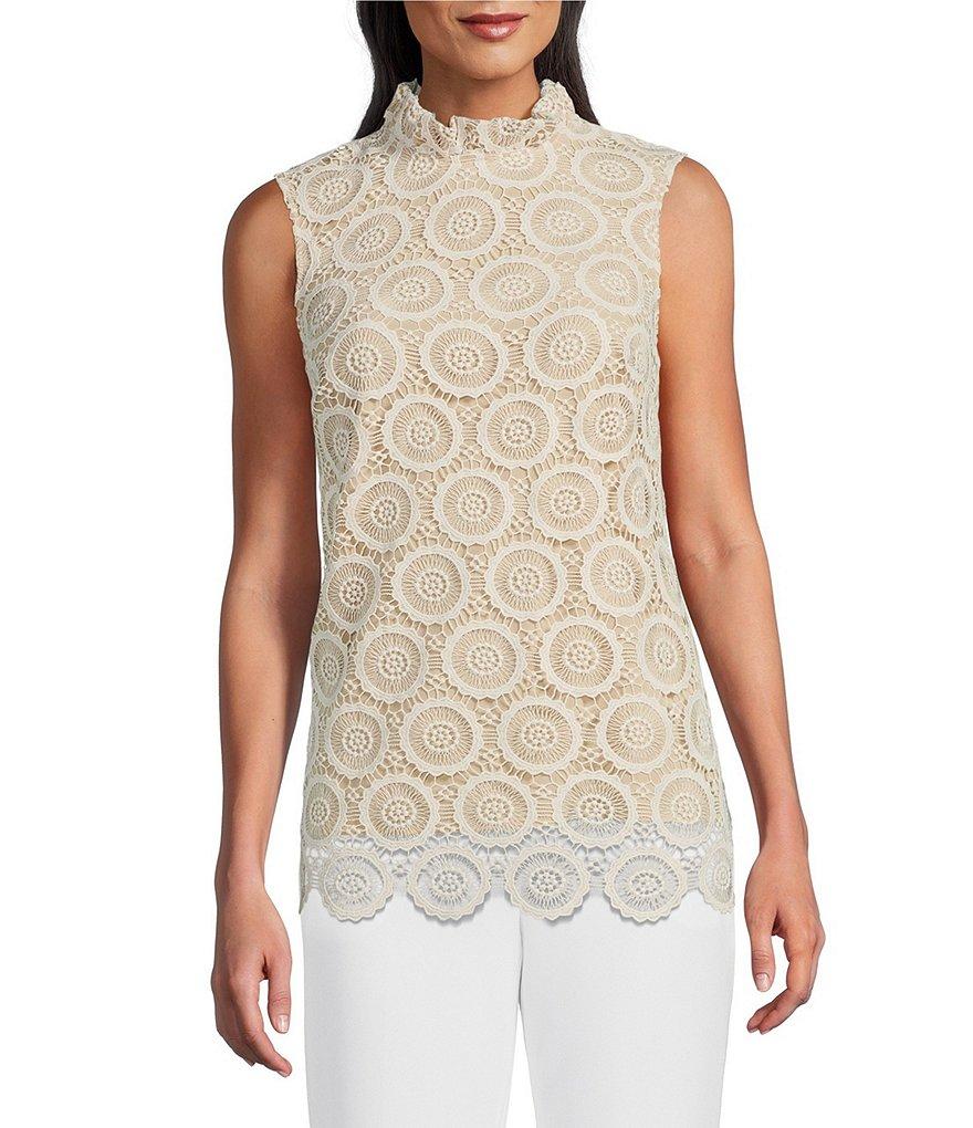 From Preston & York, this blouse features: Lace fabrication Mock neckline Sleeveless Tie back closure Lined Approx. 25.5" length Polyester Machine wash/ line dry Imported.