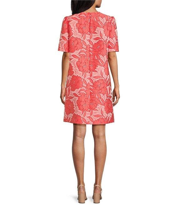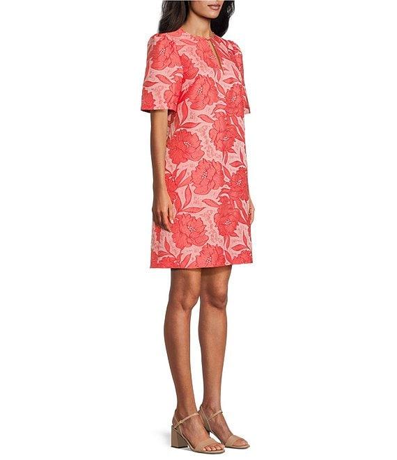 From Preston & York, this dress features: Floral jacquard fabrication Key hold neckline Above elbow sleeve Invisible zipper center back closure Side seam pockets Length approx. 36.25" 100% polyester Dry clean Dillard's Exclusive Imported.