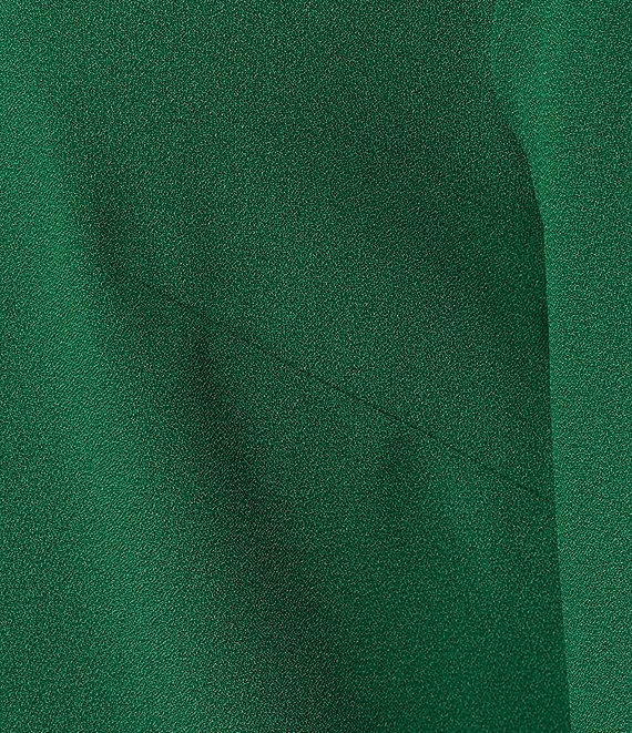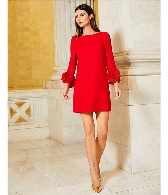 From Preston & York, this dress features: Crepe fabrication Sheath silhouette Round neckline Long sleeves Ruffle sleeve details Lined Zipper closure Approx. 36.5" length Polyester/elastane Dry clean Imported.