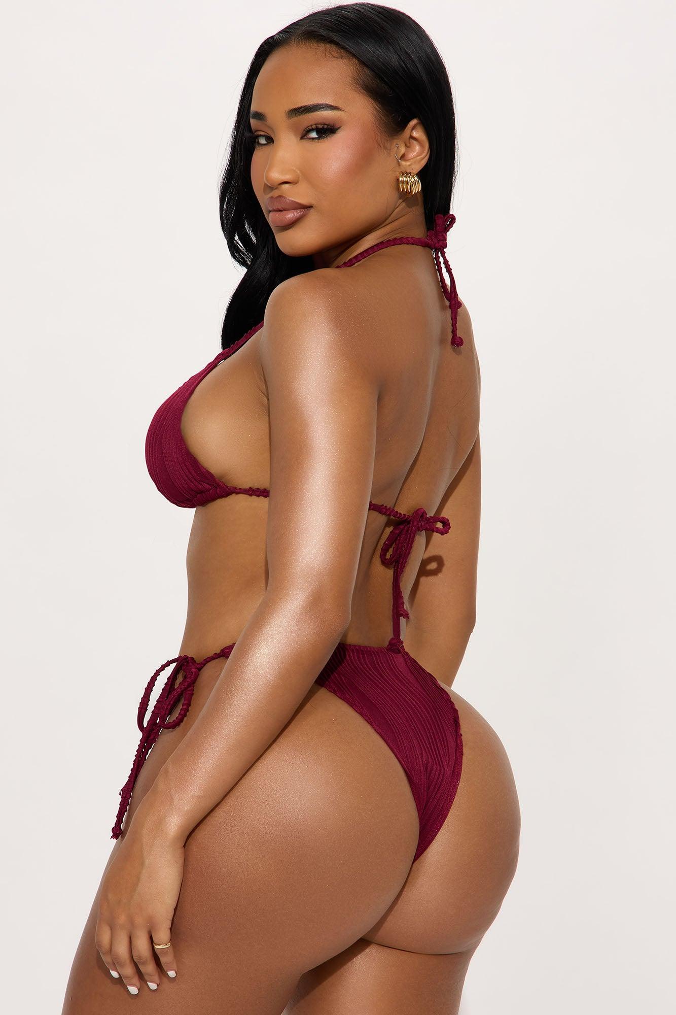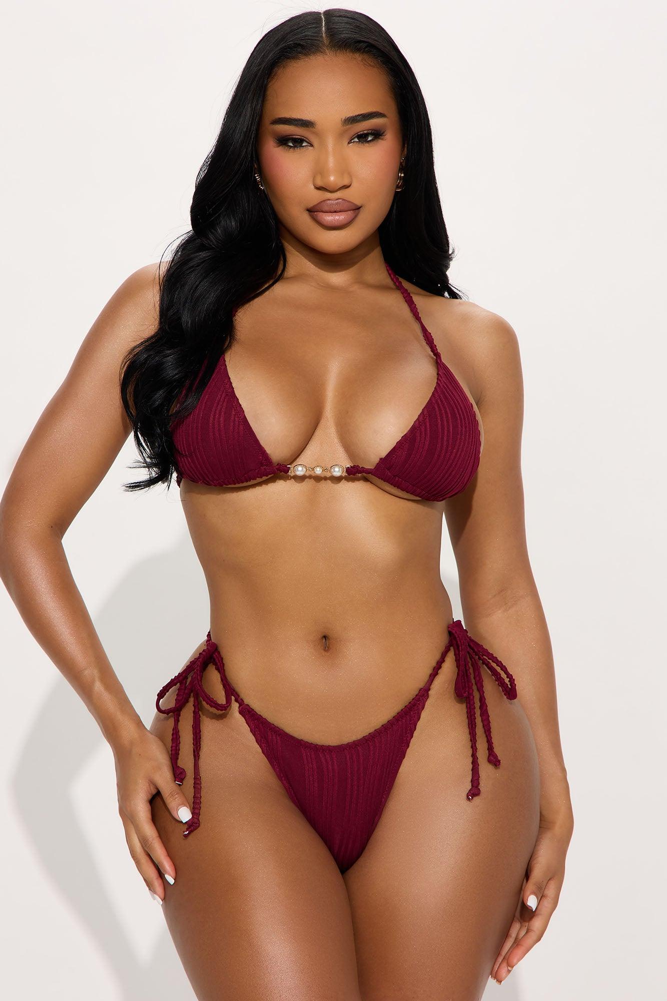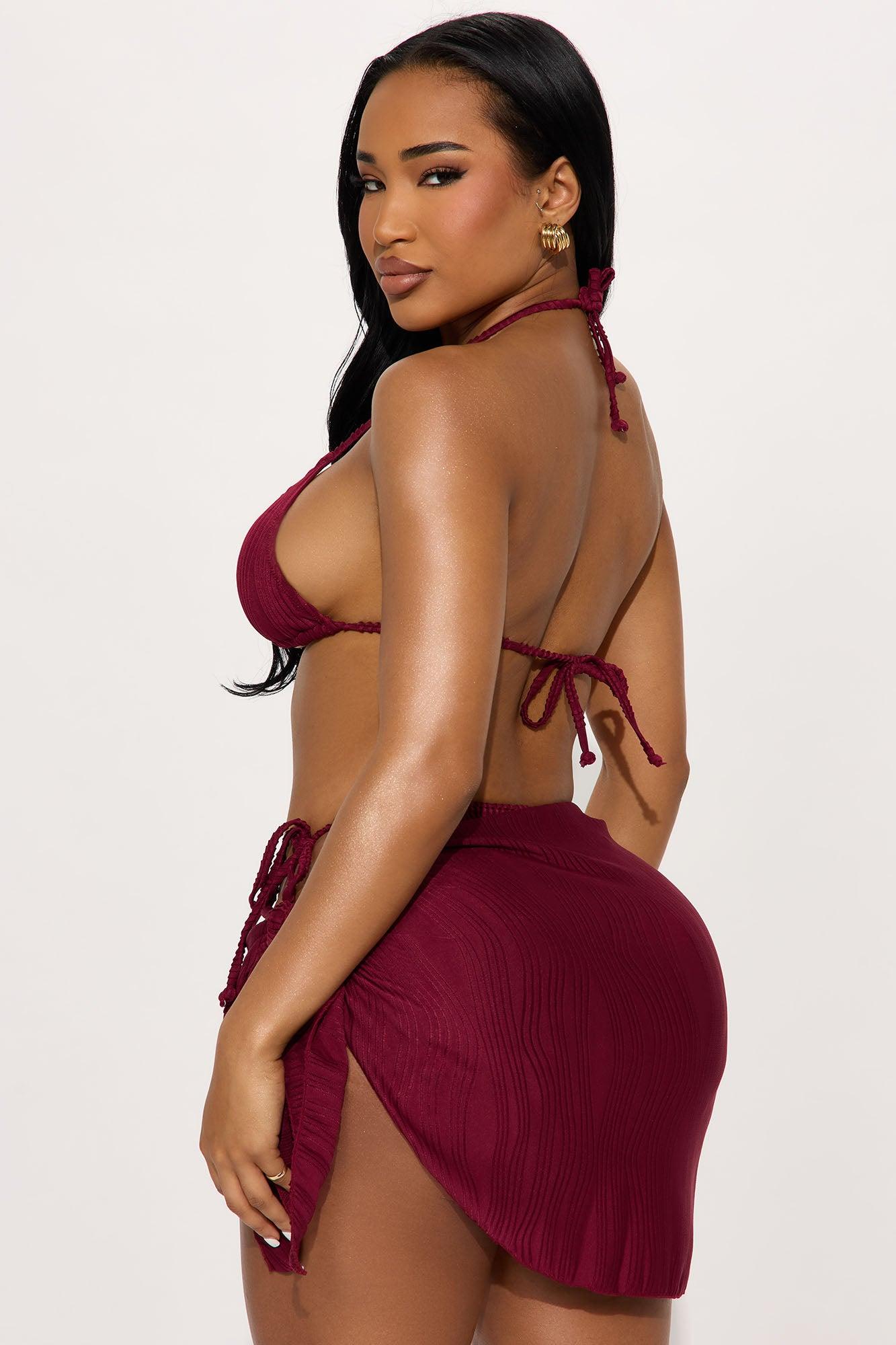 Available In Wine. 3 Piece Bikini Textured Triangle Bikini Top Removable Cups Hardware Pearl Strap Side Tie Bikini Bottom Cheeky Swim Cover Up Sarong Full Stretch Final Sale Shell: 92% Polyester 8% Elastane Lining: 90% Polyester 10% Elastane Imported