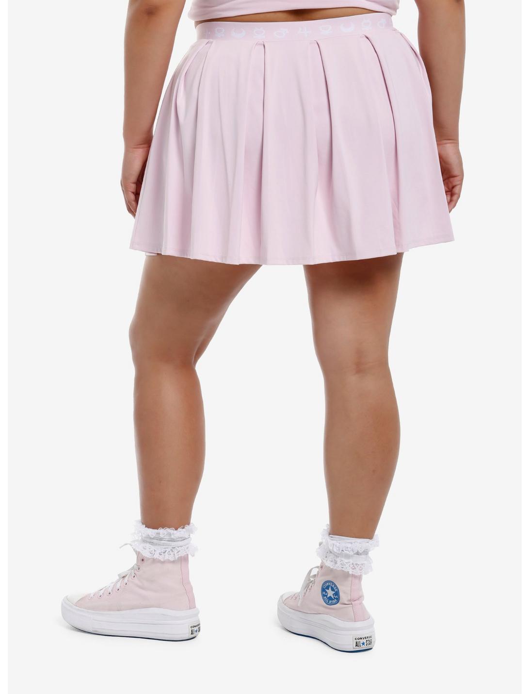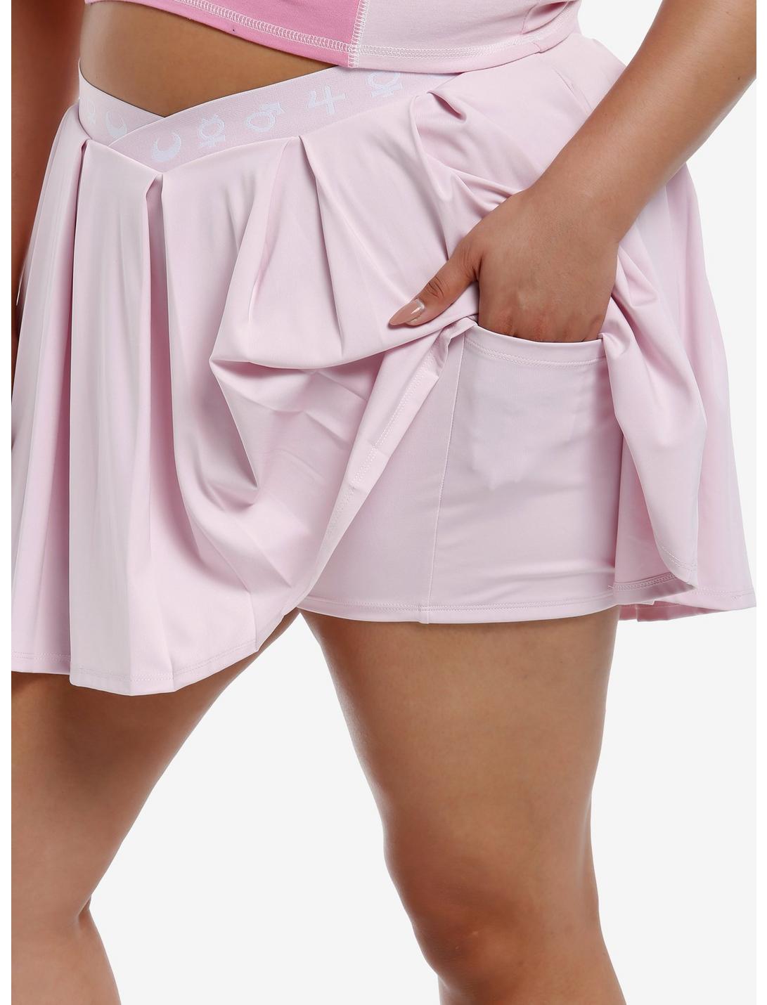 Fight evil by moonlight and look totally cute while doing it! This Sailor Moon skort comes in a pastel pink with a Cosmic Heart Compact printed at the skirt hem, and the Inner Sailor Guardian symbols embroidered all around the V-line waistband. There are pockets attached to the shorts underneath.80% polyester; 20% spandexWash cold; dry lowPocketsImportedModel is 5'10"Model wears size 1
