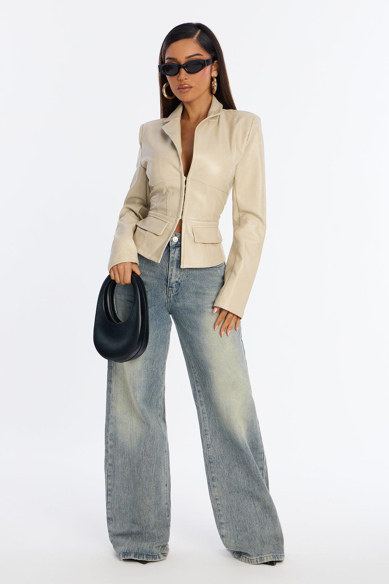 Available In Stone. Faux Leather Jacket Collar Neckline Long Sleeves Hook And Eye Closure Faux Pockets Fully Lined Self: 50% Polyurethane 50% Polyester Imported California Proposition 65WARNING: Cancer and Reproductive Harm - www.P65Warnings.ca.gov.