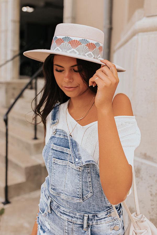 Add a pretty finish to any look with our beautiful light natural hued fedora featuring lightweight wool material, a stiff 3.5-inch brim, and a wide grey, dark blush, and blue scalloped print accent band! Hat Dimensions: Length- 15.5 Inches Width- 14.5 Inches Height- 4 Inches Cranial Circumference- 22.5 Inches