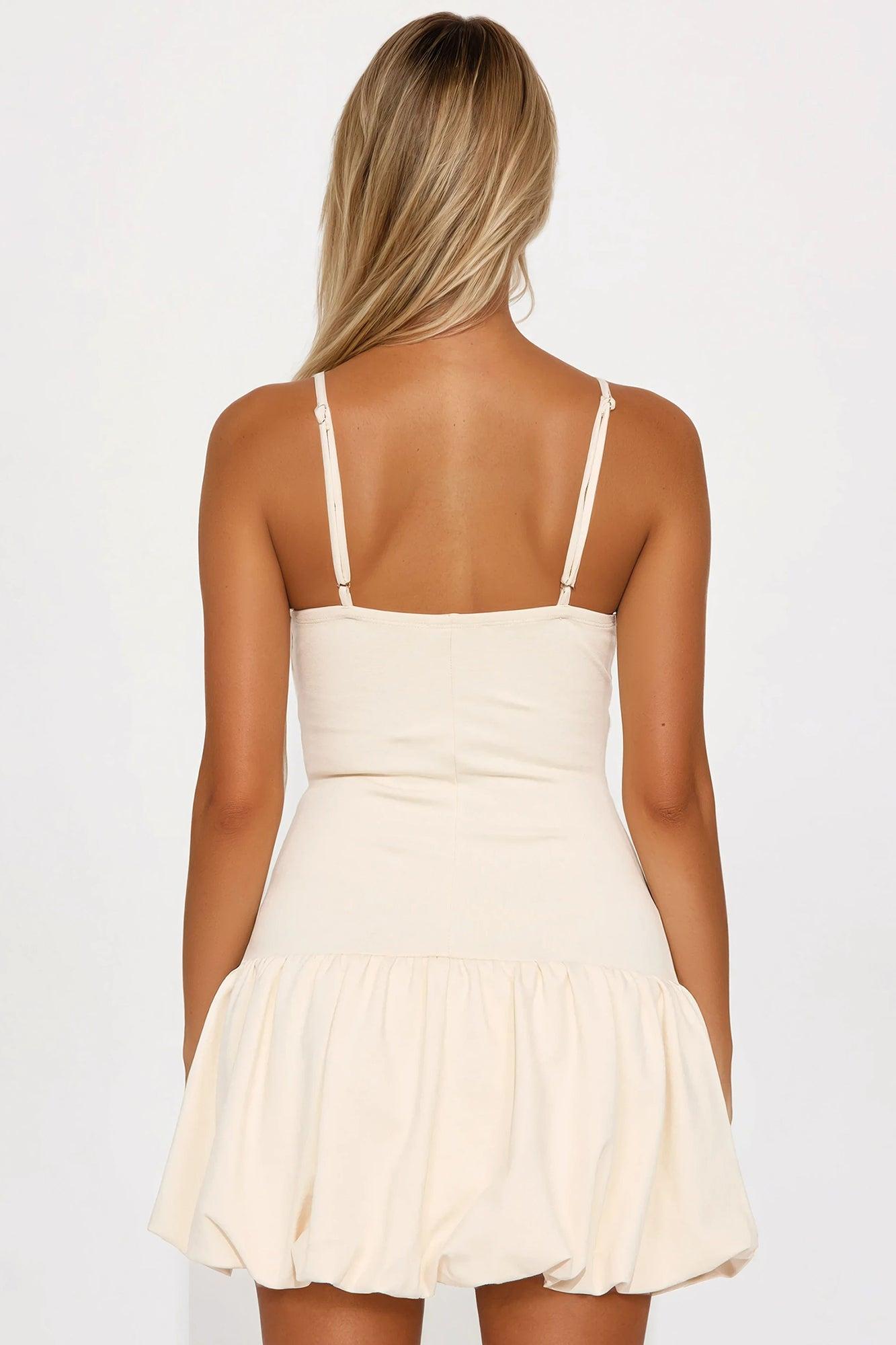 Available In Burgundy, Cream And Mauve. Bubble Mini Dress V-neck Adjustable spaghetti strap Bow detail Drop waist Bubble hem Built-in shorts Stretch Length measured flat = 32" Self: 68% Rayon 28% Nylon 4% Spandex Lining: 100% Polyester Imported
