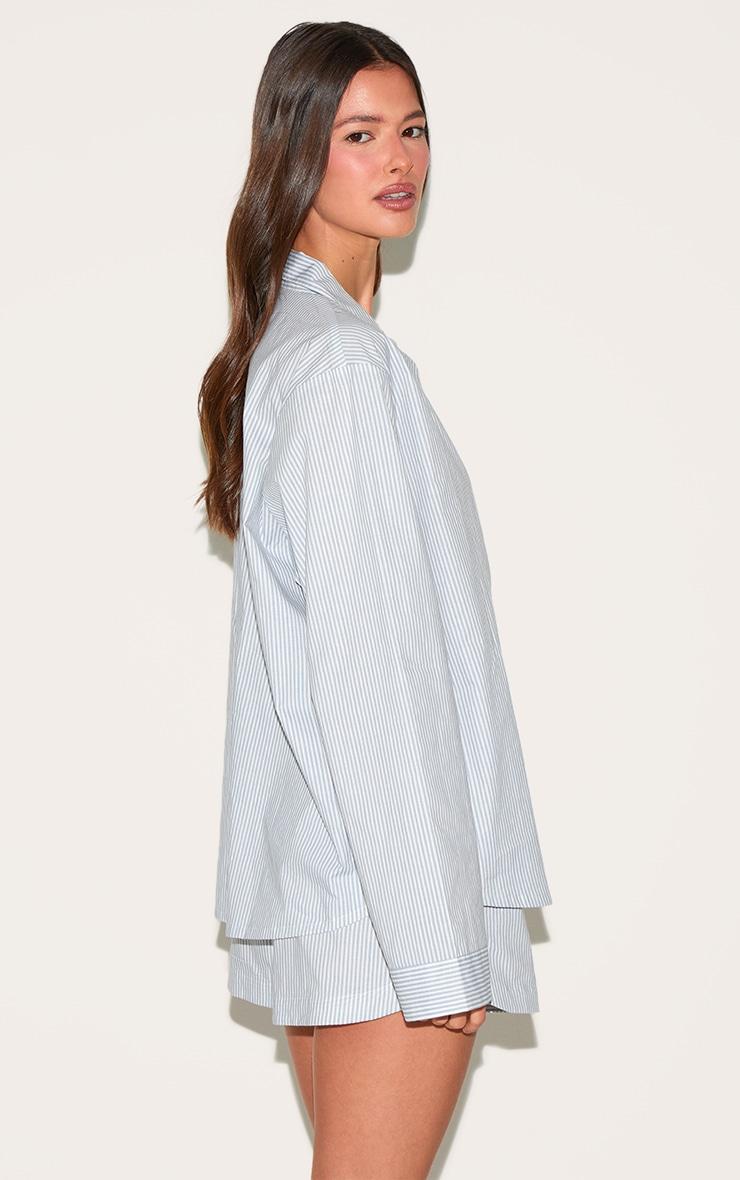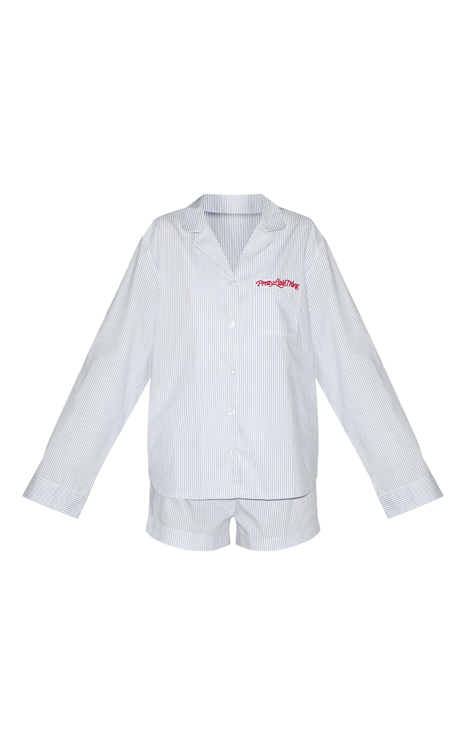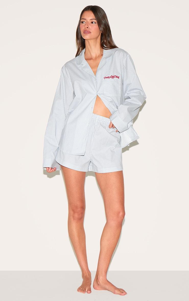 Off-duty moments call for pieces as considered as your main rotation. Settle into the PRETTYLITTLETHING Embroidered Blue Stripe Oversized Shirt and Short PJ Set, your elevated uniform for relaxed days. This two-piece features a crisp blue stripe design on a generously cut oversized shirt, finished with a classic collar, full button fastening, and signature red PrettyLittleThing embroidery on the chest pocket, paired with simple co-ordinating pull-on shorts. Keep the vibe effortlessly cool styled with a cosy robe and simple slides for ultimate downtime style. Top length approx 48cm/19inch Bottoms length approx 33cm/13inch (Based on sample size S)Model wears size SModel Height - 5ft 7inchp]:!mb-4inch>Brand: PrettyLittleThingCategory: Lingerie & NightwearProduct type: Short PJ SetColor: BlueMaterial: Cotton JerseyDesign: PrintSleeves: Long