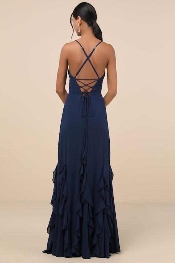 The Lulus Priela Dark Navy Ruffled Lace-Up Maxi Dress always guarantees picture-perfect memories! This gorgeous gown has a chiffon woven fabrication that shapes a sweetheart neckline and a bustier-style bodice with pleated, seamed cups. The stunning A-line skirt boasts cascading ruffles that fall to a sweeping maxi hem. Adjustable spaghetti straps support the event-ready silhouette, crisscrossing the open back atop an alluring lace-up design. Hidden back zipper/clasp.