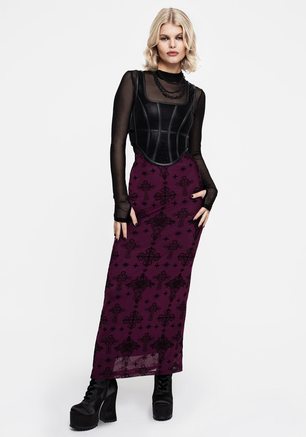 Your prayers have been answered- Purple crucifix flocked velour print mesh maxi dress - Body-conscious fit in comfortable stretch fabric - Elasticated waistband & maxi-length skirt - Stretchy sheer mesh fabrication in a rich purple with flocked ornate crucifix design - Solid stretch midaxi-length lining - Worthy of worship 92% polyester, 8% elastane