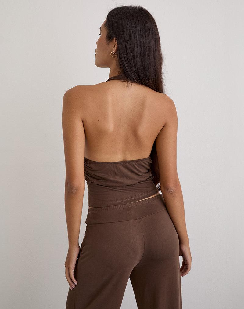 The Prilla top in a dark brown cupro fabric features a halterneck design with an open back and a low-scooped V-neckline. Finished with underbust ruching and a waist seam. Complete the set with matching Donata trousers in cupro dark brown. MODEL WEARS SIZE:EXTRA SMALL - MODEL HEIGHT:5'7