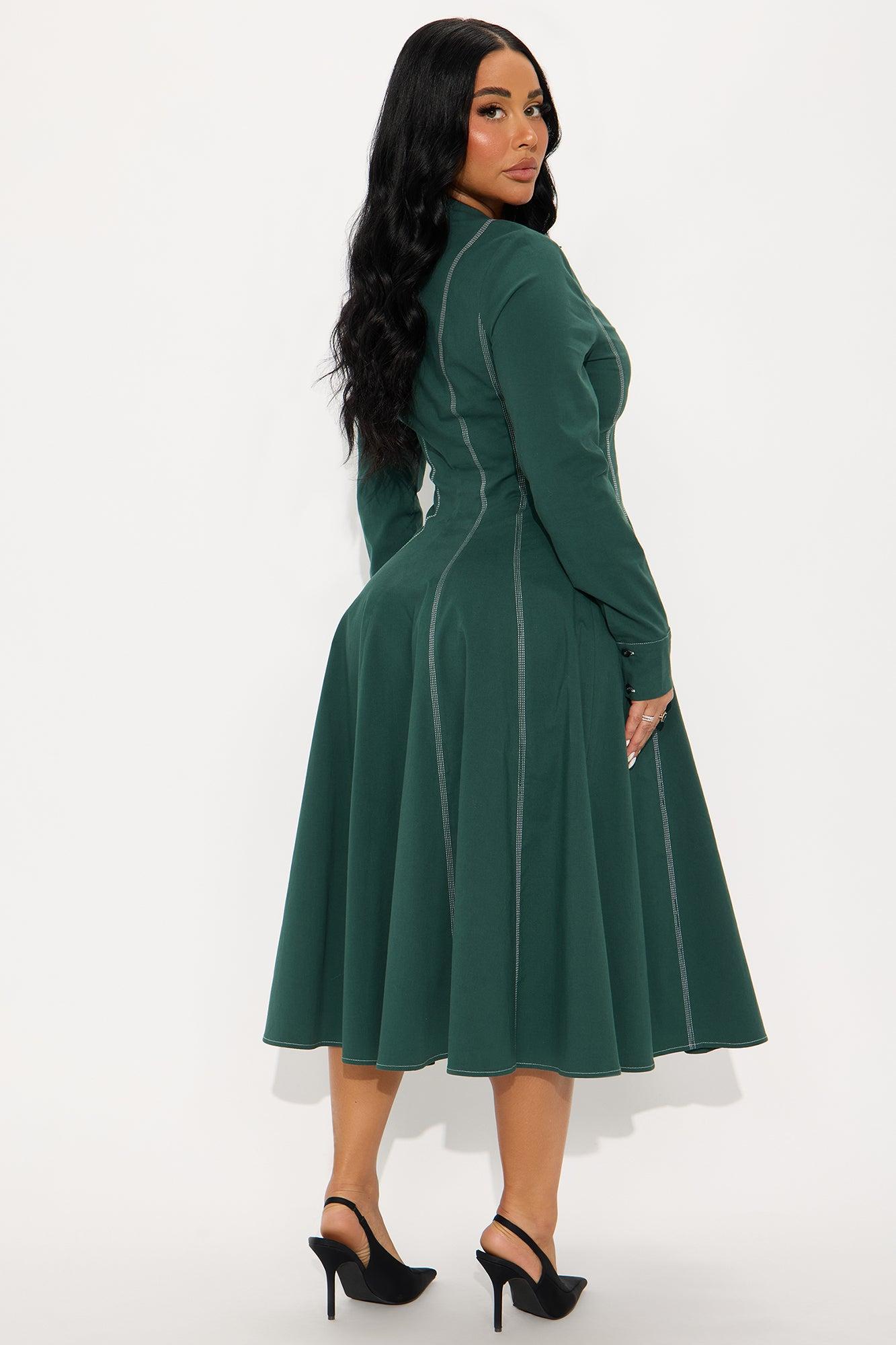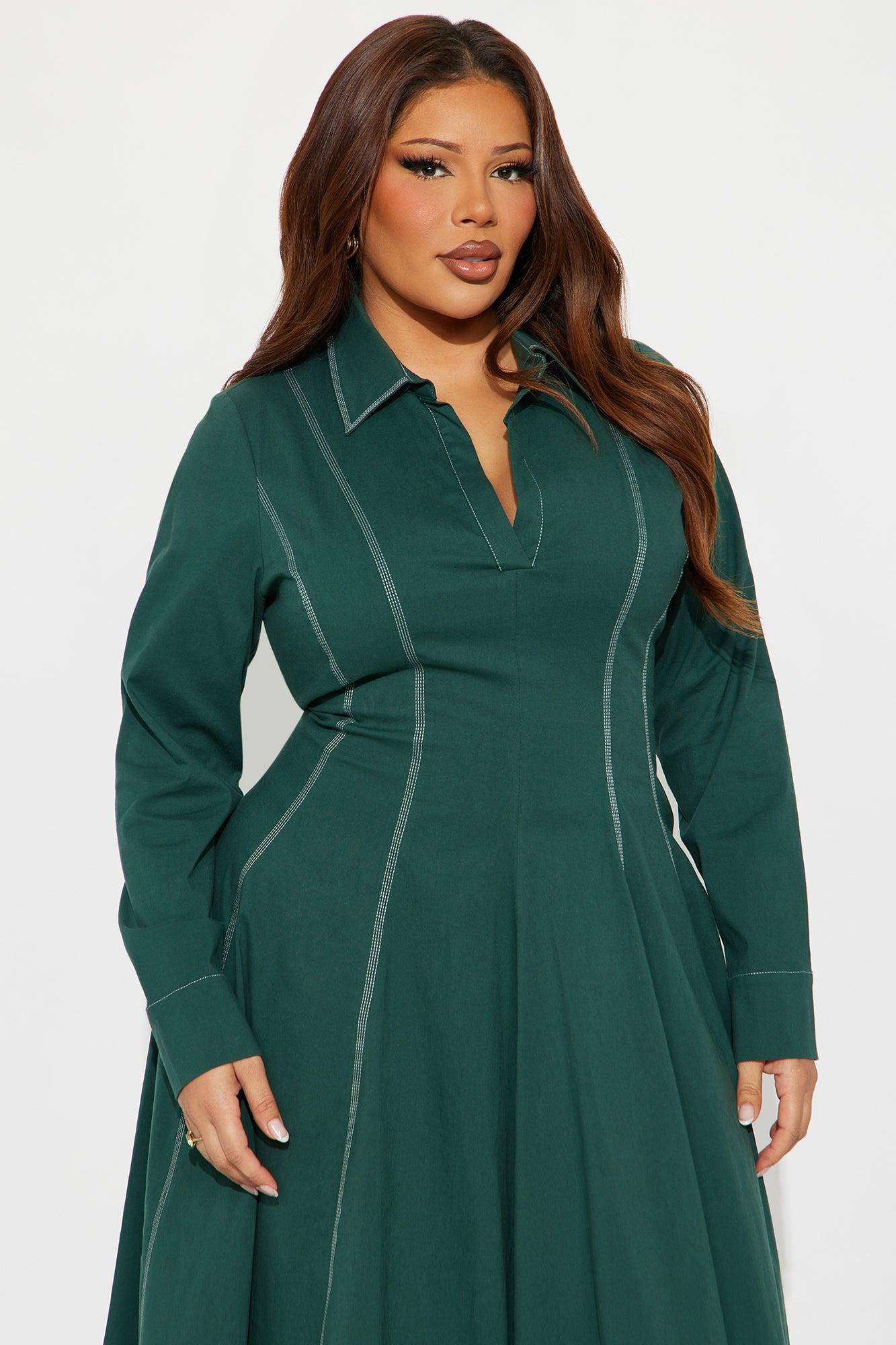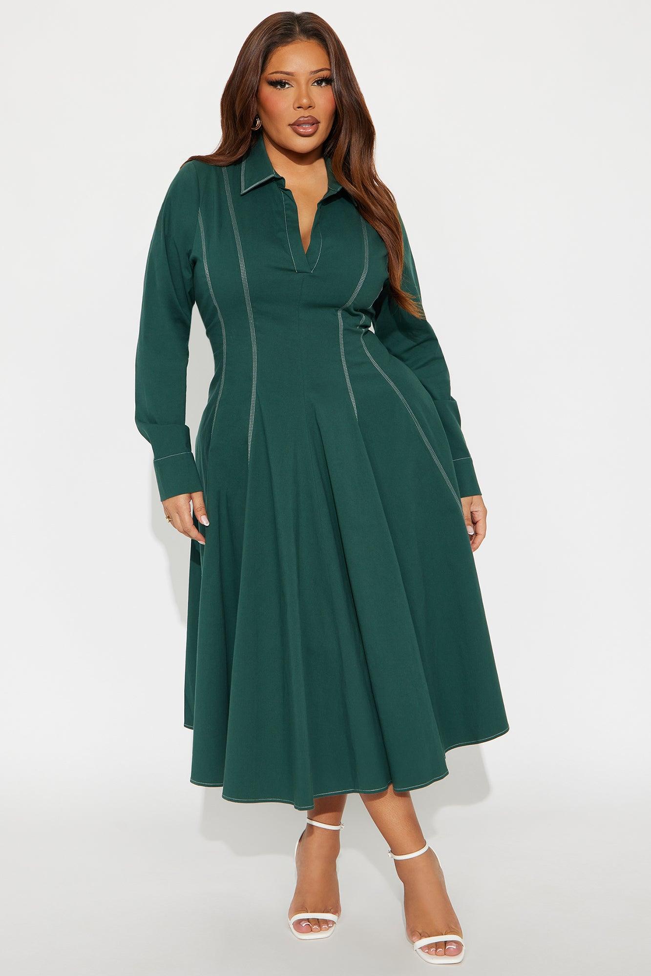 Available In Chocolate And Hunter Green. Midi Dress Collar neckline Short Sleeves Pleated Stretch Length measured flat = 44" Self : 97% Cotton 3% Spandex Imported California Proposition 65WARNING: Cancer and Reproductive Harm - www.P65Warnings.ca.gov.
