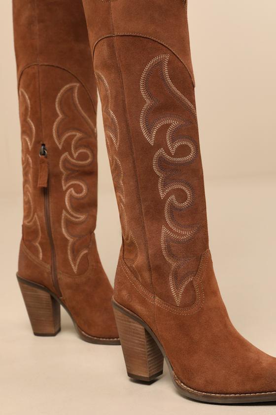 Saddle up for a boot, scoot, and boogie in these classic Western boots by Dingo, crafted from genuine suede leather with iconic stitching throughout for authentic flair. The tall silhouette features a pointed-toe upper, a seamed vamp, and a curved topline with internal pull tabs at either side. Convenient zipper at the instep allows for easier on-and-off, while a wood-look block heel completes the look.