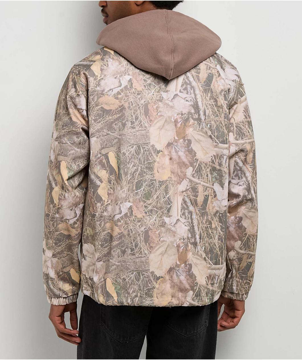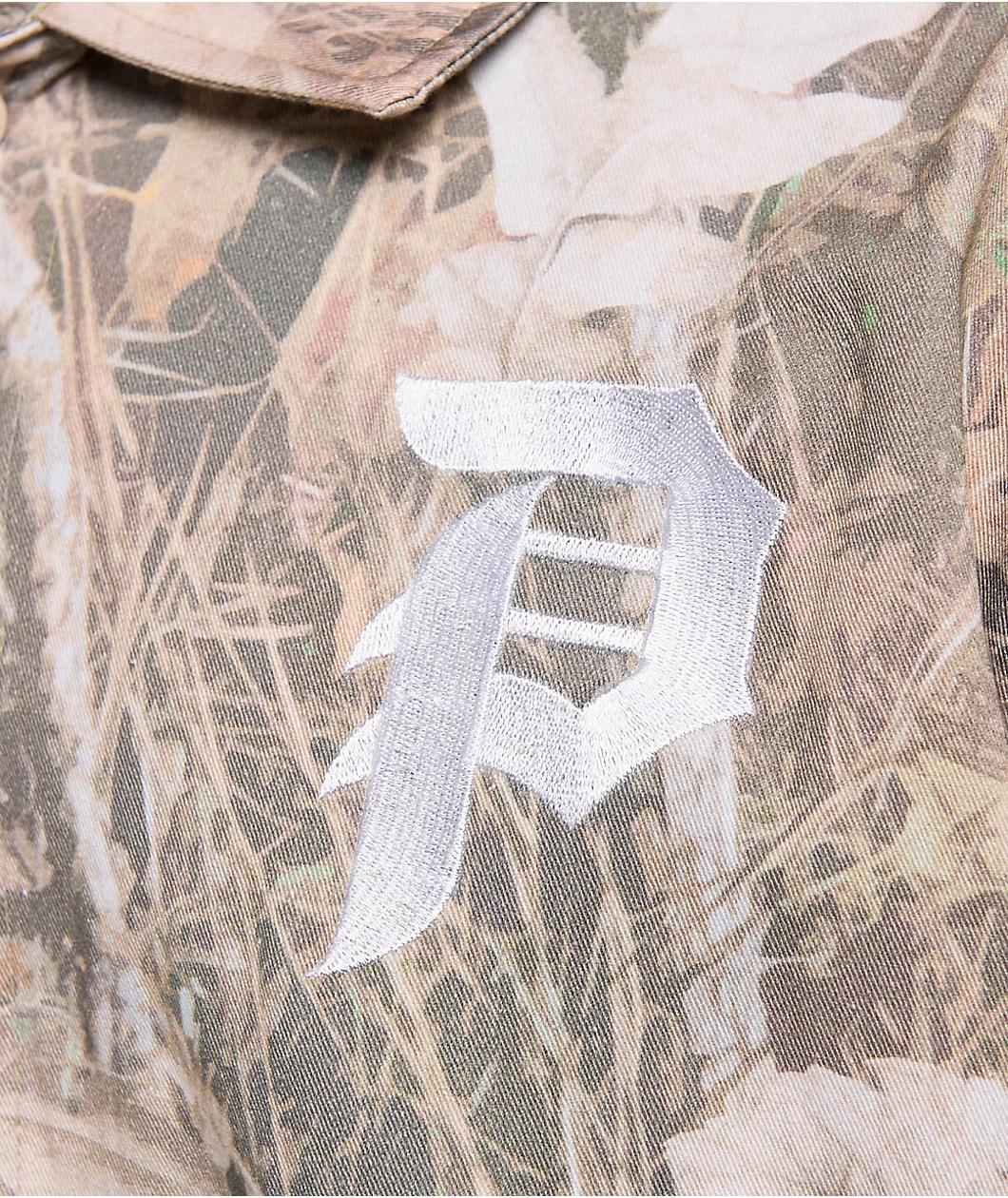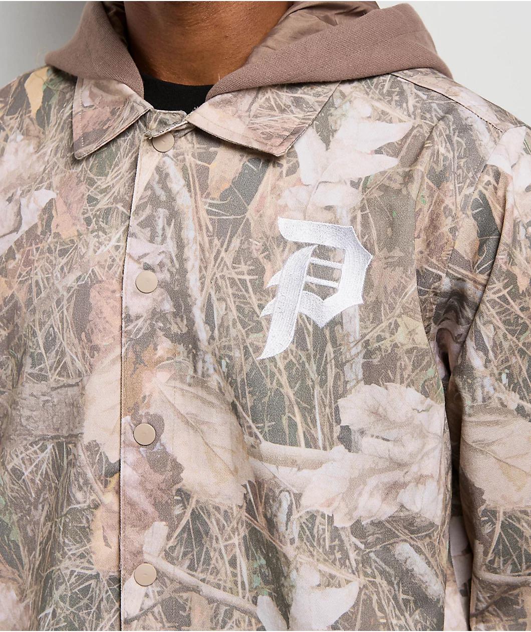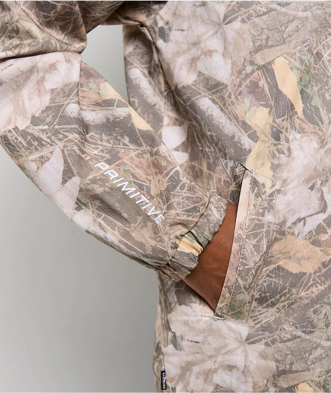 Stay warm in skate style with the Carter coaches jacket from Primitive Skateboards, featuring a unique forest-camouflage pattern throughout and a layered 2fer construction with an attached hood. Adorned on the left chest with an iconic "Dirty P" logo