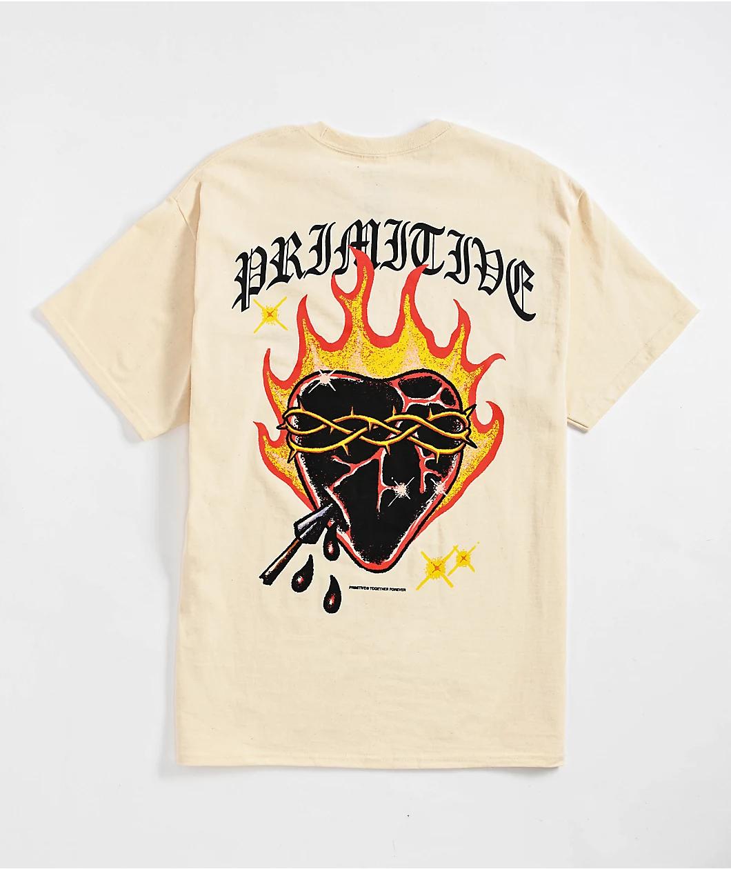 Using influences from classic traditional tattoo artists, the Flames t-shirt arrives from Primitive in a muted beige cream color, offering screen-printed images on the left chest and back.