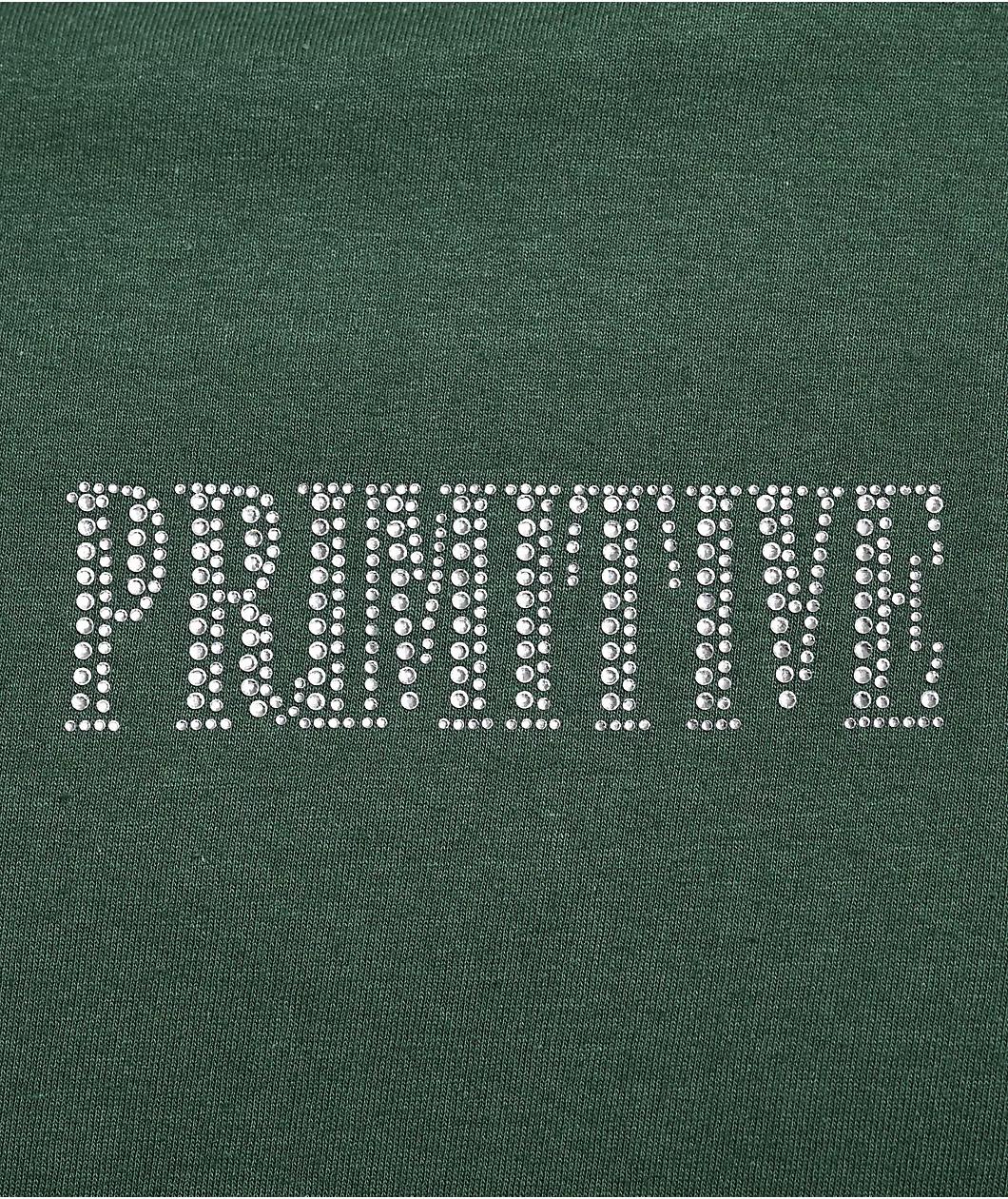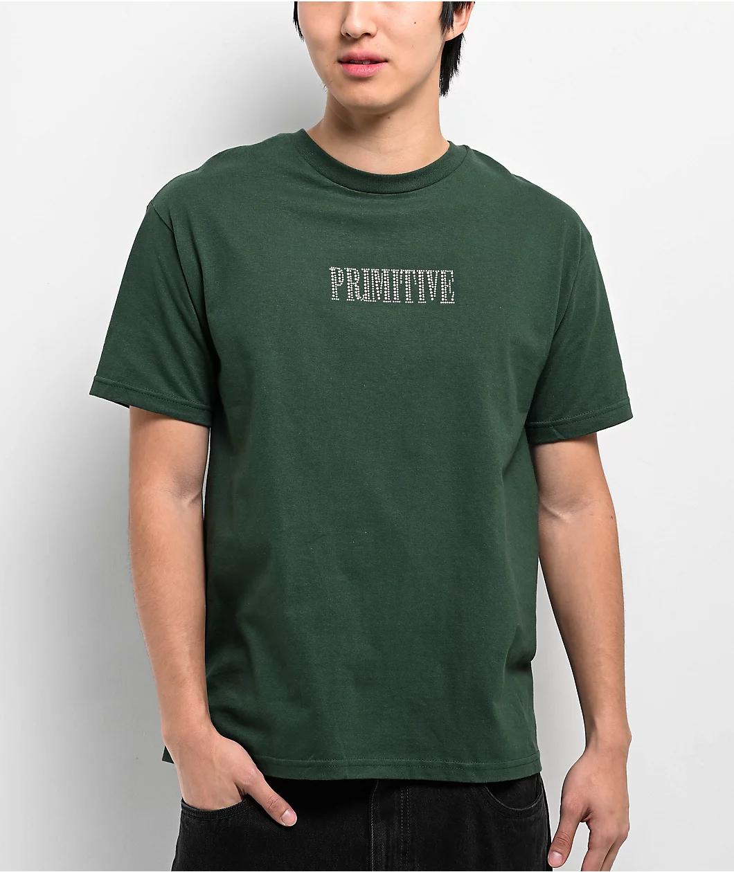 Landing in a "Forest" green build with opulent rhinestone detailing on the front and back, Primitive offers the Magic Dirty P t-shirt in a classic silhouette for a streetwear look. Adorned on the front with capitalized branding centered on the chest,
