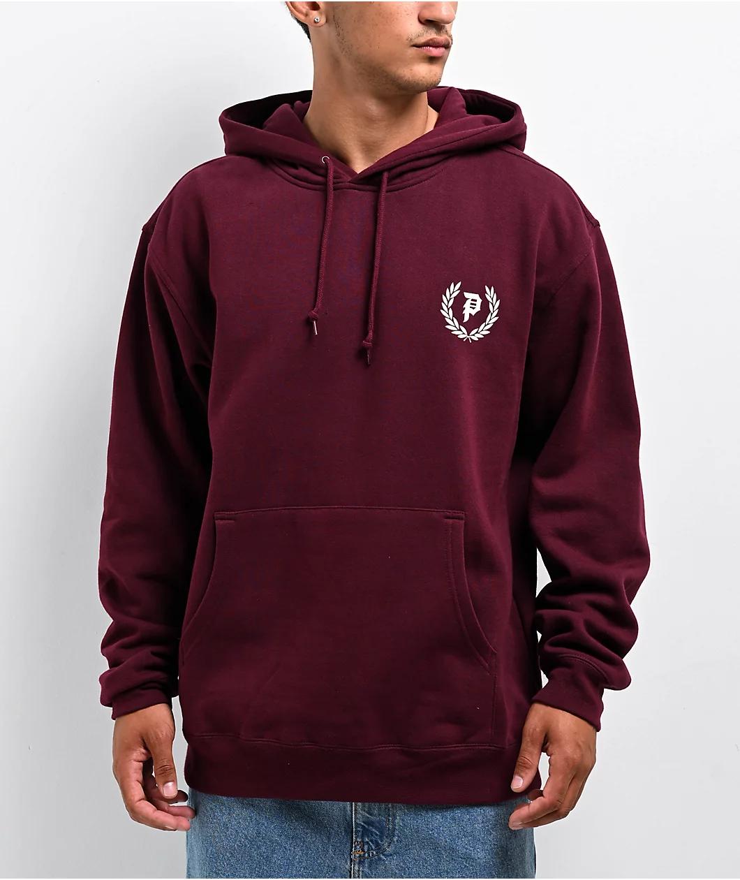 Made from a soft cotton blend in a maroon red hue, Primitive offers the Redemption hoodie with screen-printed branding on the left chest and a detailed graphic on the back. Utilizing a "Dirty P" logo with a leafy frame on the front, the back features
