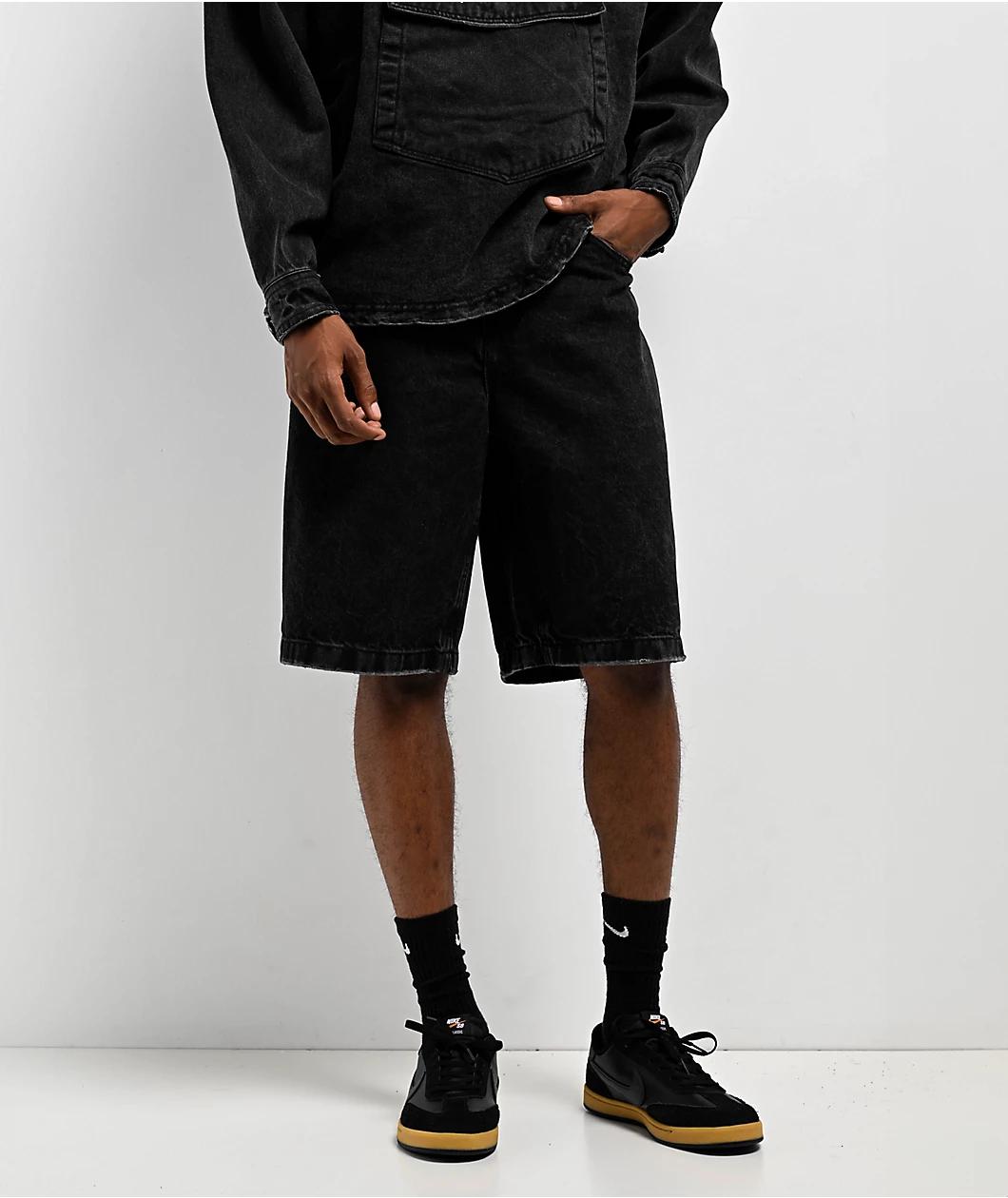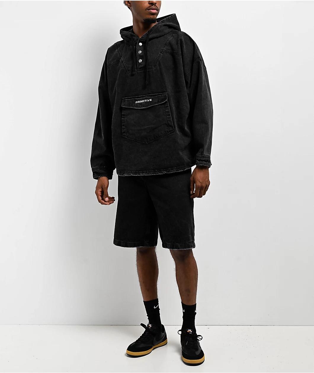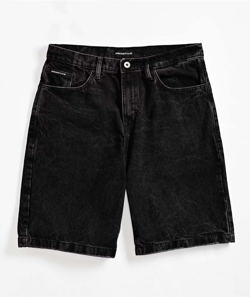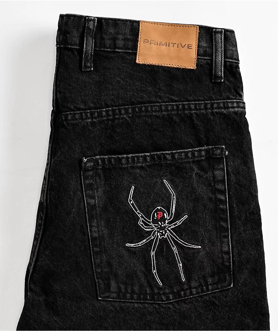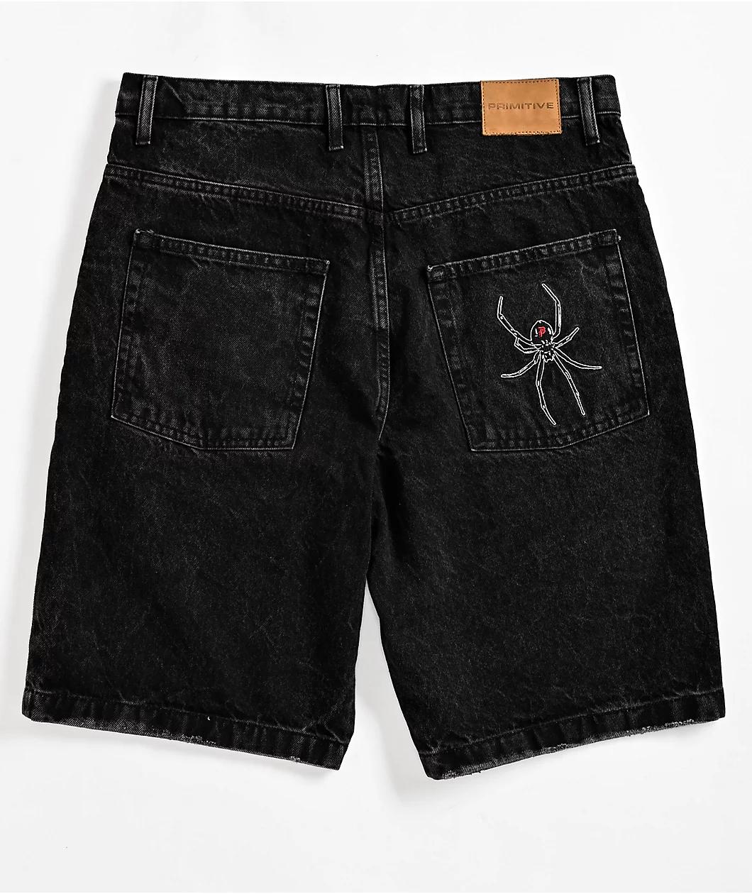 Made from a 13oz cotton denim by Primitive Skateboards, the loose-fitting Temptation shorts land in a washed black color scheme for a worn, vintage look. The dark jorts employ an embroidered Black Widow graphic on the right seat pocket in a contrasti