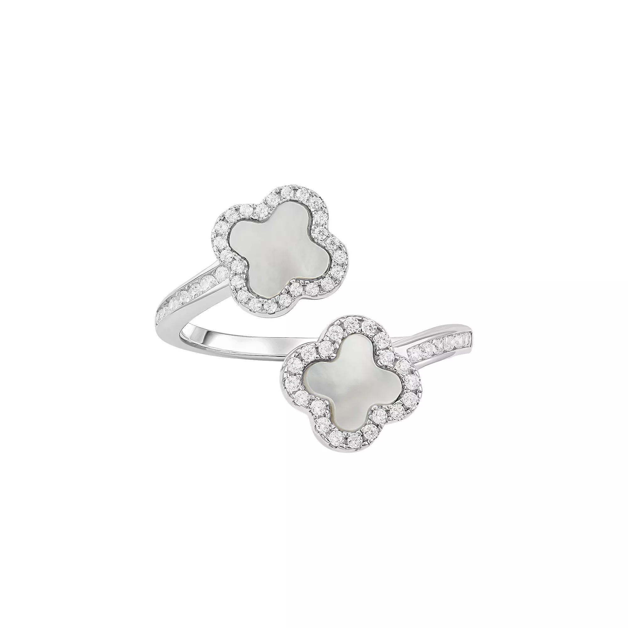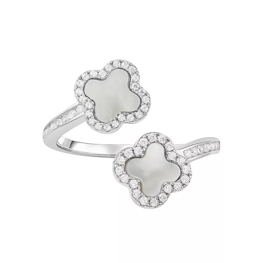 Accessorize in style with this PRIMROSE fine silver plated cubic zirconia & mother-of-pearl double clover bypass ring. Click on this JEWELRY & WATCHES GUIDE to learn about fit, styles, materials and more! Accessorize in style with this PRIMROSE fine silver plated cubic zirconia & mother-of-pearl double clover bypass ring. Click on this JEWELRY & WATCHES GUIDE to learn about fit, styles, materials and more! FEATURES Width: 16 mm Shank style: bypass Band fit: comfort fit Nickel free Metal: brass Plating: silver tone Finish: polished Packaging: decorative card Mother-of-pearl accentsSTONE DETAILS Stone type: cubic zirconia Shape: round Setting: channel, pave Gemstones may have been treated to enhance their appearance. Special care may be required. Please visit our Gemstone Treatment & Special Care Guide for more information. Size: 9. Gender: female. Age Group: adult.